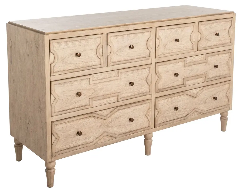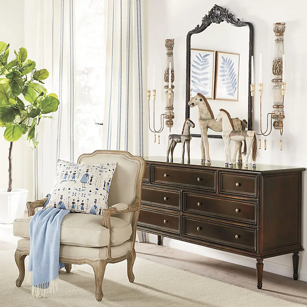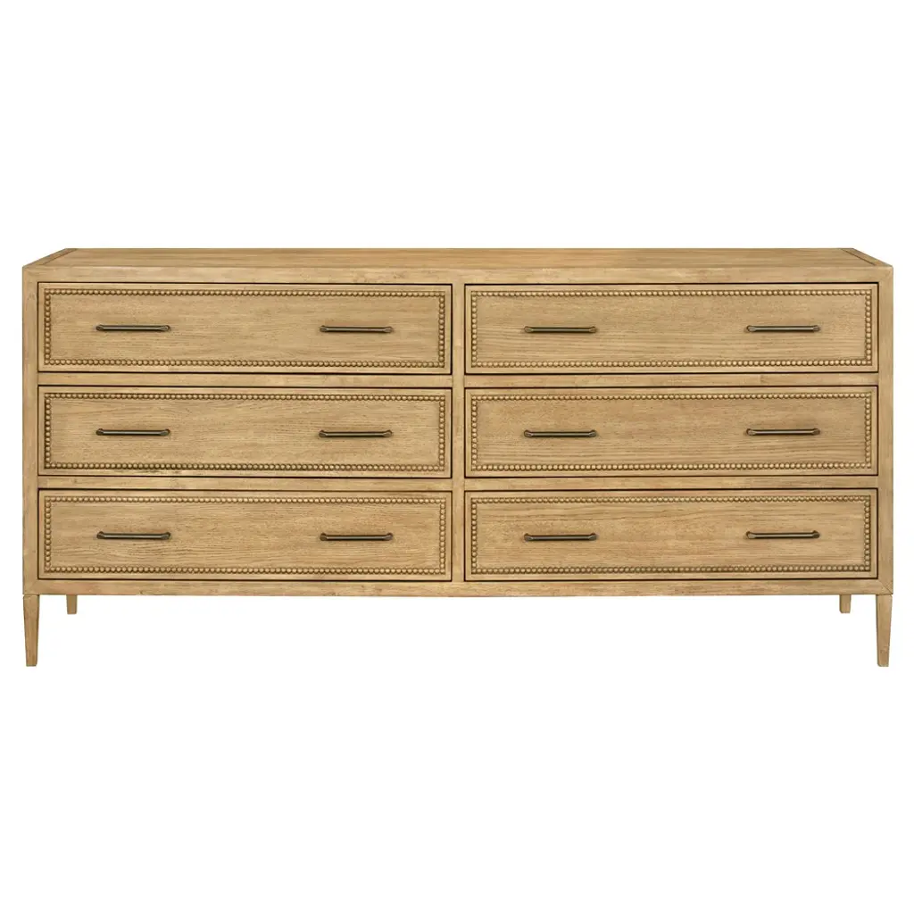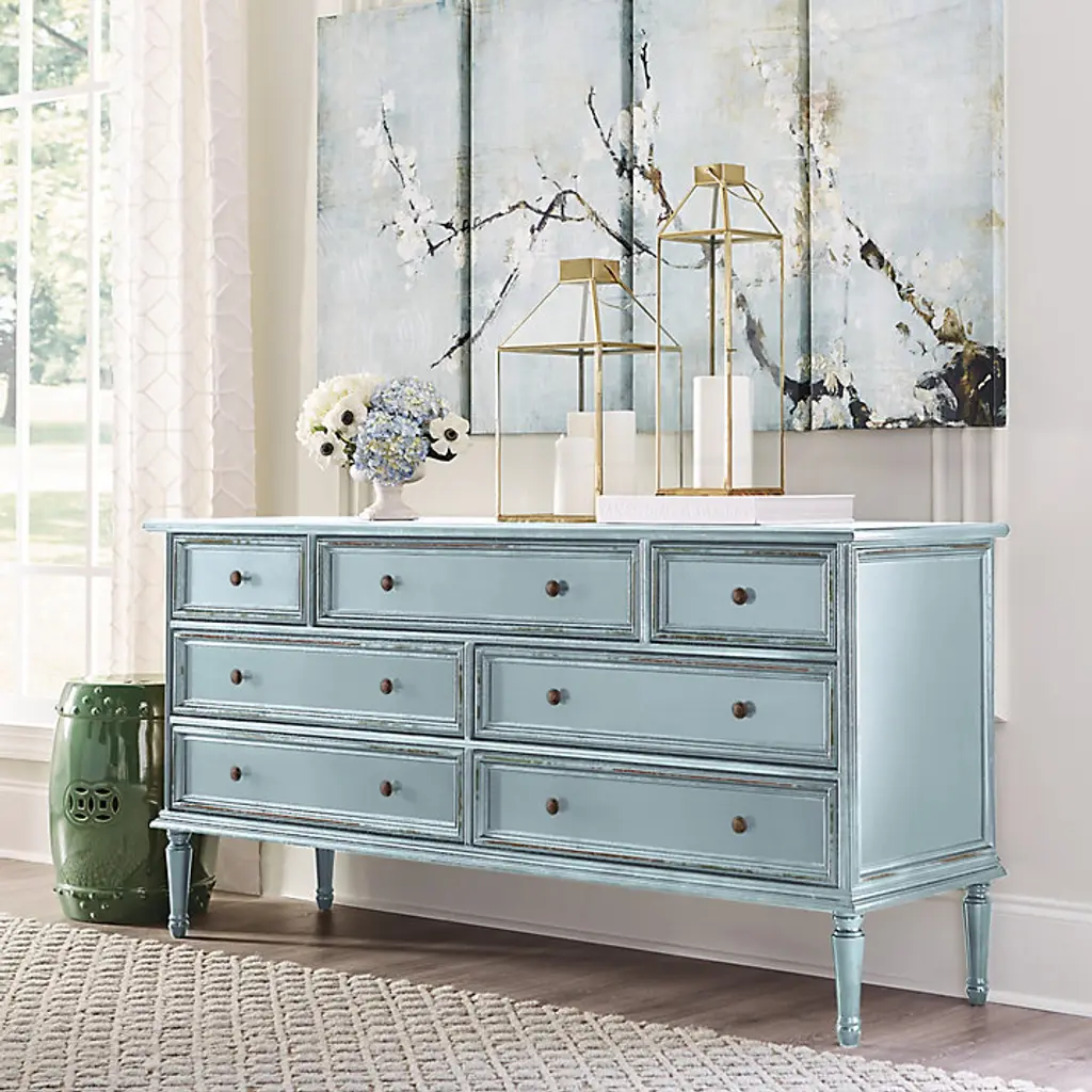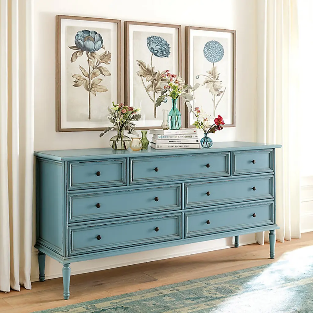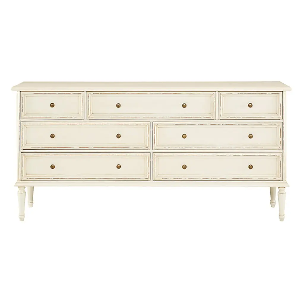 Our Emile Dresser embodies classic Louis styling. Seven richly molded drawers are wide and deep enough to hold an entire wardrobe of folded shirts, sweaters, pants and delicates. Fluted Side rails and overhanging ogee edge top are supported with elegantly turned vase-and-ring legs. This grand double dresser coordinates with the Emile Collection, so you can create a coordinated bedroom suite. Part of our exclusive Casa Florentina collection, the finishes are hand applied by Italian artisans using the same simple tools and techniques employed by Florentine artists for centuries. Casa Florentina Emile Dresser features: