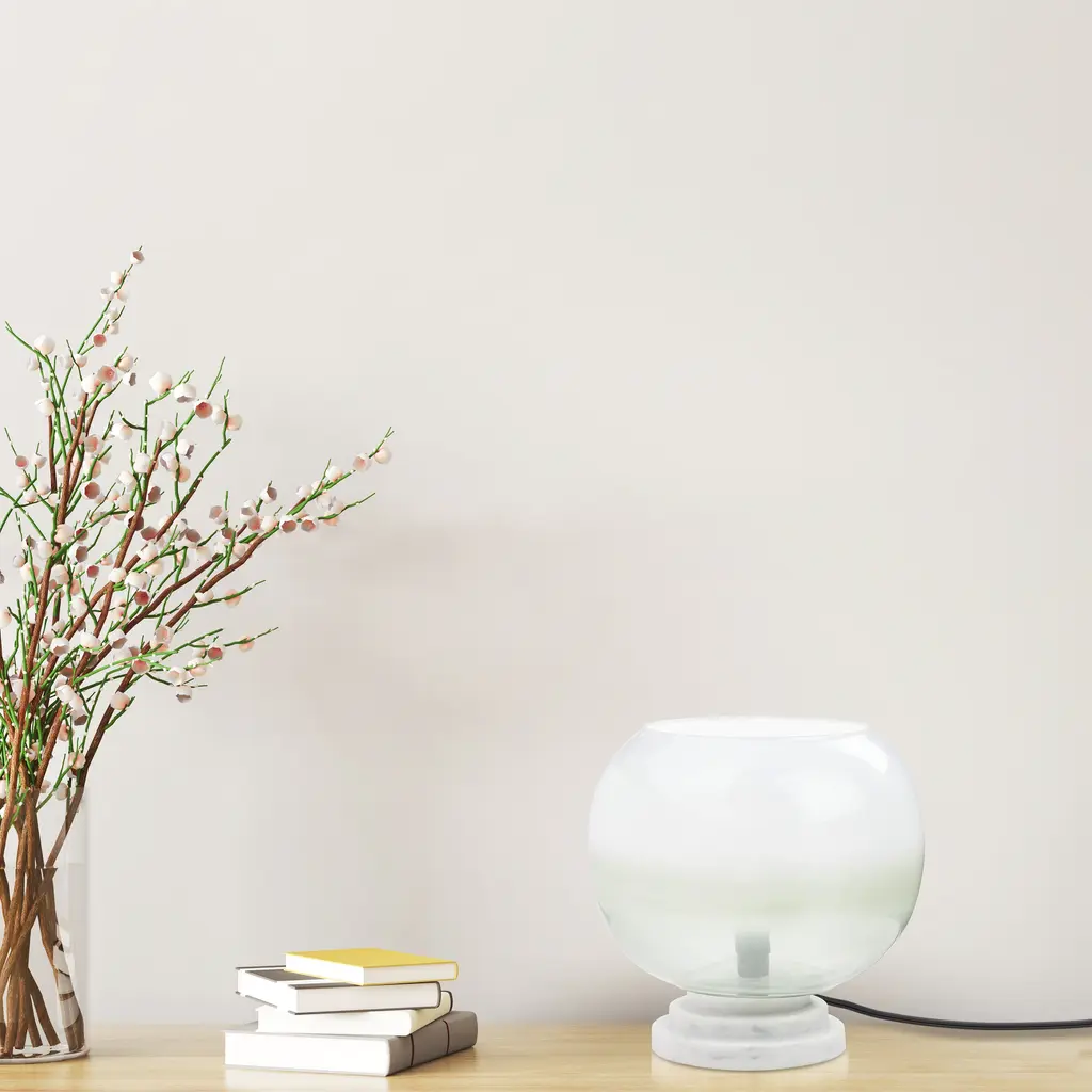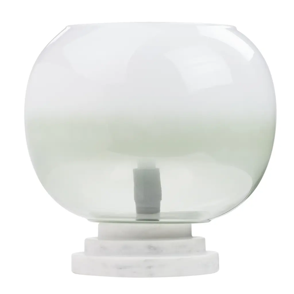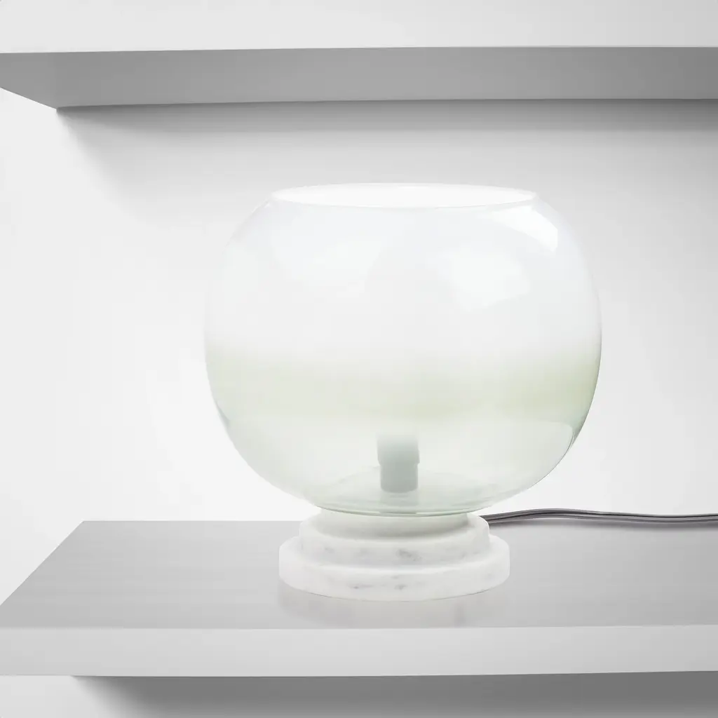 Introduce a touch of nautical-coastal style to your space with this green and white ombre accent lamp. This chic lamp features a uniquely beautiful handcrafted blown glass globe shade that gently diffuses light, creating a warm and inviting ambiance in any room. Resting on a stacked white marble base, this lamp blends elegance and modern design, making it a stunning accent piece on a bedside table, desk, or living room side table. Its multi-directional light direction ensures a good spread of light, perfect for adding ambience to any space. Comes with an on-off line switch for easy operation.