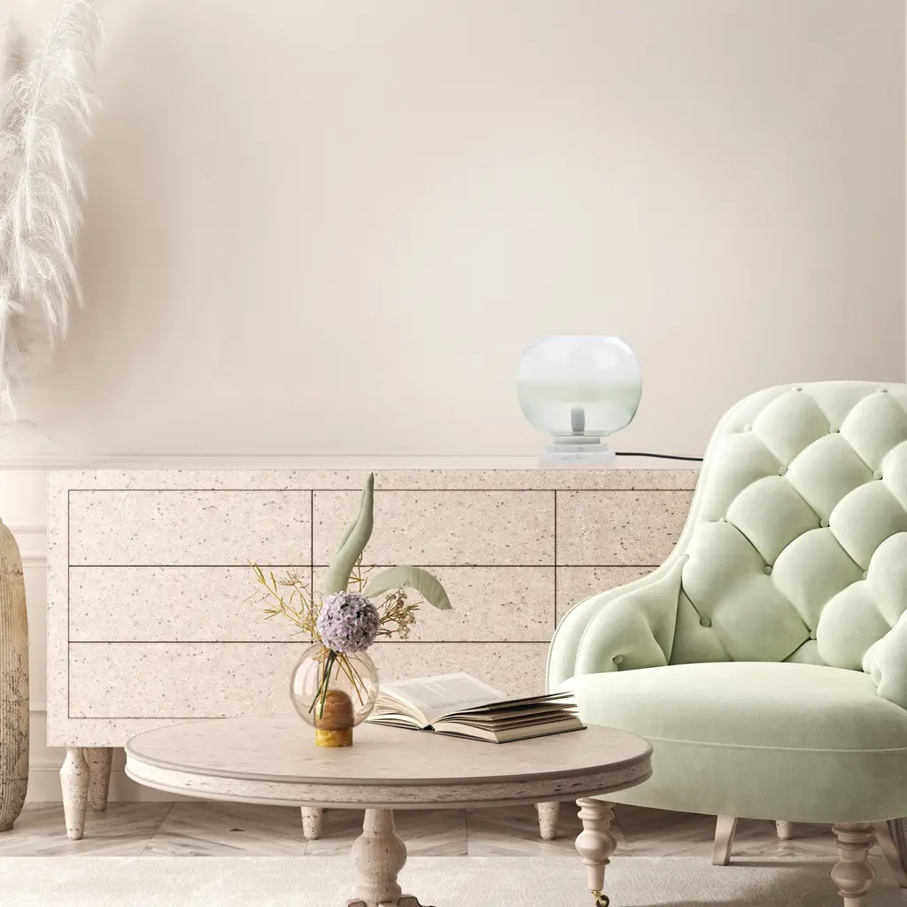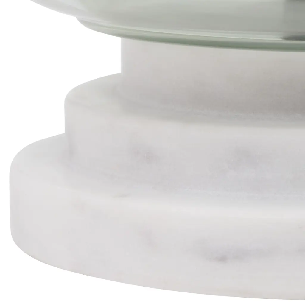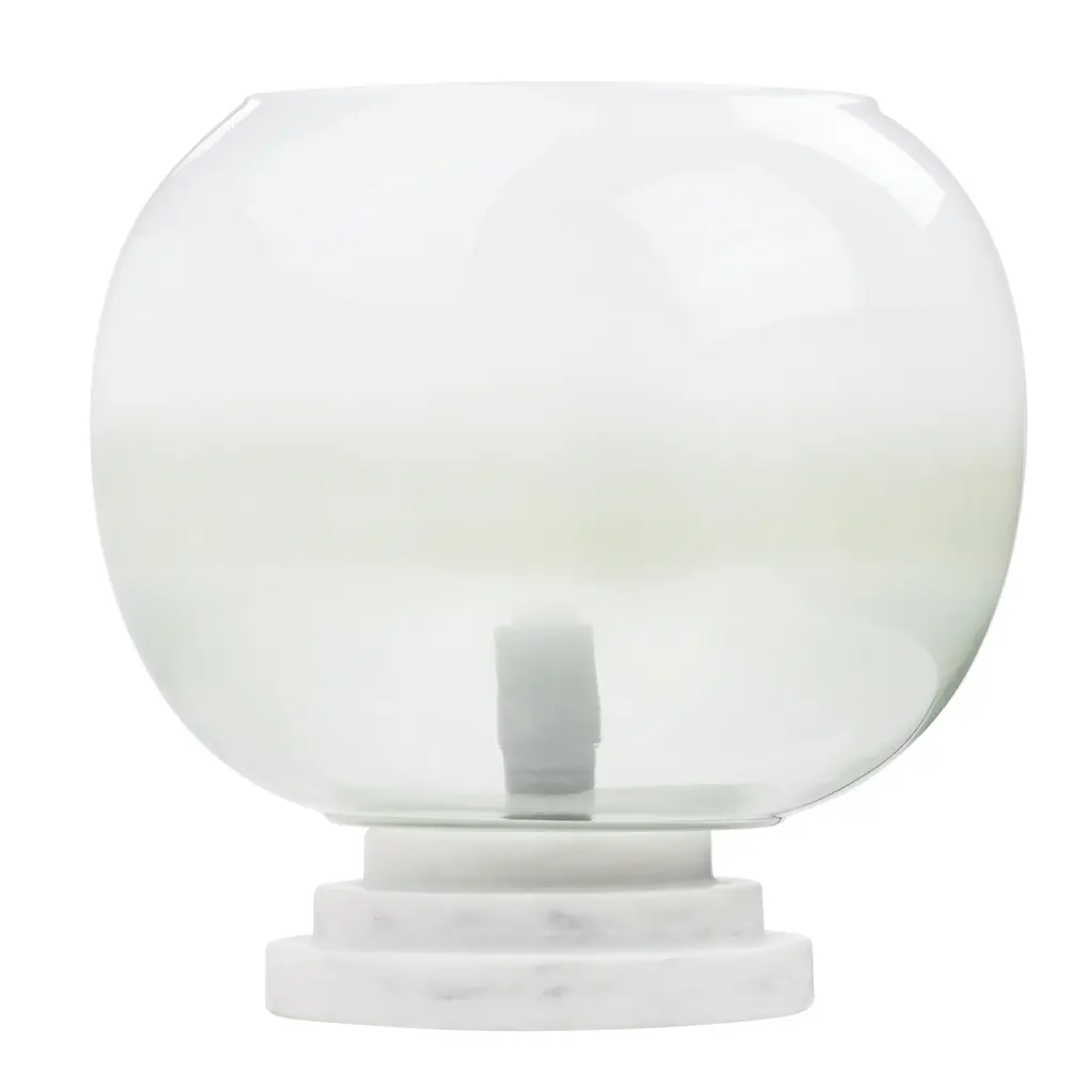 Introduce a touch of nautical-coastal style to your space with this green and white ombre accent lamp. This chic lamp features a uniquely beautiful handcrafted blown glass globe shade that gently diffuses light, creating a warm and inviting ambiance in any room. Resting on a stacked white marble base, this lamp blends elegance and modern design, making it a stunning accent piece on a bedside table, desk, or living room side table. Its multi-directional light direction ensures a good spread of light, perfect for adding ambience to any space. Comes with an on-off line switch for easy operation.