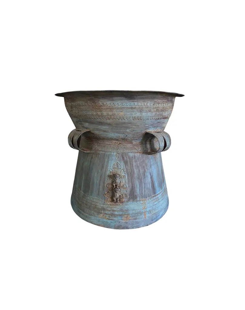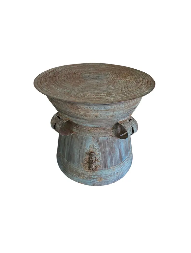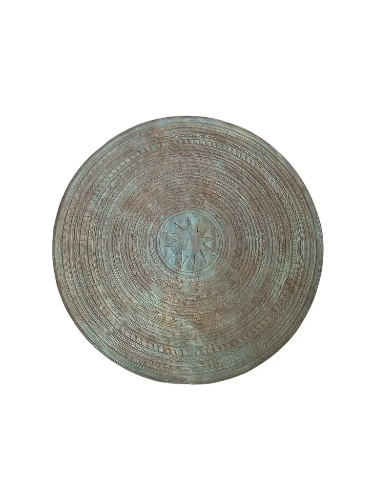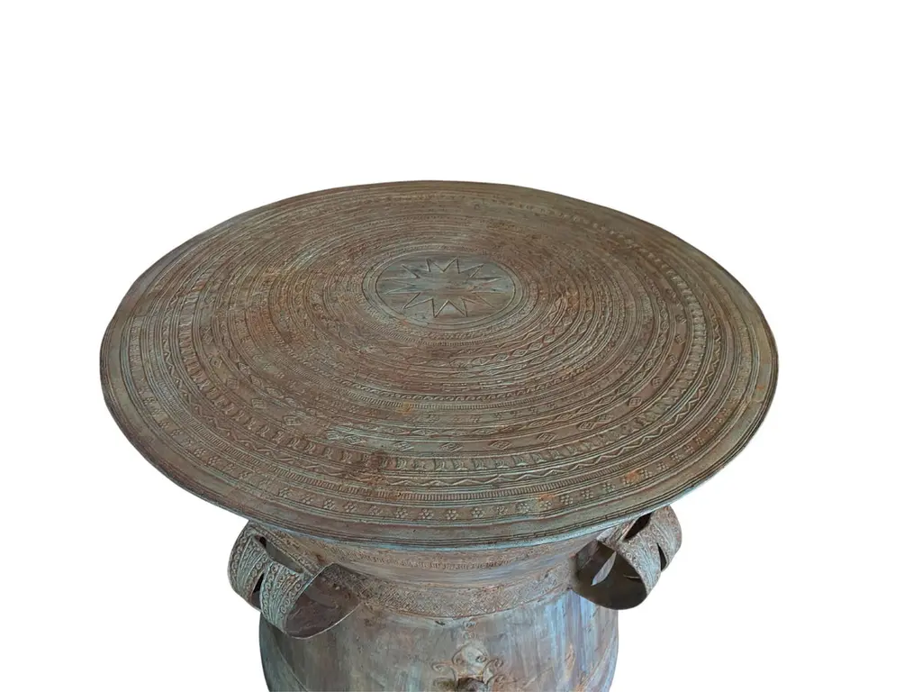 This cast iron bronze drum is inspired by the rain drums of South East Asia, particular those found in Burma, Laos and some of the Eastern Islands of Indonesia. This drum features three engraved handles. There are elaborate engravings on its sides as well as its top side. These engravings feature banded rings, on the top side the banded rings are entered by a star motif. The top of the drum measures 60cm in Diameter. A wonderful versatile piece that is a wonderful sculptural piece, that also functions as a side table. This cast bronze drum also features 2 pairs of frogs on opposing sides, frogs are often symbolised on rain drums as frogs come out of hibernation once the rainy season begins. Given this, these drums are sometimes called frog drums. Rain drums such as this one are cherished for the elaborate detail and decorations. To achieve its its colour and texture the drum underwent a chemical process. After the it is cast, a flame torch is used to heat the bronze. While being exposed to the flame torch the bronze surface is brushed with liquid salt solutions consisting of nitrates, acetates and sulphides resulting in a wonderful patina finish with a mix of shades and textures.