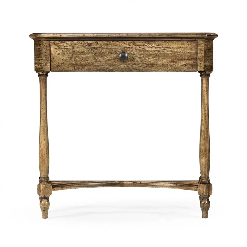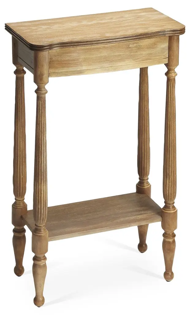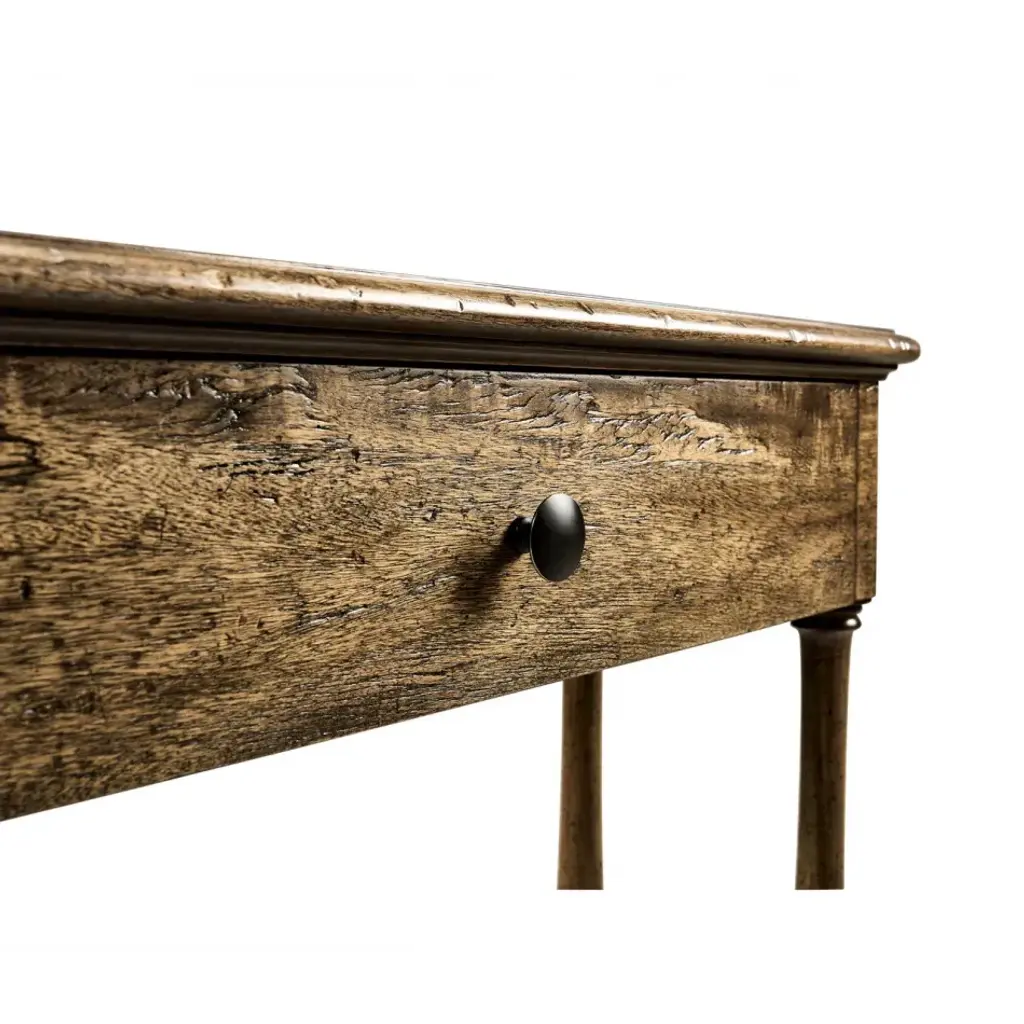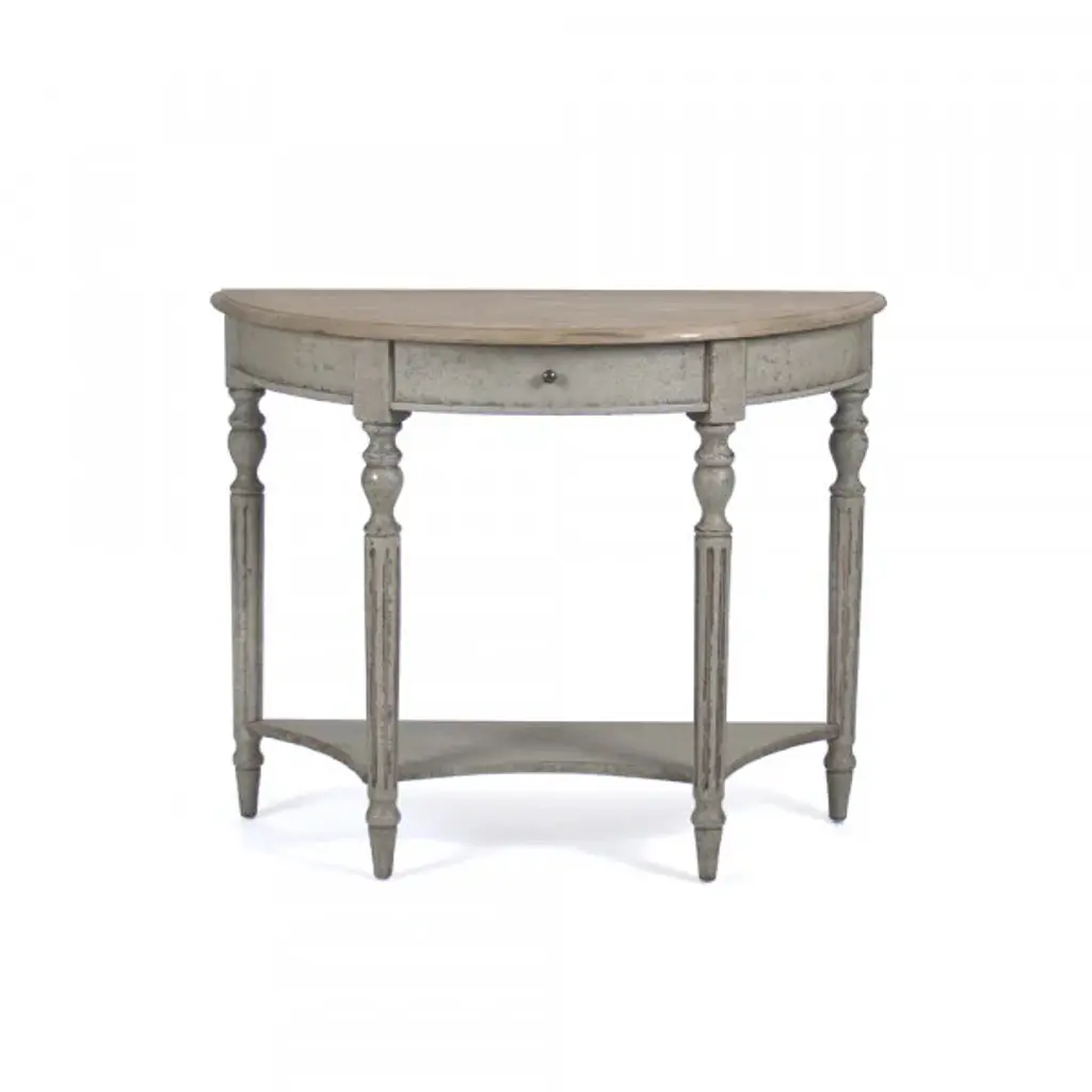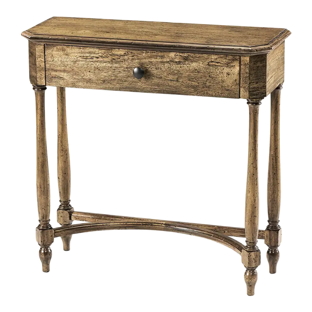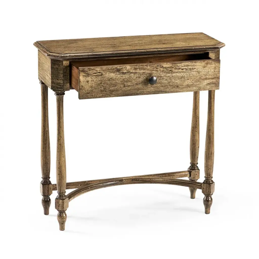 491017-DTM Victorian style console table in a medium driftwood finish with one drawer, baluster legs and a curved intersecting stretcher. Perfect for an entryway or hallway accent.