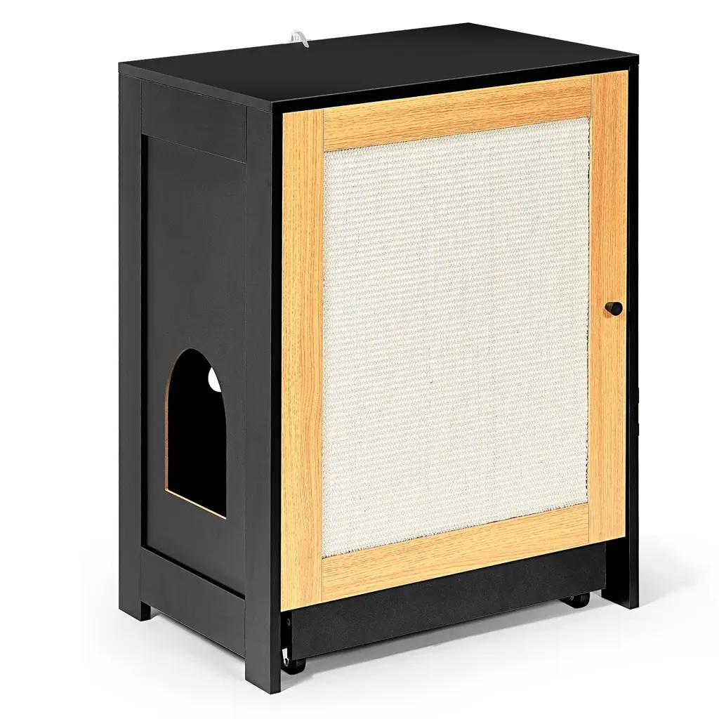 Cat scratching board door panel: The door panel is covered with sisal cloth, which is not only beautiful but also can meet the needs of cat scratching habitsDrawing design: The bottom plate of the Litter Box in the cabinet is equipped with 4 wheels, which can easily pull out the bottom plate together with the Litter Box, which is convenient for people to clean the litter boxStorage space: There is a layer on the upper layer of the cabinet, which can store cat litter scoops, cat cans, cat toys and other supplies to keep the room clean and not messyEnvironmental protection material: The product adopts the high standard environmental protection grade of P2 particleboard, which is very healthy for cats and people, without harm, so that your cat can rest assured to useIdeal for Any Room: This discreet cat enclosure litter box is perfect for living rooms, bedrooms, or any space in your home. It creates a private, odor-free area for your cats to use their litter box, maintaining a tidy environment without compromising on style.