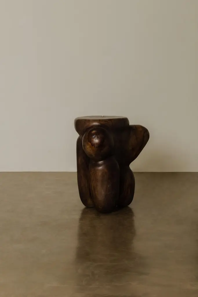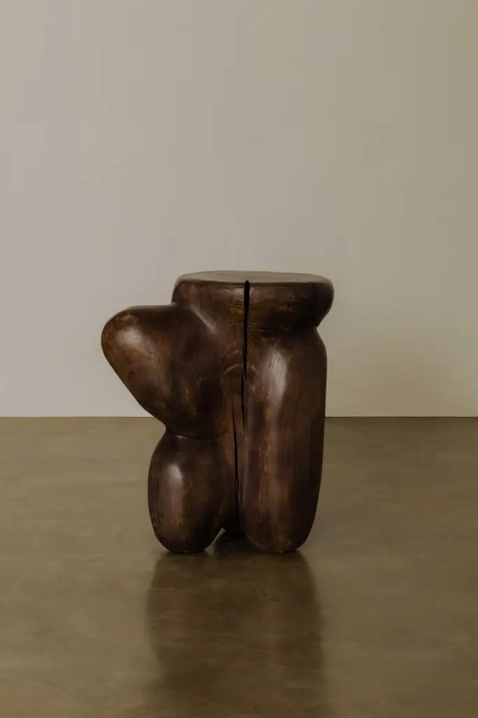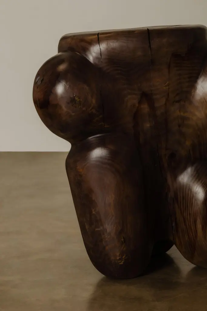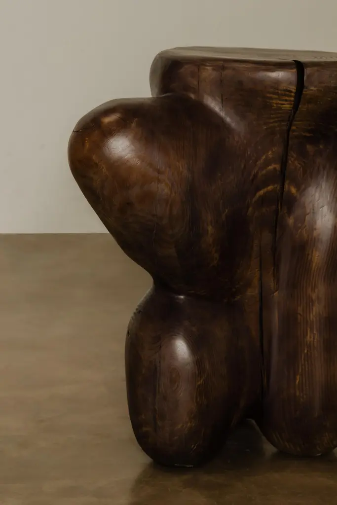 This piece is the result of a sequence of manual carving exercises in pine trunks. The diameter of each piece and the variation in its shapes is determined by the height of each section of this tree. Its contours attempt to reproduce the folds and curves of a human body. The process of carving these grooves into the wood highlights the lines formed by its internal parts, such as the heartwood and knots, revealing a pattern of organic stripes. Its shape has as its main characteristics the irregularity, roughness and simplicity of natural processes.