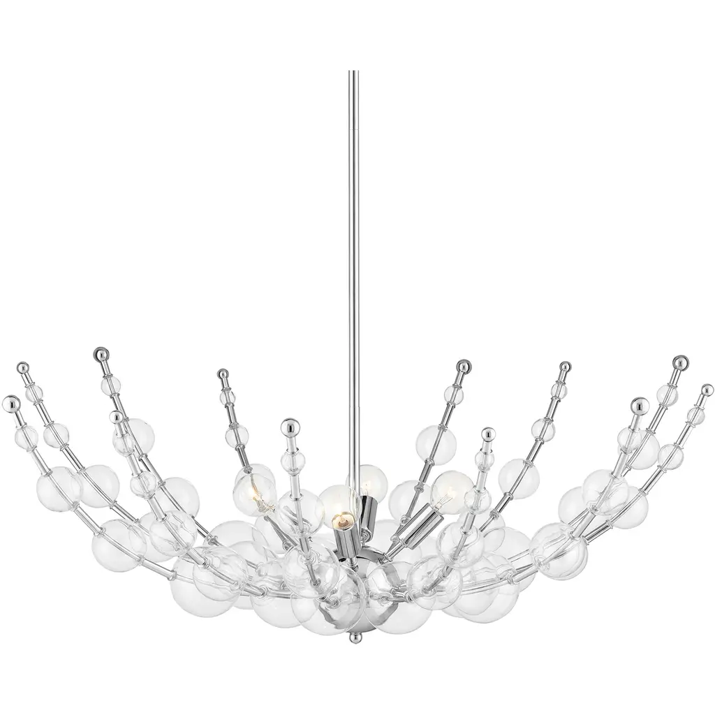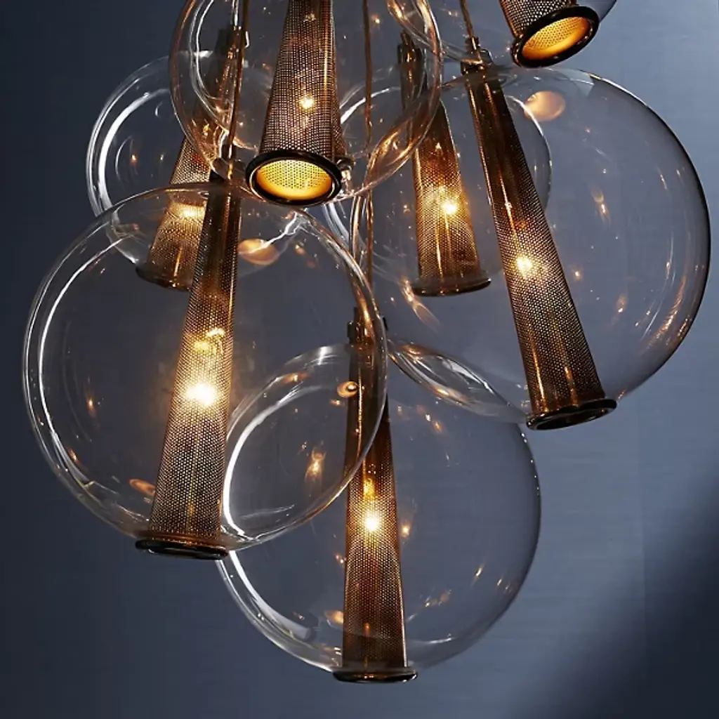 The Arteriors Caviar Adjustable Multi-Light Pendant is a bubbly cluster of glass globes inspired by a luxurious caviar service. Inside each glass sphere, a perforated conical metal shade diffuses light through tiny pinholes, which gives the impression of sturgeon roe on ice.