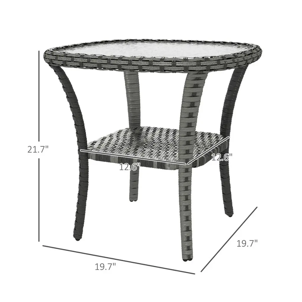 Add a touch of understated sophistication to your space with this stylish wicker outdoor side table. Featuring a stunning water-ripple patterned tempered glass top, it creates a refined focal point for patios, balconies, or sunrooms. Whether you’re sharing drinks, snacks, or simply need a spot for your book or phone, this coffee table pairs effortlessly with any sofa or outdoor seating arrangement. A lower shelf offers convenient storage, helping you keep essentials organized and within reach. Crafted from handwoven PE rattan, it captures the tropical charm of classic wicker while offering excellent UV and weather resistance. Reinforced with a water-safe, powder-coated steel frame, this table is built for strength and durability.Product Details:Overall Dimensions: 19.7" L x 19.7" W x 21.7" HWeight Capacity: 110 lbsAssembly Required