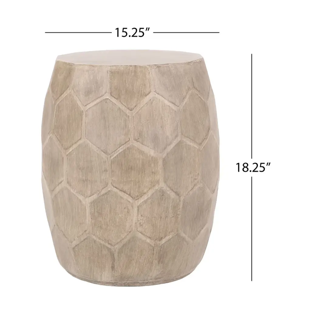 Elevate your outdoor space with this bohemian-chic lightweight concrete patio table featuring a unique honeycomb wood finish. Measuring 15.25-inch W x 15.25-inch D x 18.25-inch H, this small outdoor table combines artistic flair with durable functionality. The barrel-shaped design makes it a perfect side table or end table for patios, decks, or gardens—ready to use right out of the box with no assembly required.