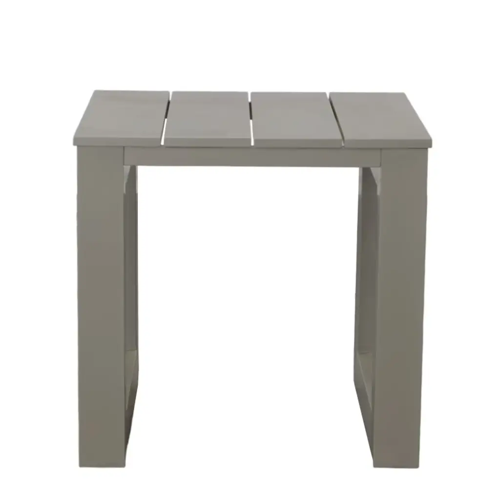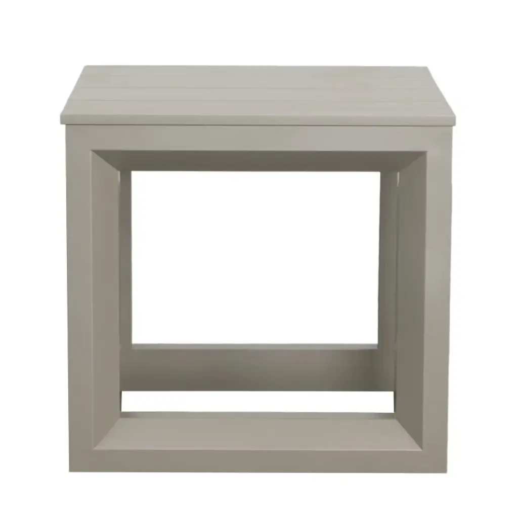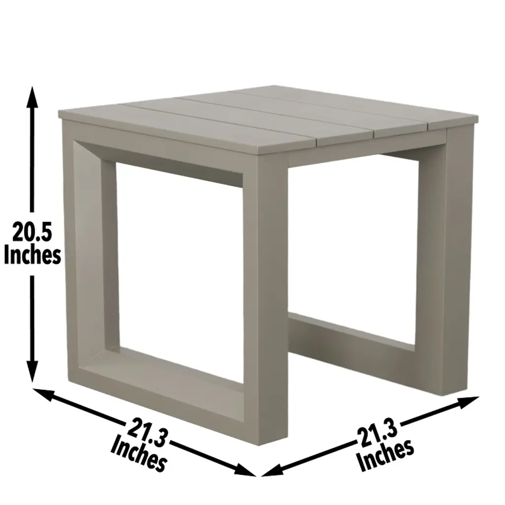 Upgrade your outdoor space with this 21.5-inch square patio table featuring a sleek geometric design and neutral color palette. Crafted from durable, rust-proof aluminum, this outdoor side table measures 21.3-inchL x 21.5-inchW x 20.5-inchH and weighs just 15.2 lbs for easy portability. The scratch-resistant surface withstands outdoor elements while maintaining its modern aesthetic season after season.