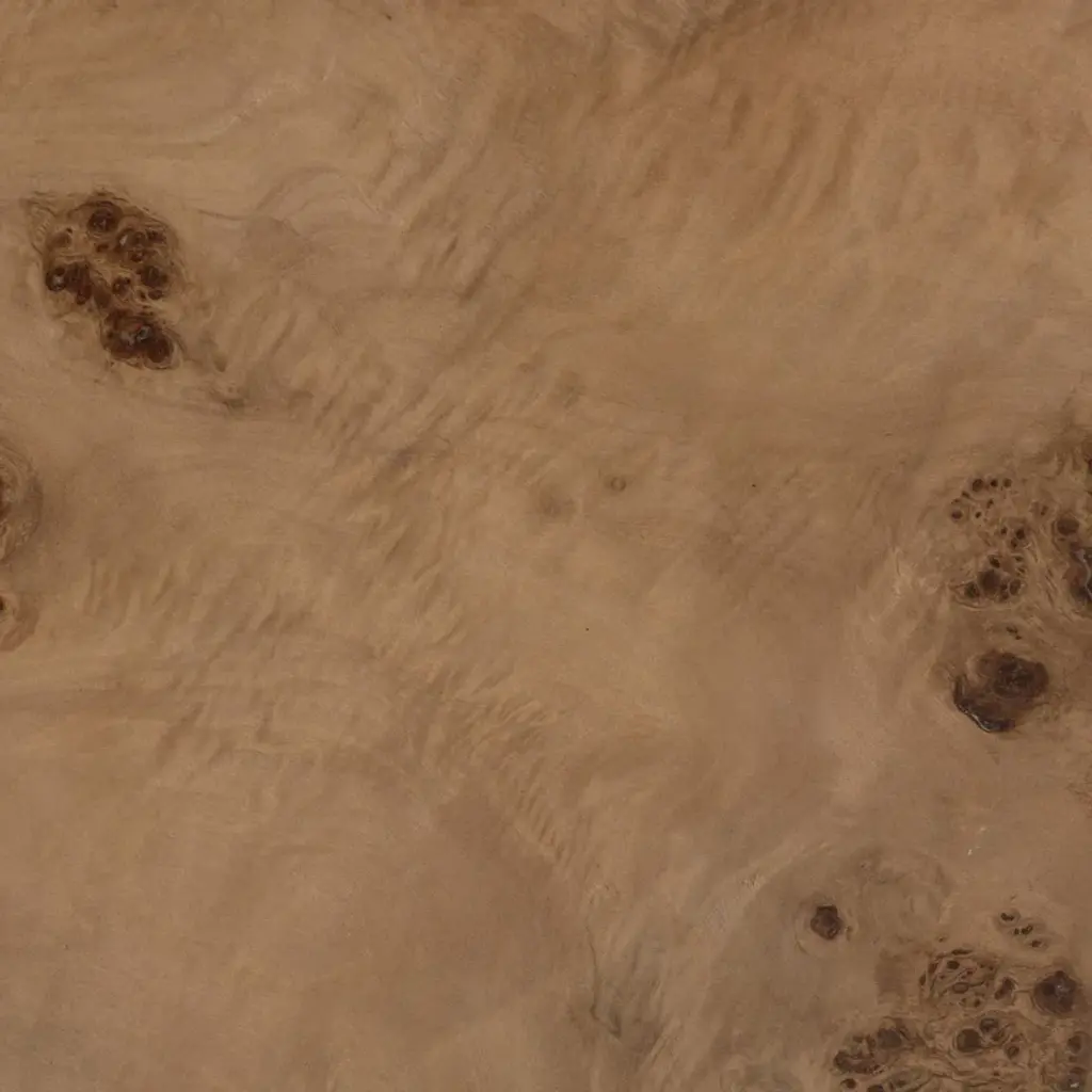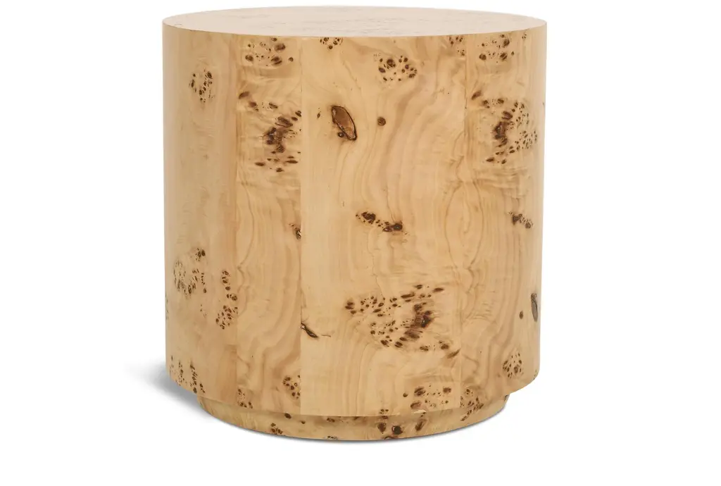 A simple drum shape showcases the natural artistry of the richly grained caramel burl veneer. Its compact size is ideal for smaller spaces.
