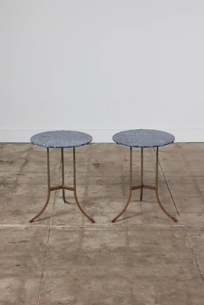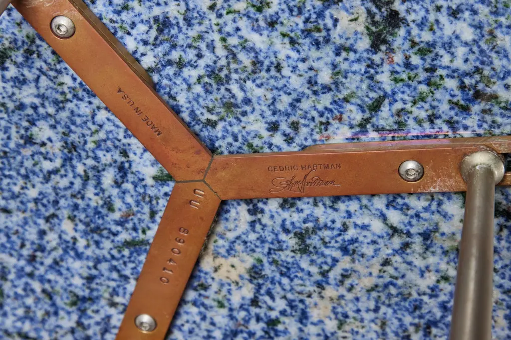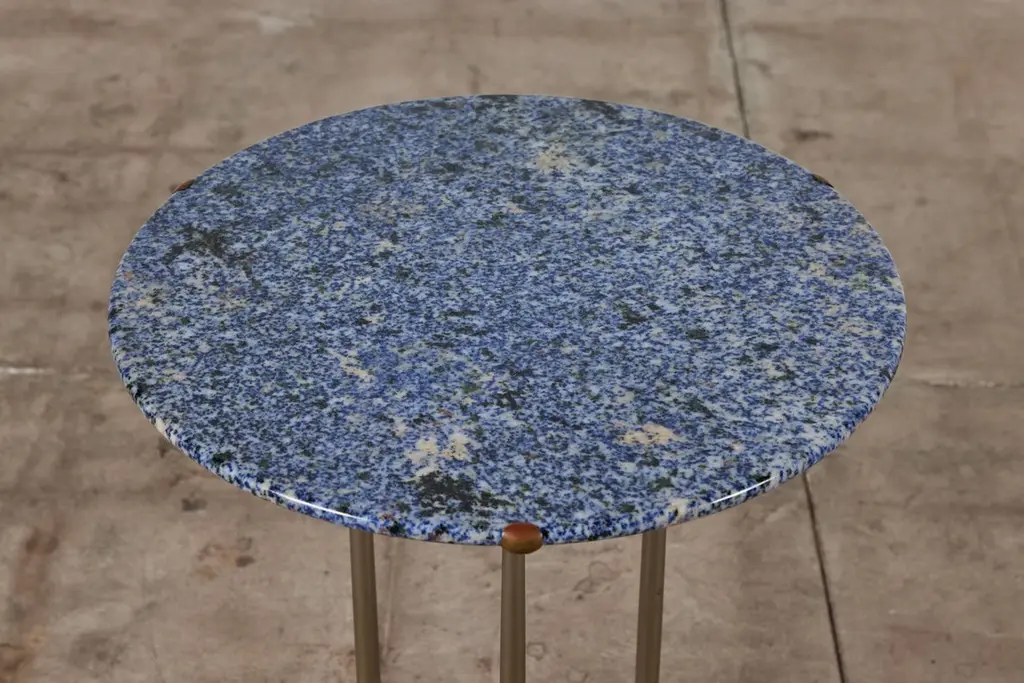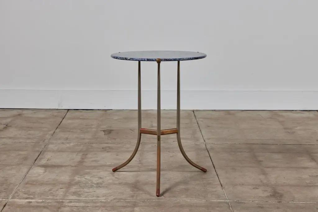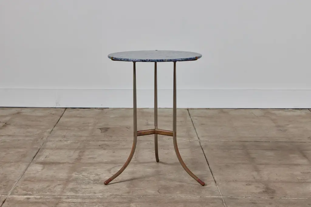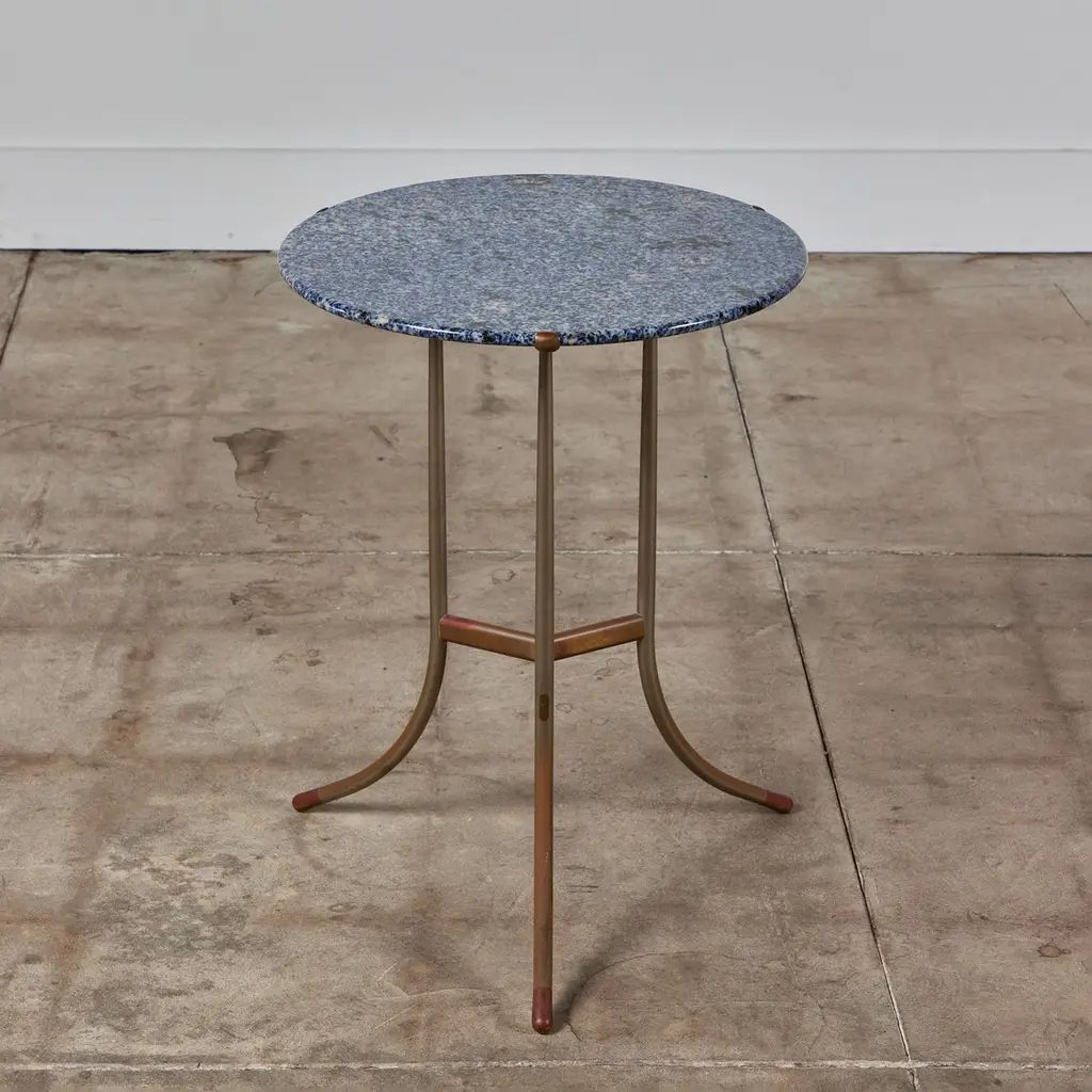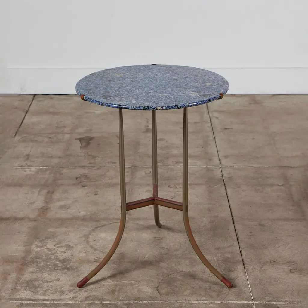Cedric Hartman mixed metal and granite side table, circa.1970s, USA. The round striking blue granite stone table top showcases a cream and black veining. The table top rests inside three delicate copper prongs. The table features a pedestal base with three splayed legs, minimal yet elegant.Two available.Dimensions17" diameter x 23" heightConditionGood vintage condition; professionally cleaned and polished.