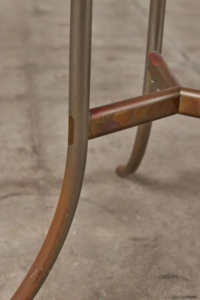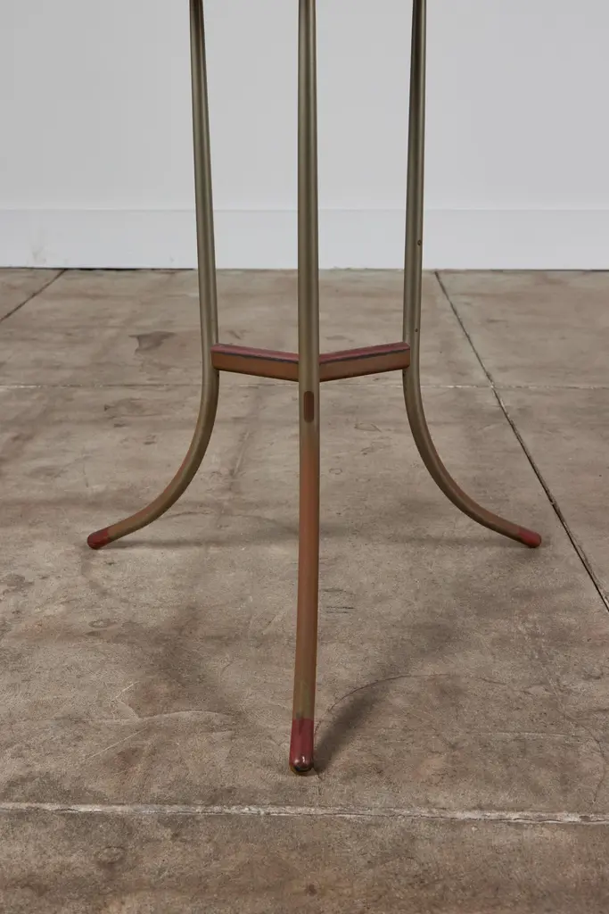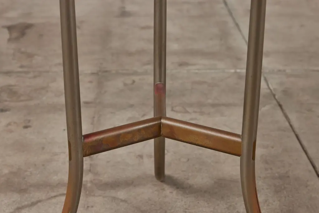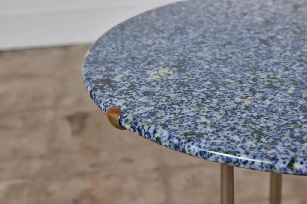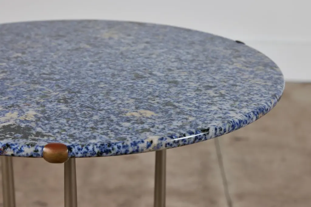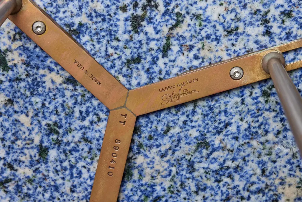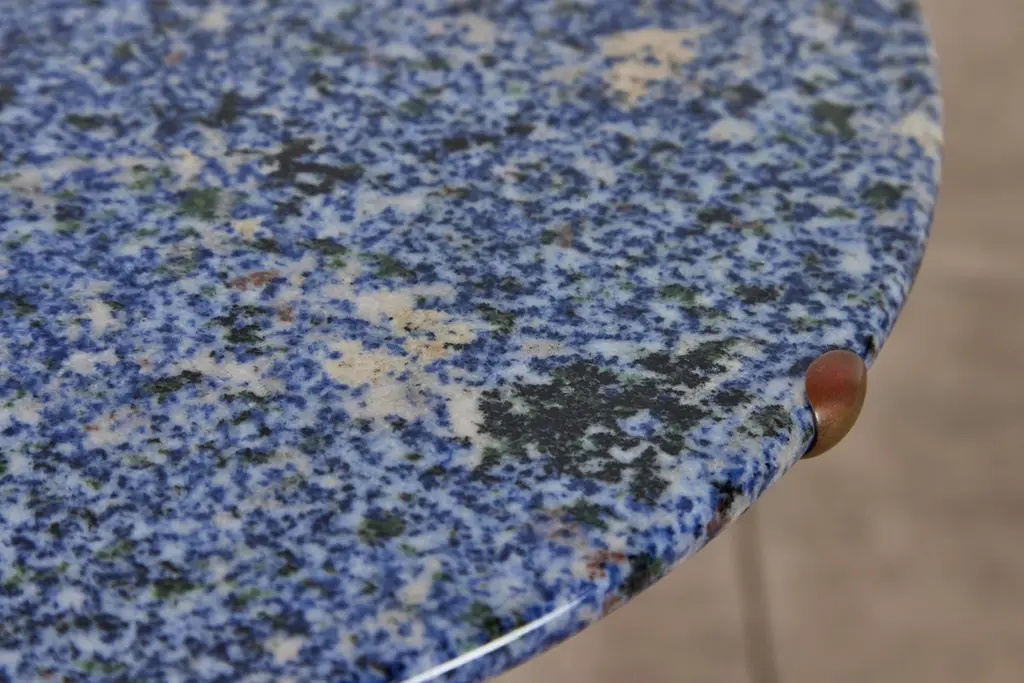 Cedric Hartman mixed metal and granite side table, circa.1970s, USA. The round striking blue granite stone table top showcases a cream and black veining. The table top rests inside three delicate copper prongs. The table features a pedestal base with three splayed legs, minimal yet elegant.Two available.Dimensions17" diameter x 23" heightConditionGood vintage condition; professionally cleaned and polished.