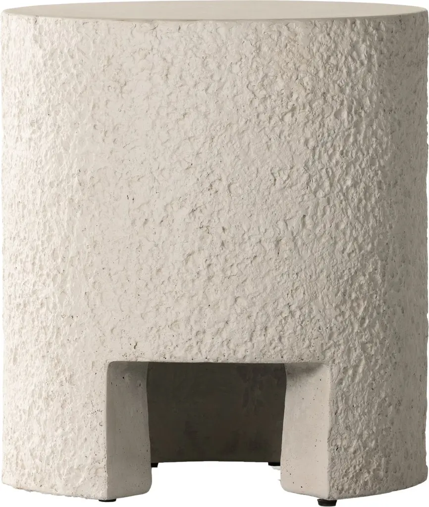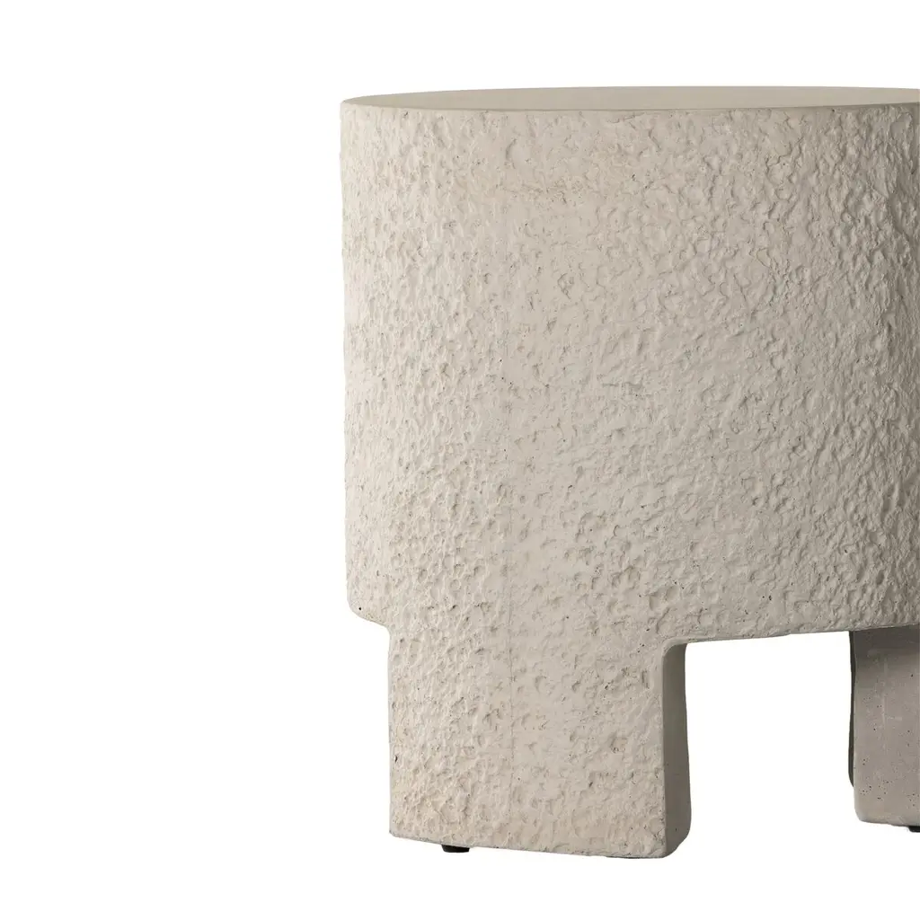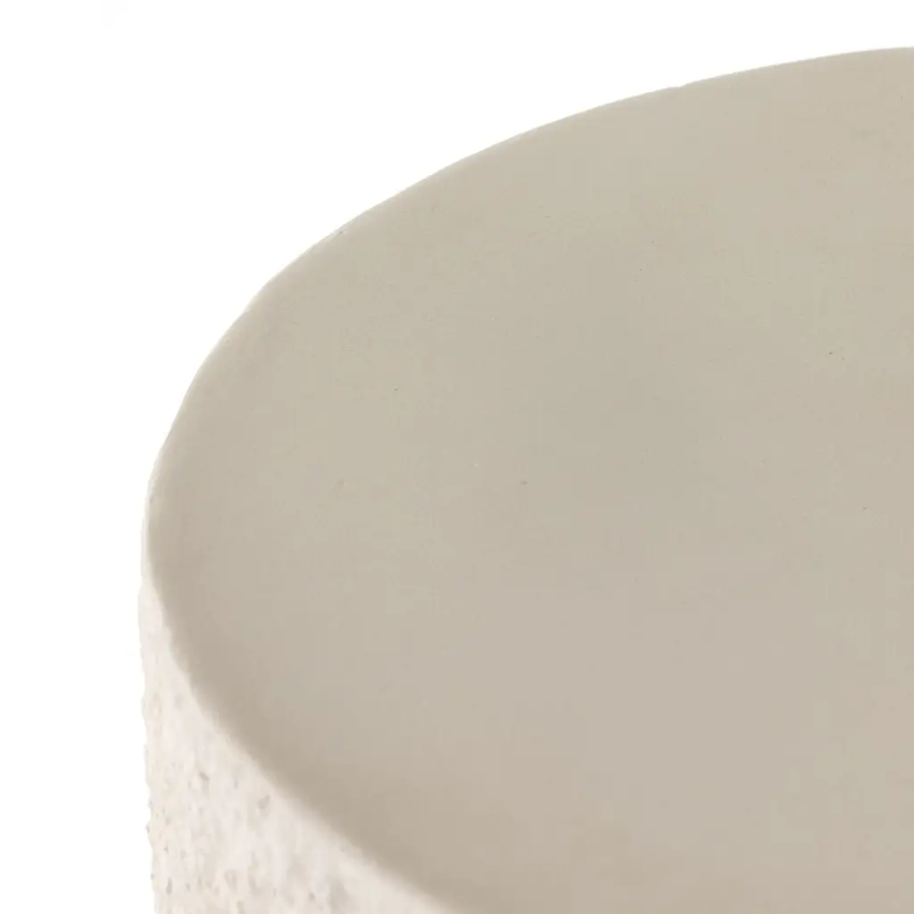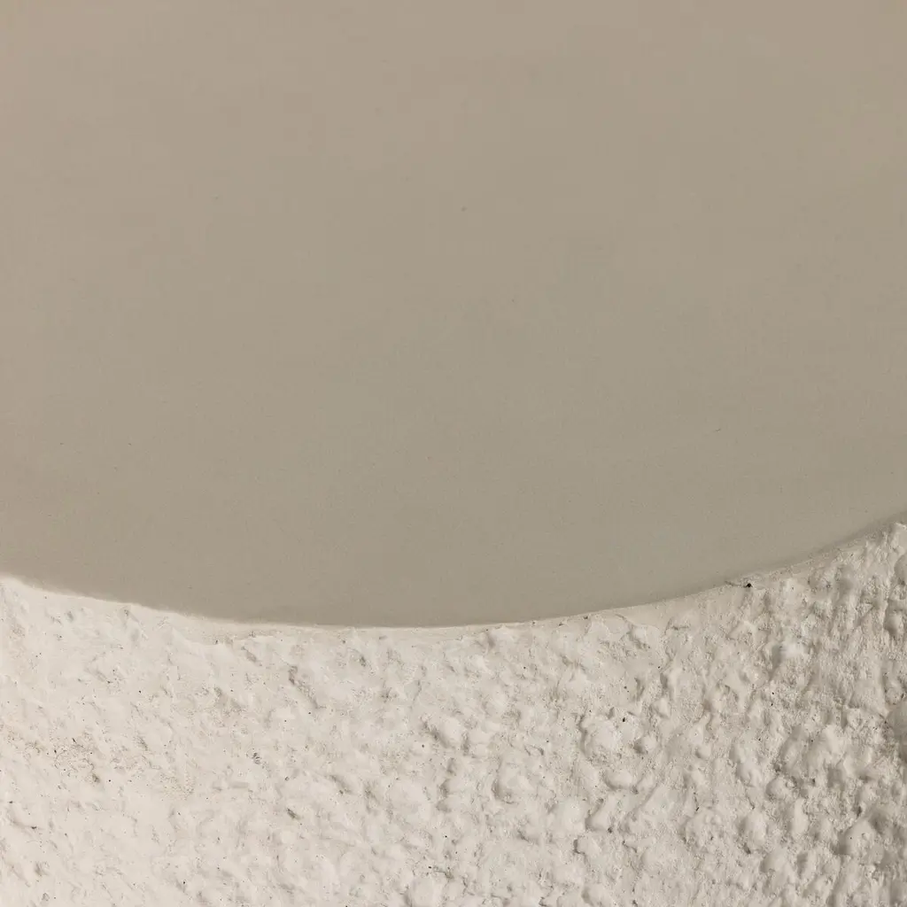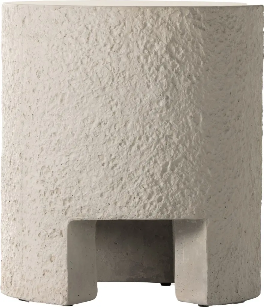 Heavy texture of pumice concrete with a smooth top sets this up as an essential transitional piece for any outdoor style. A statement cylindrical shape lifted by cutout legs contrasts bold design with an airy lightness. Cover or store indoors during inclement weather and when not in use.