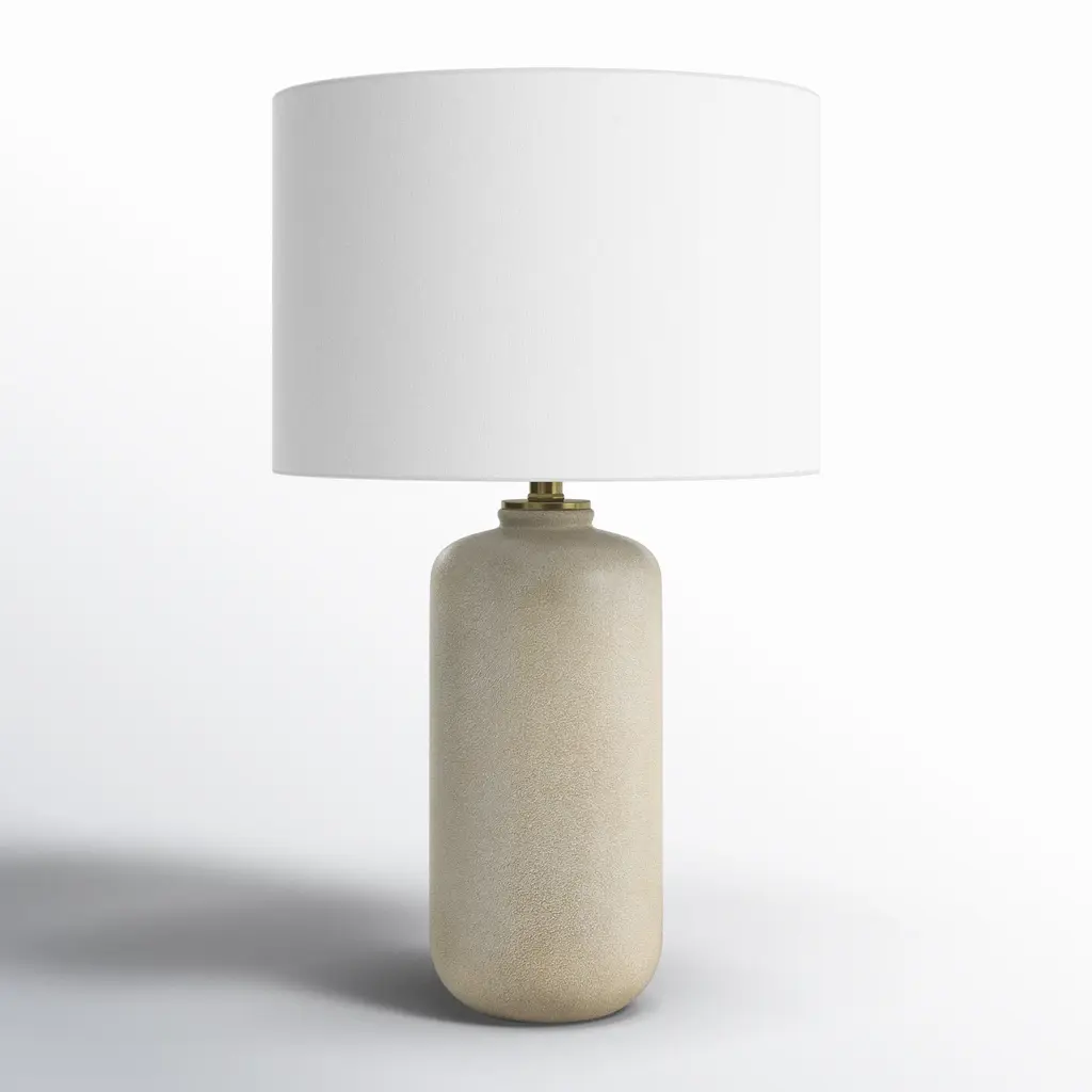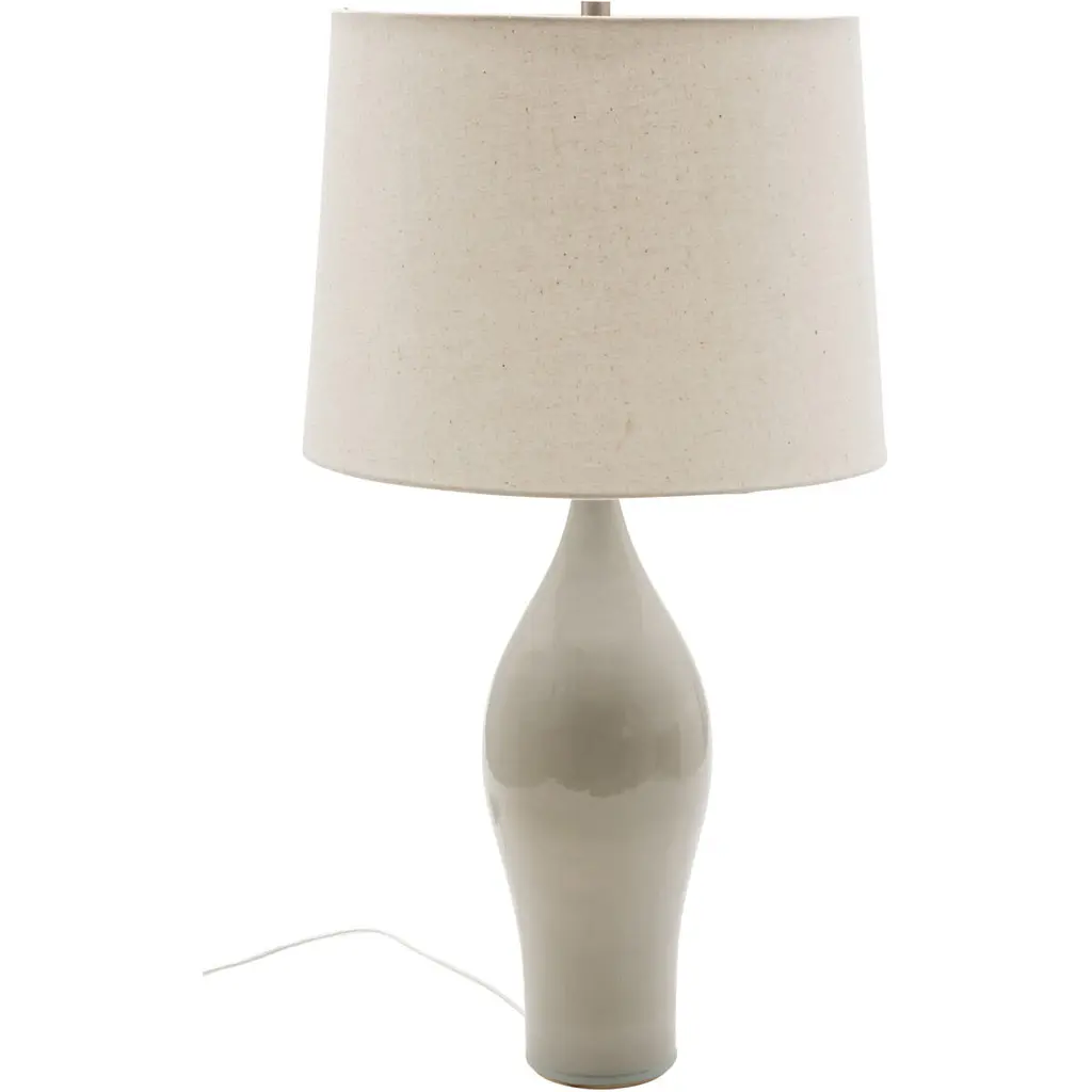 Asymmetrical and interesting, this statement lamp lends a sophisticated elegance. It features a subtly textured finish complemented by an oversized linen shade. Style on a side table, console, or nightstand for a tasteful touch.