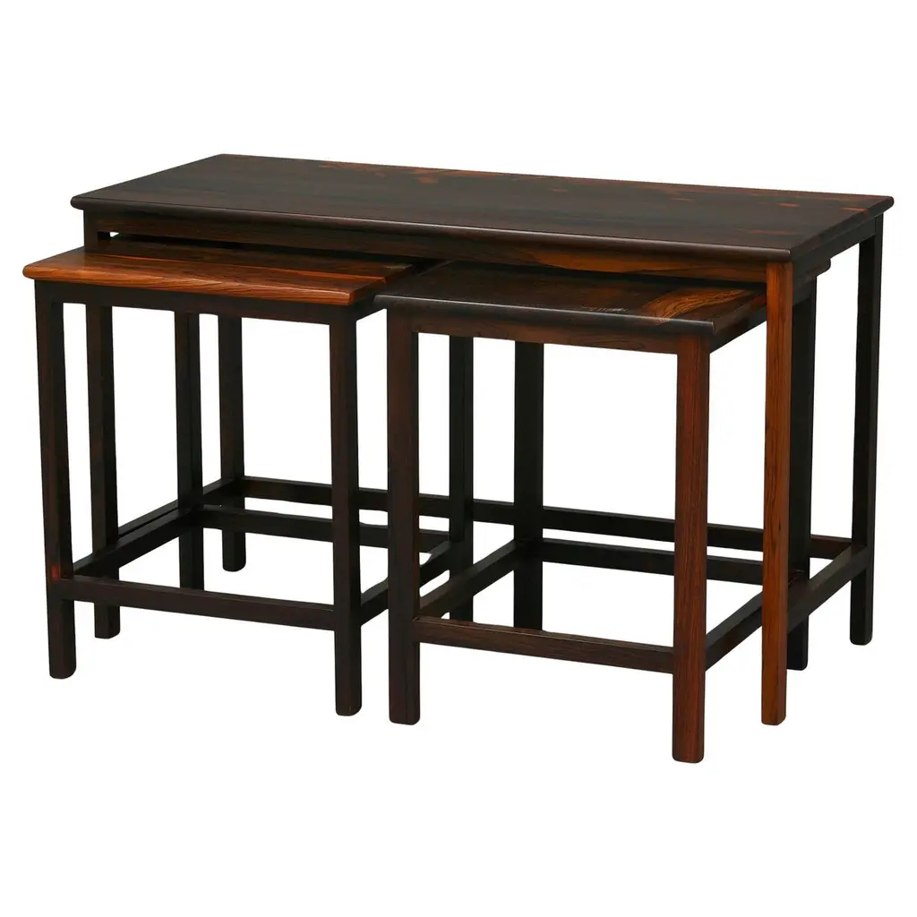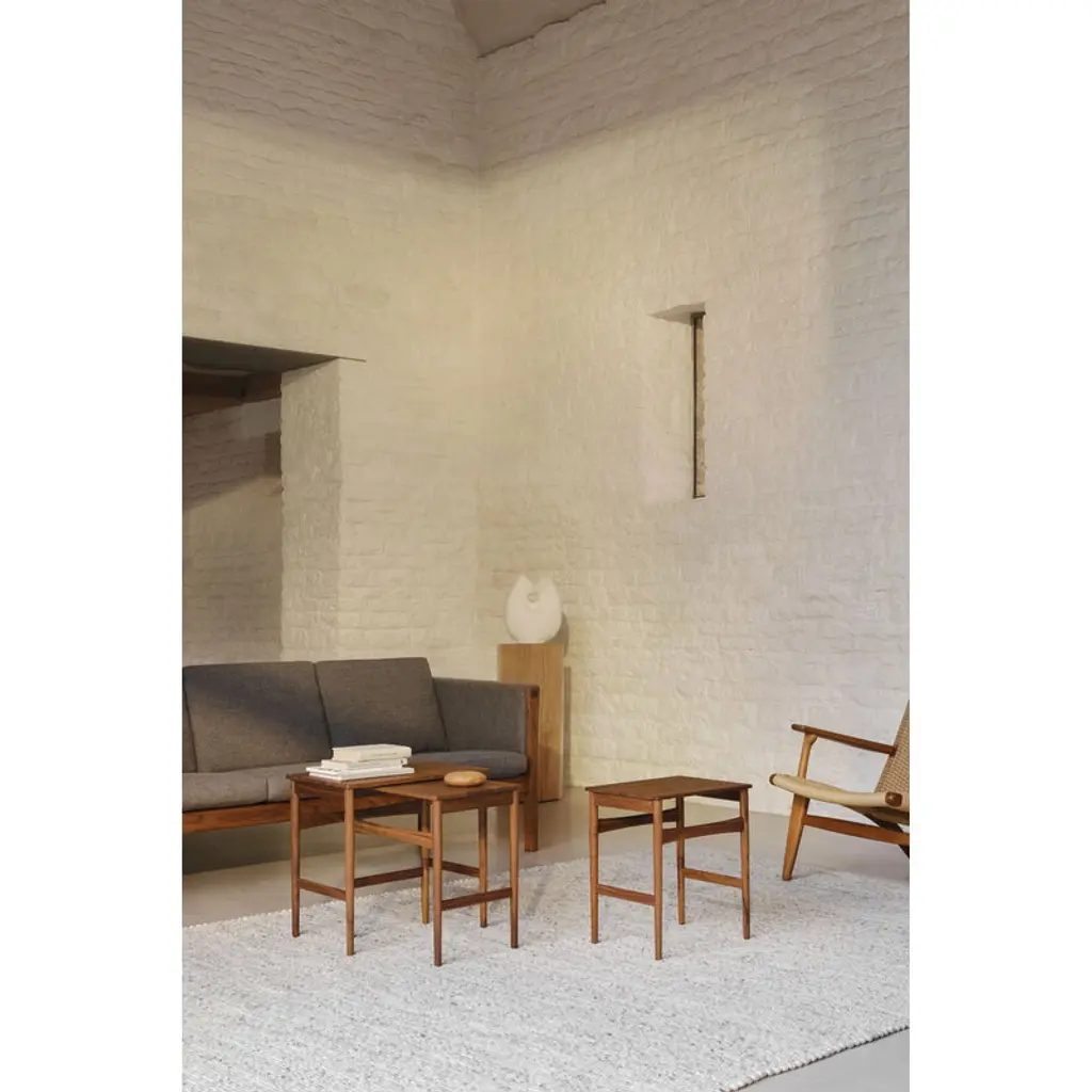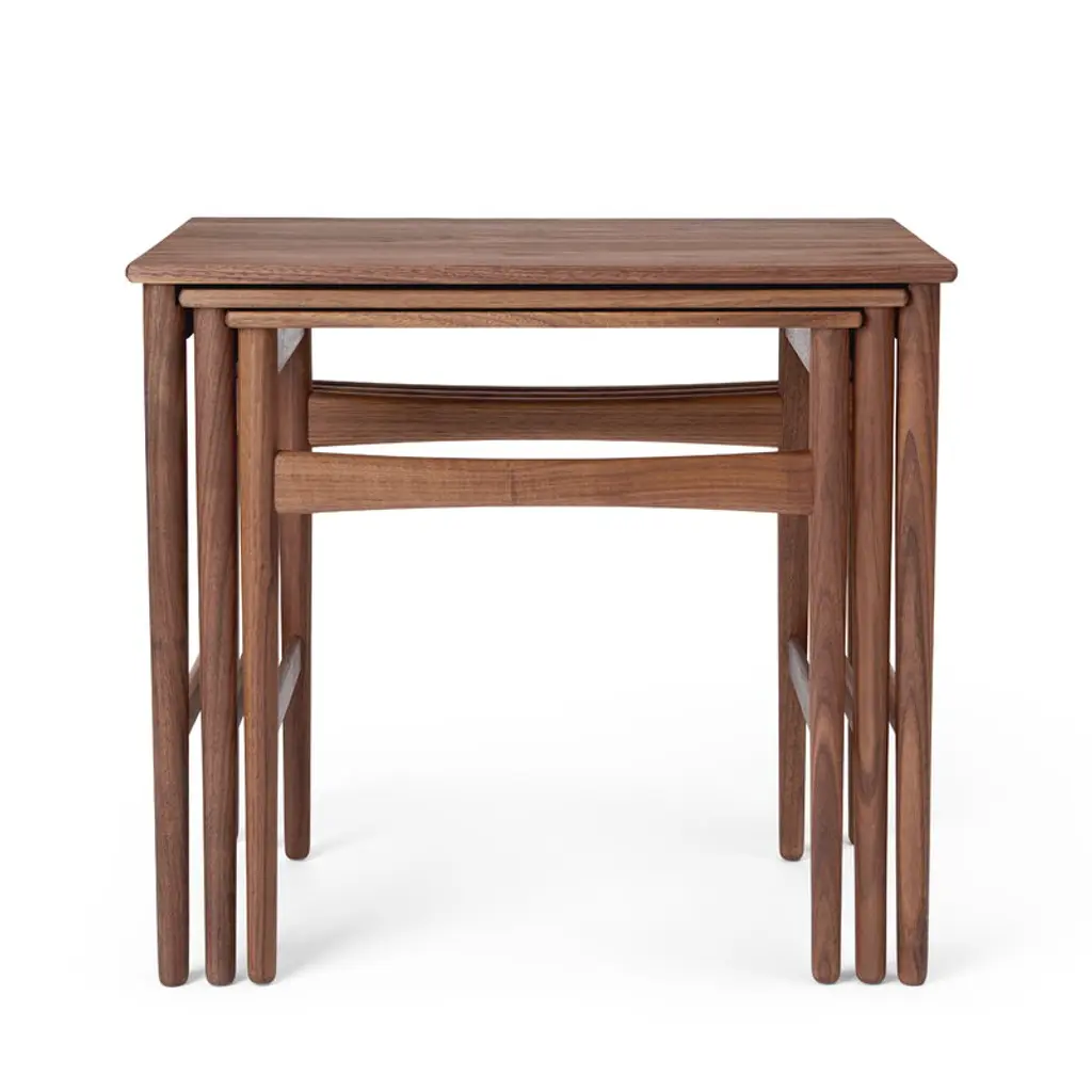 Nesting Tables by Carl Hansen & Søn is a Danish design classic from 1952. Designed by Hans J. Wegner, the minimalist table set is made of certified walnut with several design details typical of Wegner, such as the classic mortise joinery, subtle curves on the struts and the rounded, tapered legs. The Nesting Tables set comprises three tables in different sizes that fit inside one another. This table typology was very common in the 1950s and appreciated for its flexibility and multifunctionality – features that are still valued today. The tables can be used as individual side tables, as a single unit or as a custom arrangement at the center of your living room set.