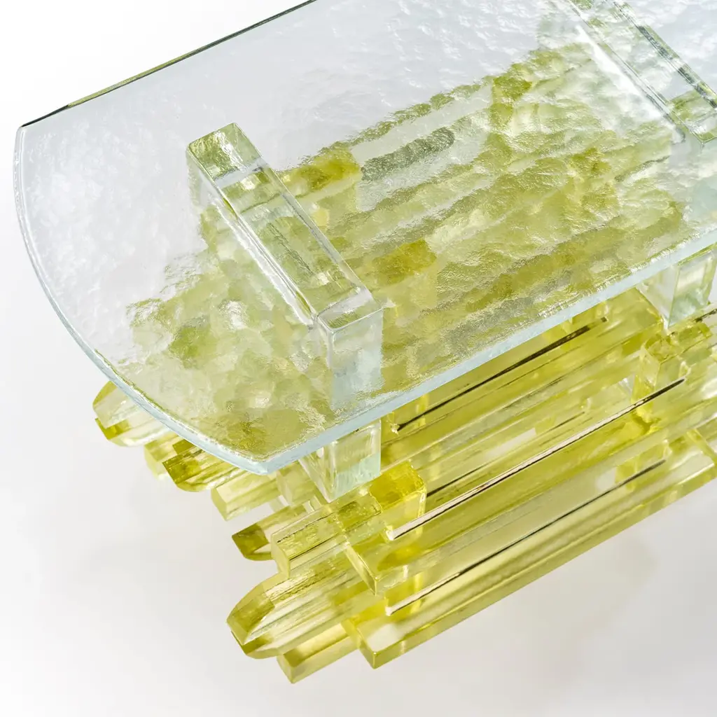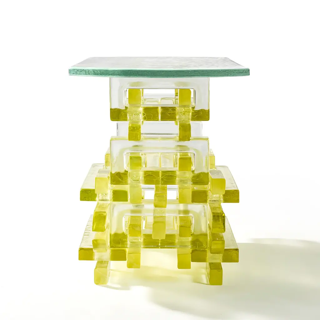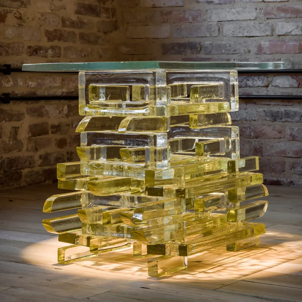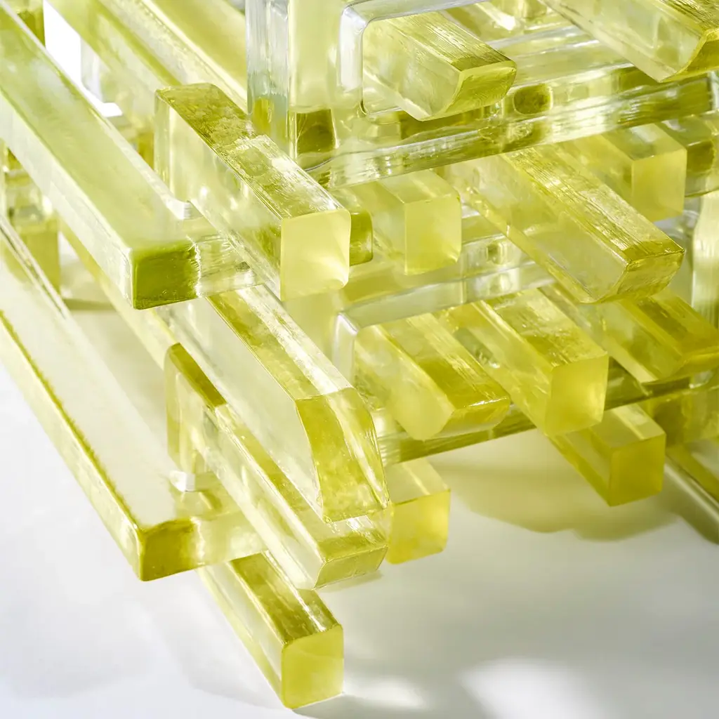 "Chain" is made using multiple donut bricks, cut into two parts and threaded through the centre of another. The curved and polished end details of the cut brick are a nod towards the painted ends found in many Japanese wooden temples. In this period of time when most travel is on pause Bethan took this opportunity to reflect on her adventures over the last two years in Asia, and use the interlocking glass components to reference the amazing joinery she photographed. Numbered Edition.