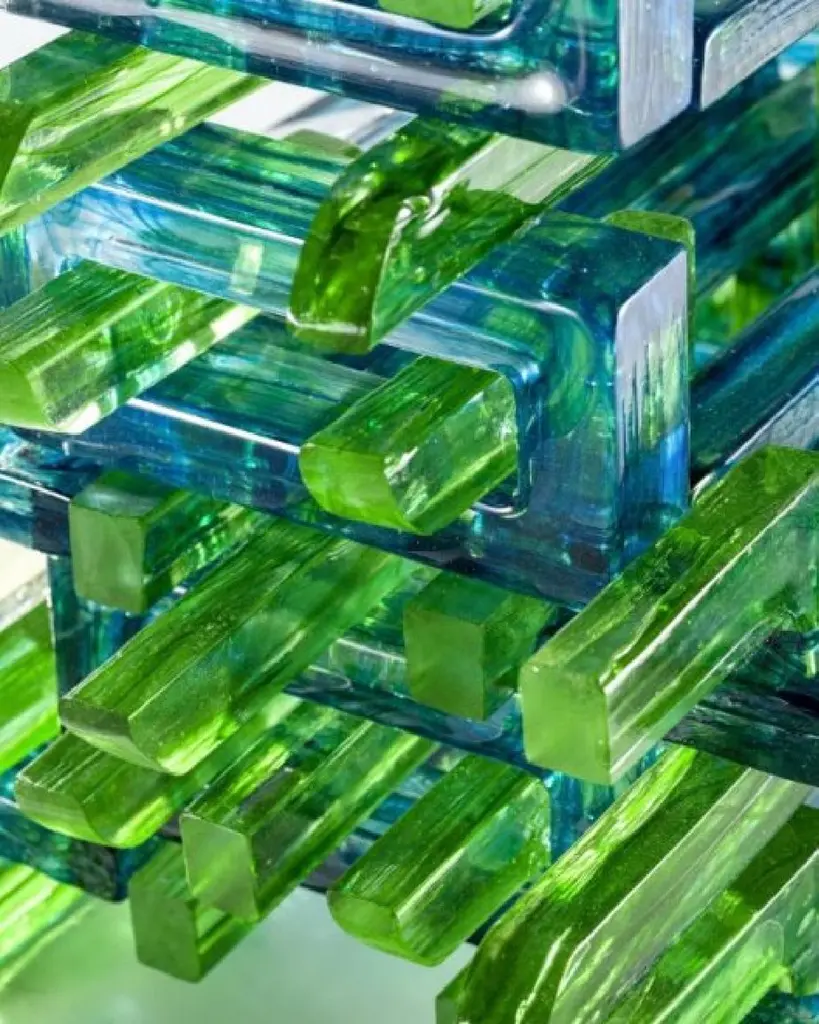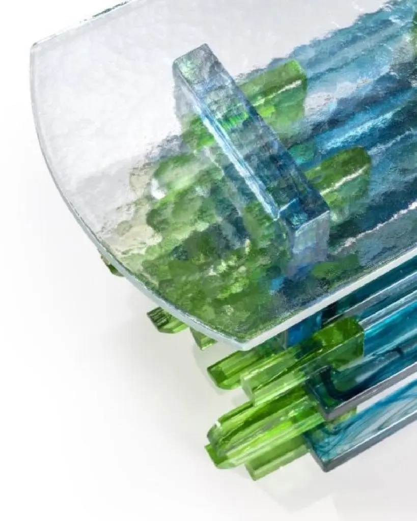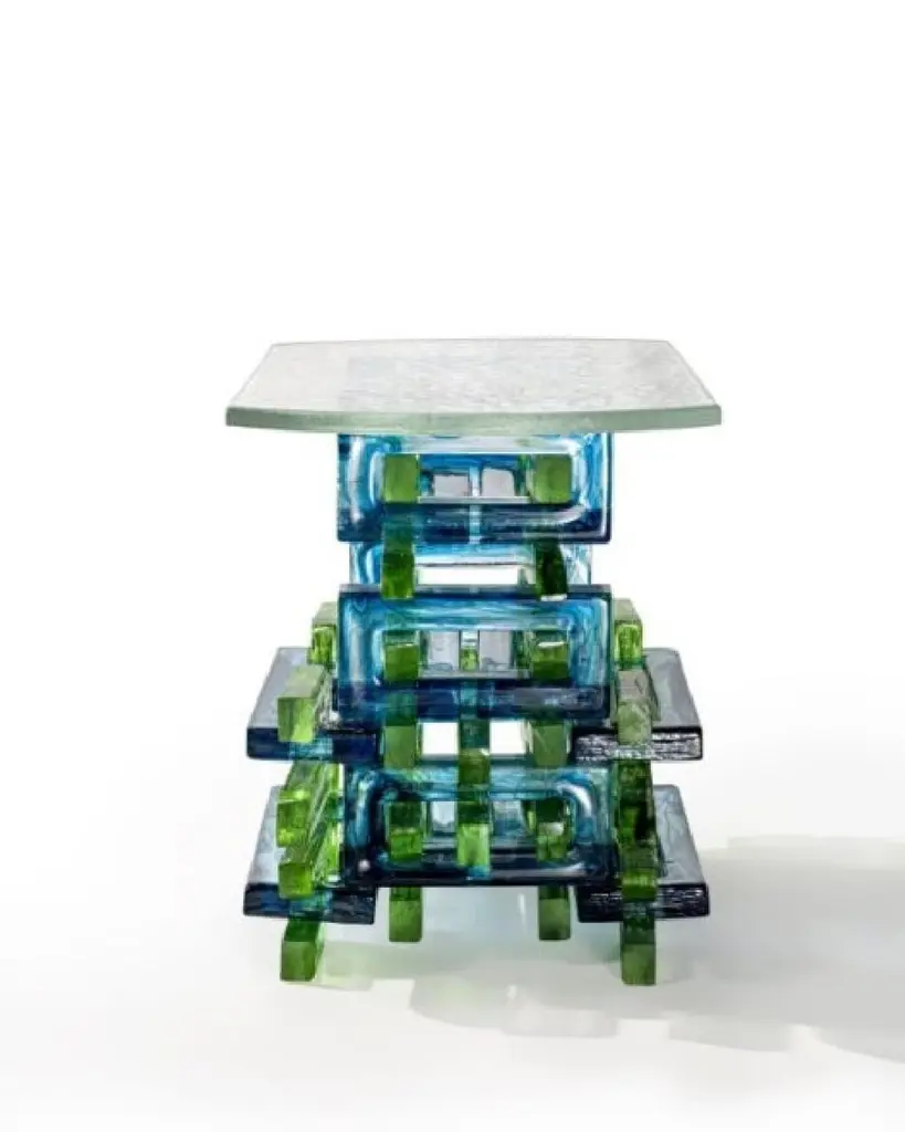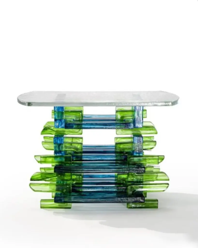 The interlocking or construction of Chain Side Table is made using multiple ringed bricks, cut into two parts and threaded through the centre of another to aggregate the form. The curved and polished end details of the cut brick nod to similar treatments found in many Japanese wooden temples.Numbered edition.COLOURSTop CrystalBase Green Marbled/Aquamarine Marbled, Light AmberMATERIALSCast GlassDIMENSIONSD 420 x W 800 x H 515 mm
