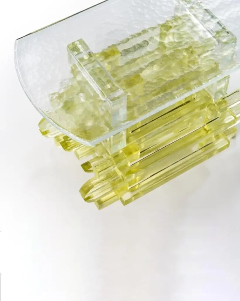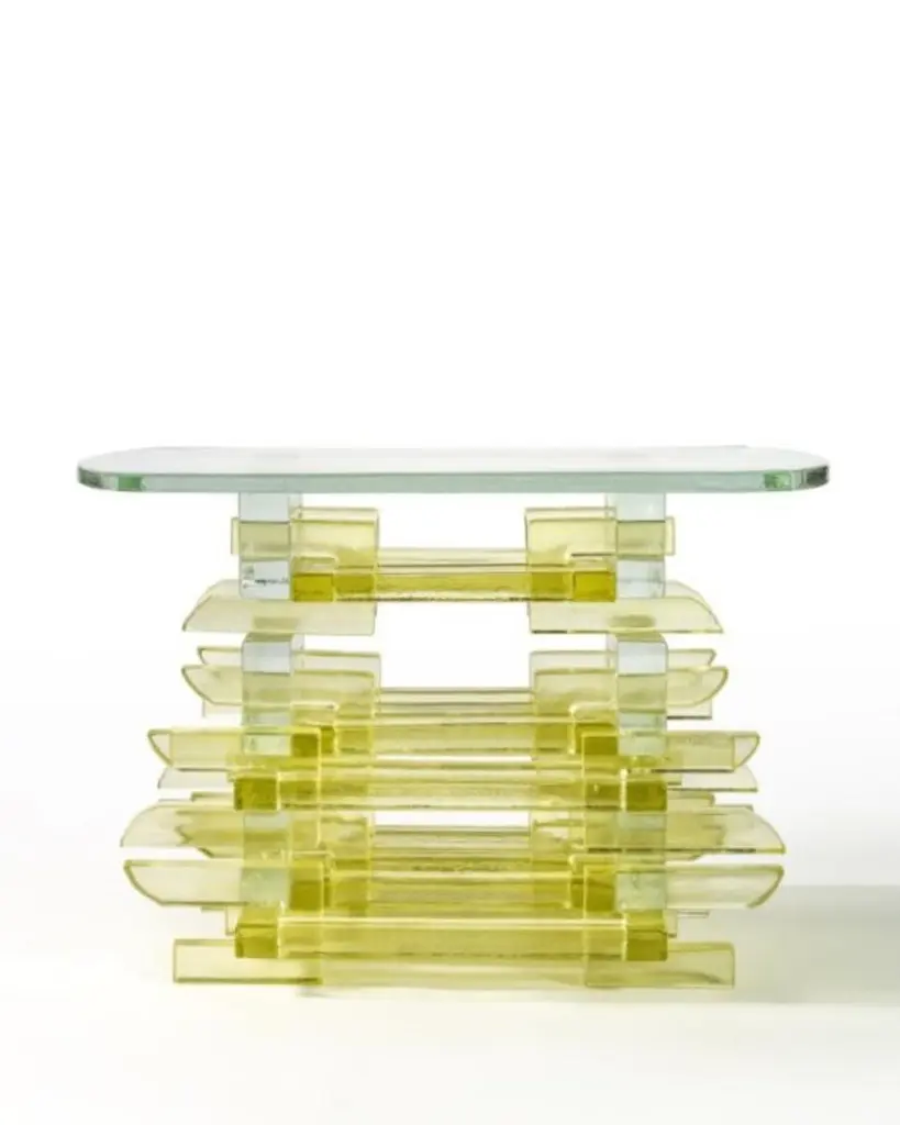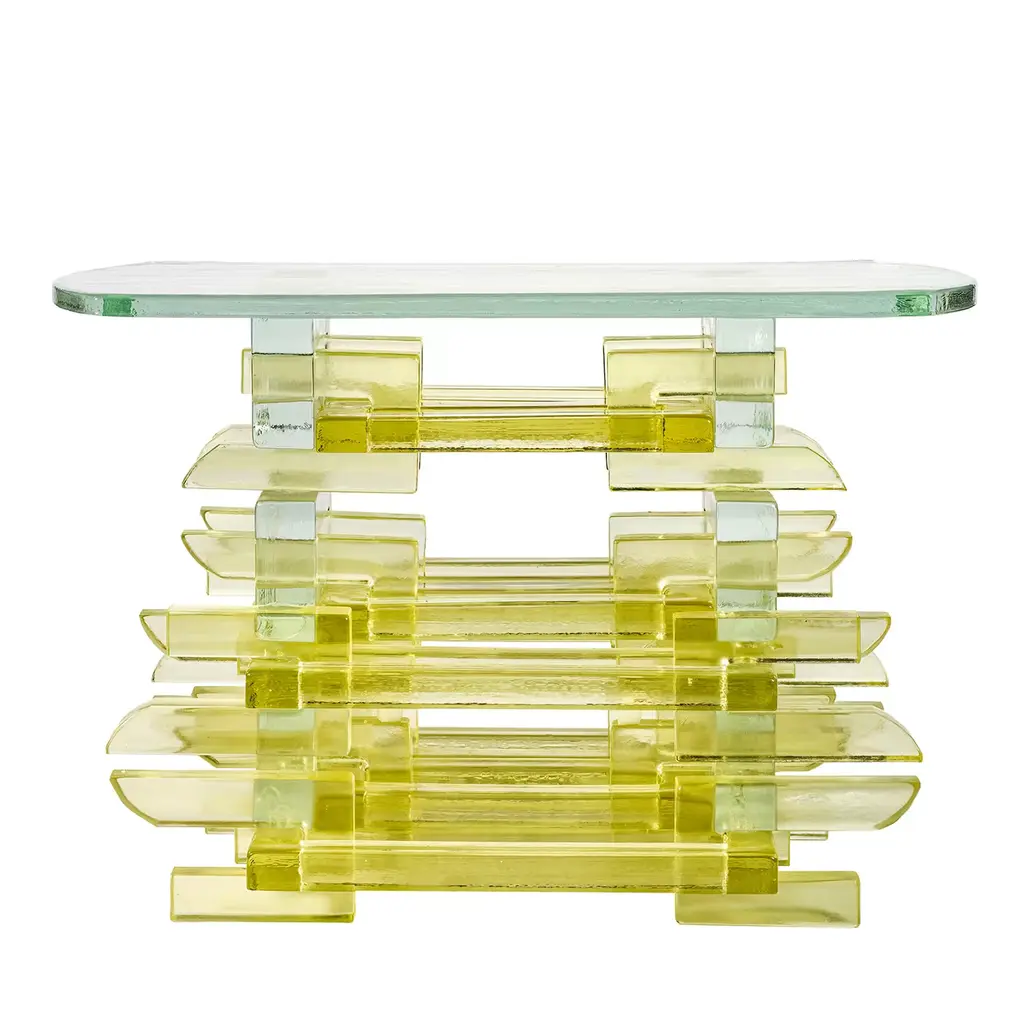 The interlocking or construction of Chain Side Table is made using multiple ringed bricks, cut into two parts and threaded through the centre of another to aggregate the form. The curved and polished end details of the cut brick nod to similar treatments found in many Japanese wooden temples.Numbered edition.COLOURSTop CrystalBase Green Marbled/Aquamarine Marbled, Light AmberMATERIALSCast GlassDIMENSIONSD 420 x W 800 x H 515 mm