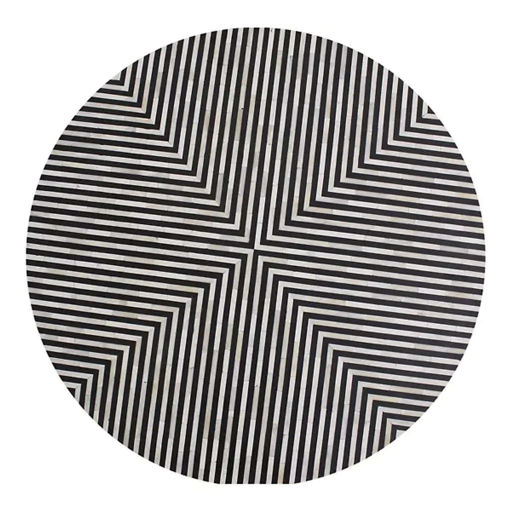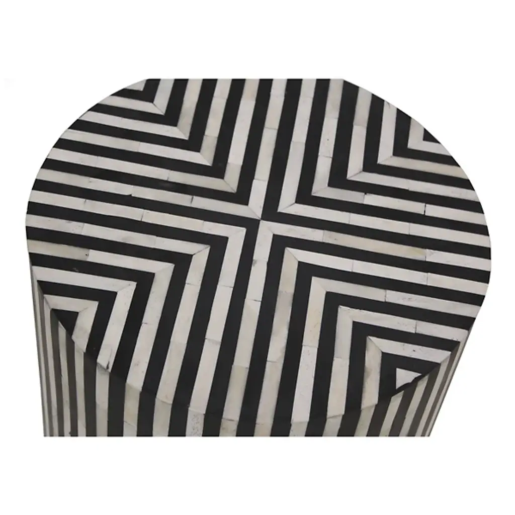 Add style and storage to interior spaces with the cleverly wrought cylindrical form of the Chameau Side Table from Moe's Home Collection. Surfaced with a dramatic deco pattern that demands attention, it’s fashioned from a mixture of bone veneer cast in resin that keeps things animal-friendly and sustainable, juxtaposed with darker MDF. The vibrant and rustic pattern alternates black and white lines along its side, extending into a quartered and diagonal top, drawing the eye and easily able to hold small items and accessories.