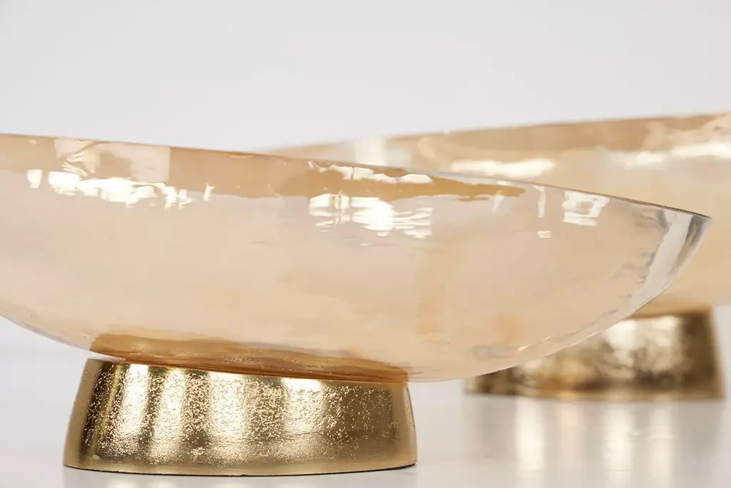 Adorn your dining table or end table with an elegant touch of shimmer with our Champagne decorative bowls. Available in a small and large size, each bowl is crafted with luster glass in a champagne finish and features a metal pedestal for added height. Display decorative glass orbs or vase filler in the bowl for a completed look. Please select your size before adding to cart.