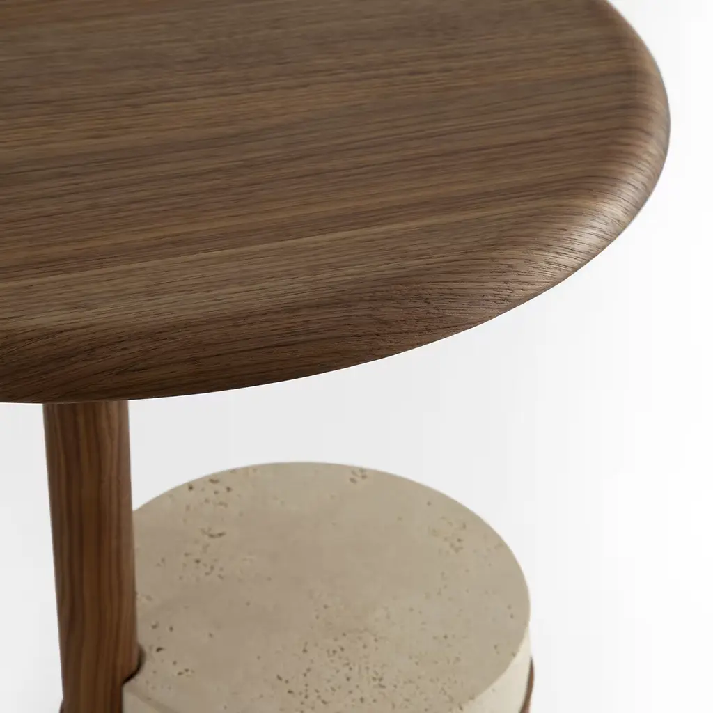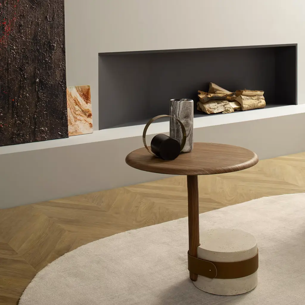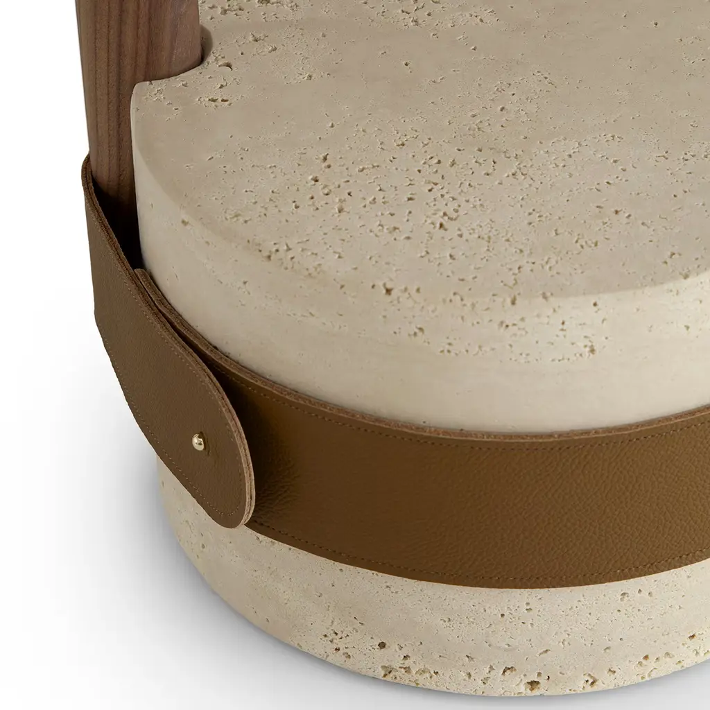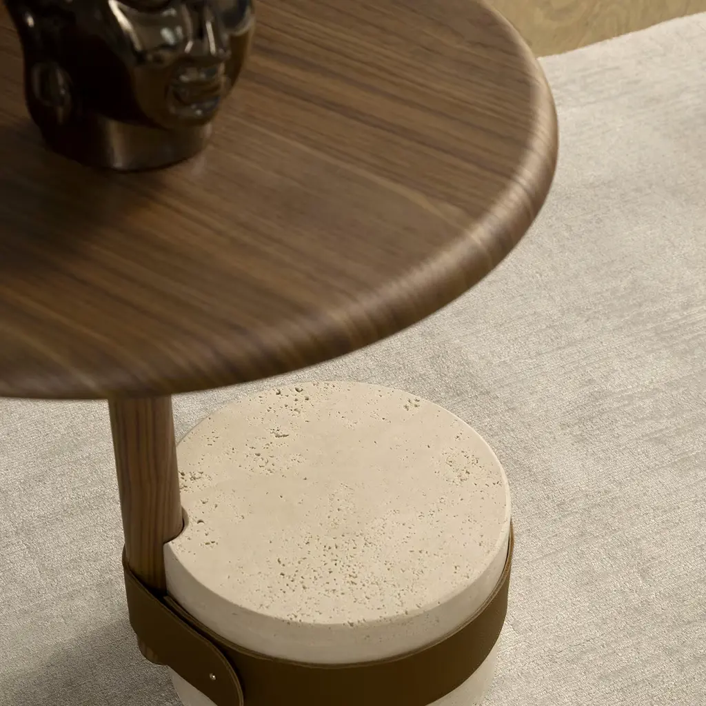This exquisite table exudes timeless elegance with its meticulously crafted Travertino Romano marble base, featuring a matte open-pore finish and a genuine Cognac leather buckle. The solid walnut structure, expertly stained to match the rounded MDF top, showcases a rich Canaletto walnut veneer with a luxurious Terra Diamond finish. Enhanced by advanced membrane press techniques, this unique table seamlessly blends tradition with modernity, making it a striking addition to any living space.