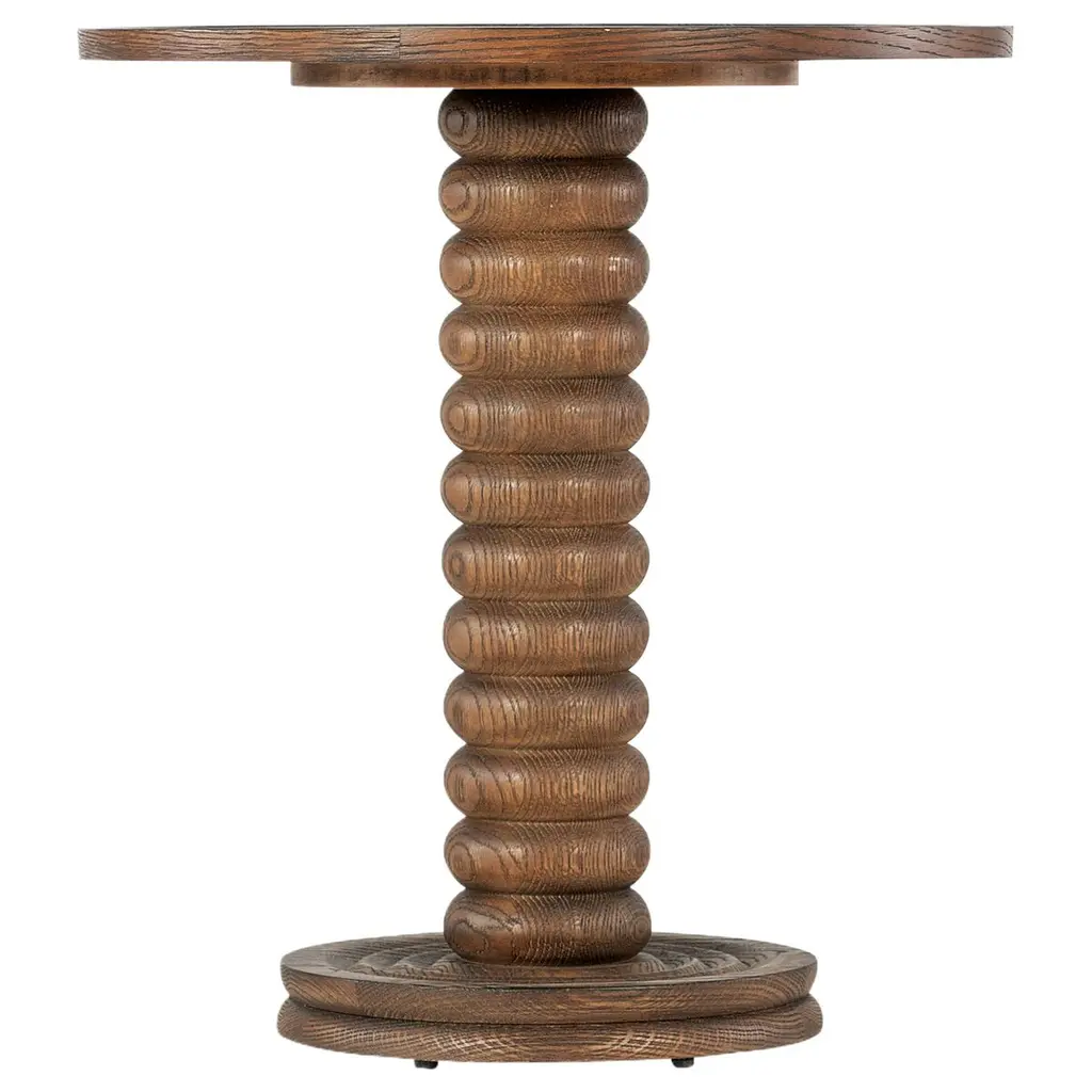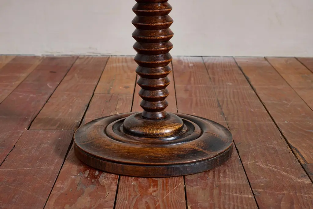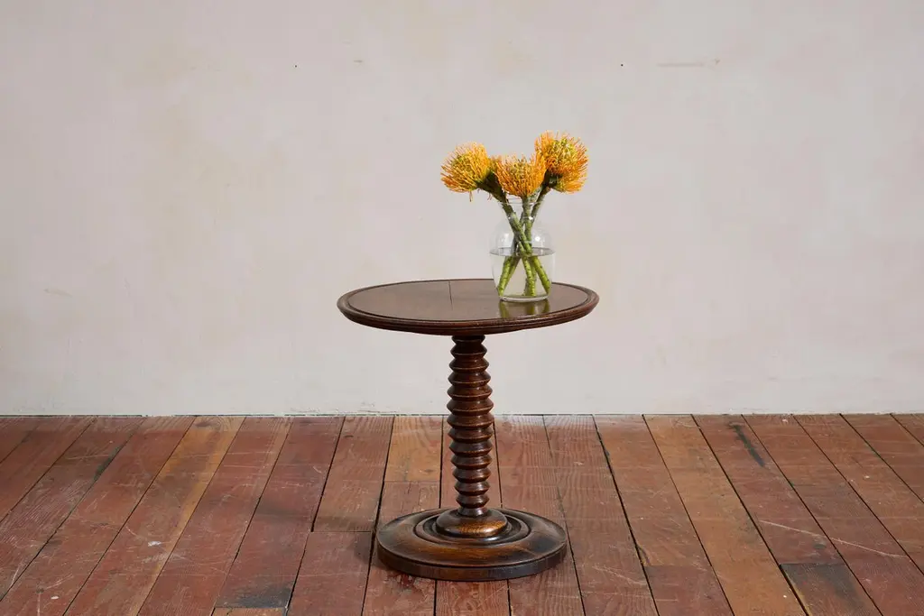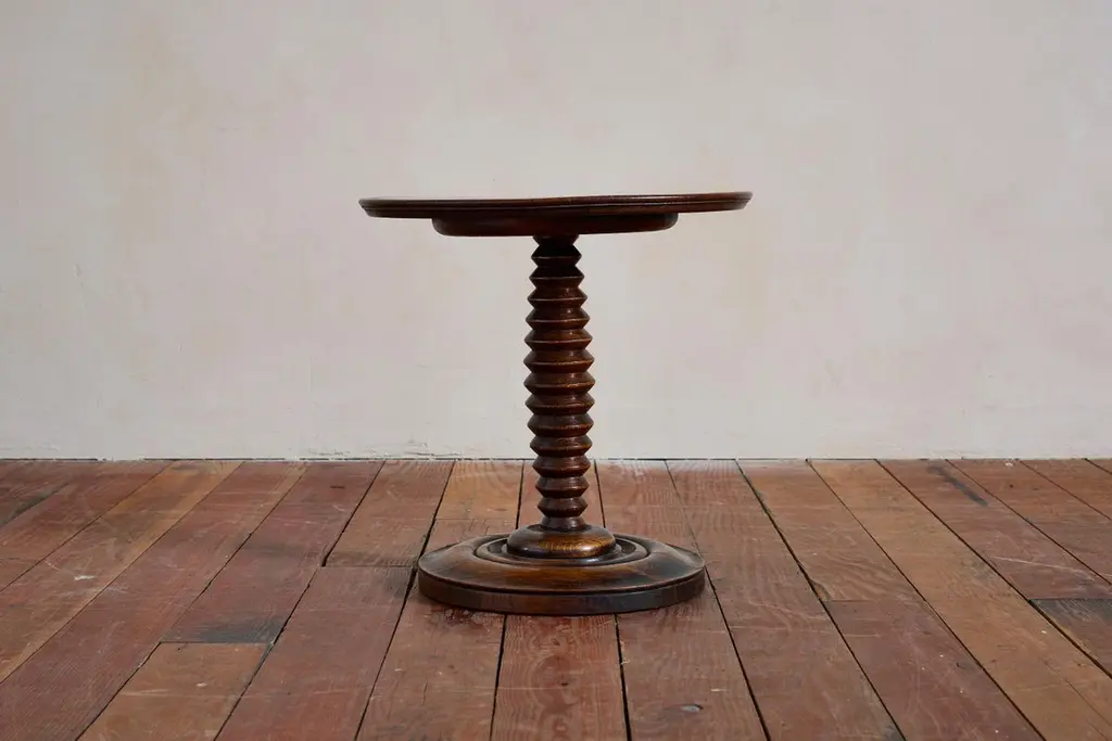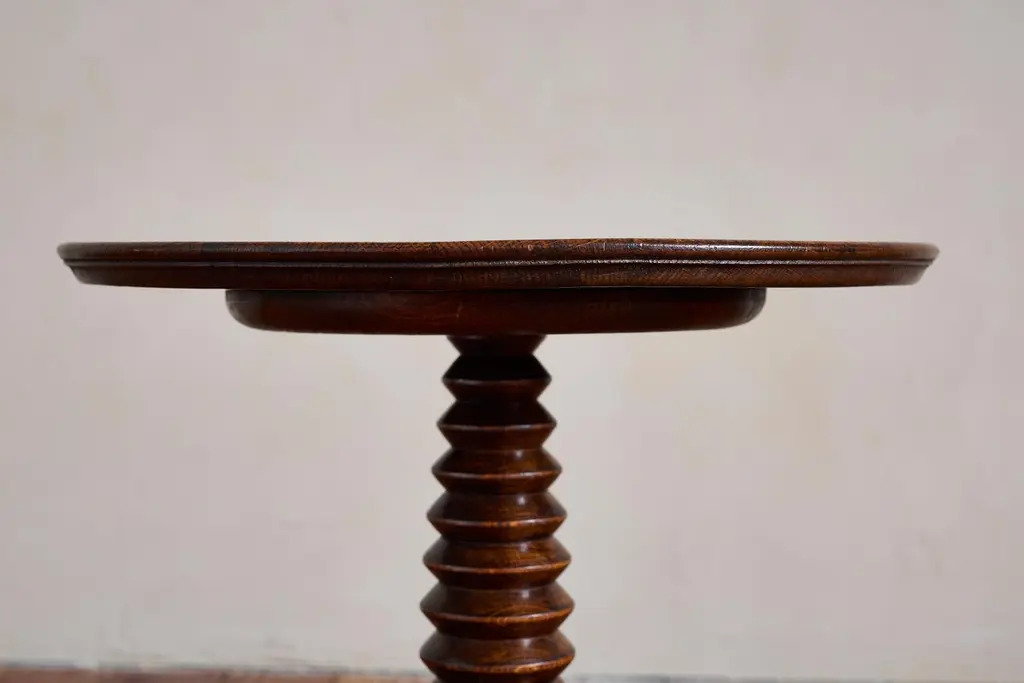 Fantastic Charles Dudouyt side table with signature carved corkscrew base with unique shape. Concentric circled base and carved ledge detailing on top.Overall great rich patina. France, Circa 1940s.