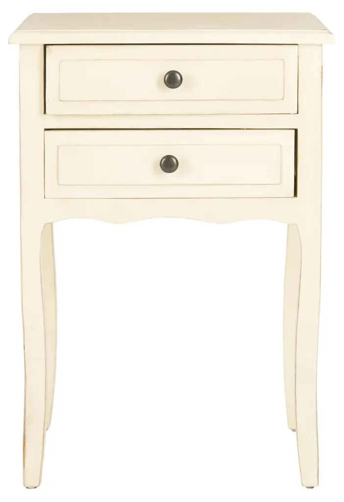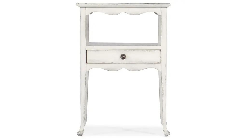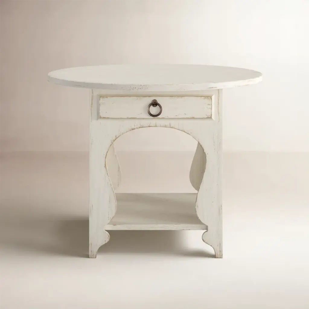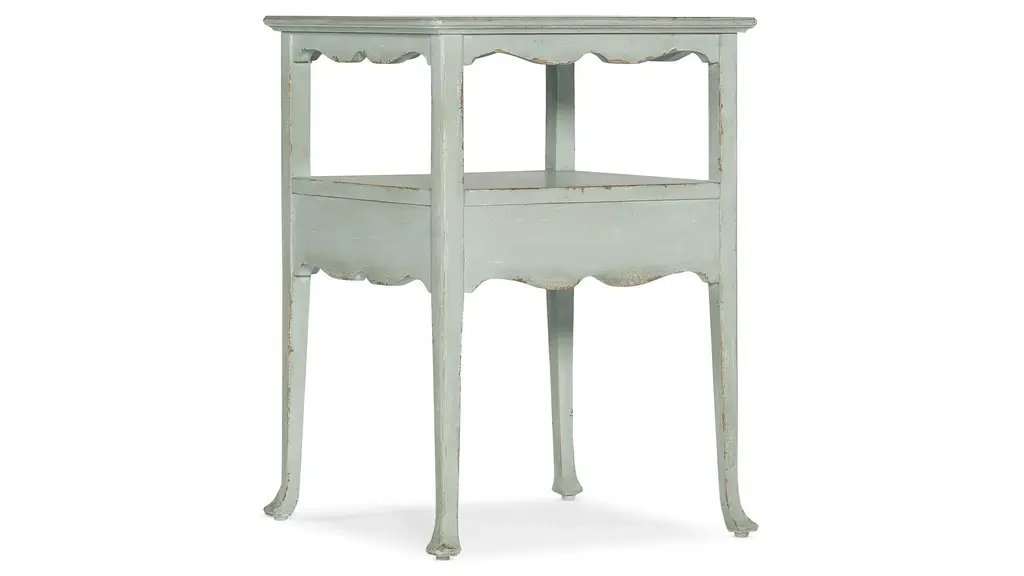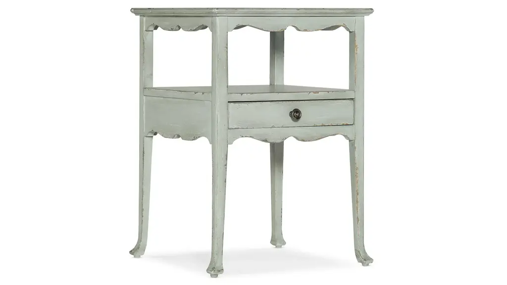 Capturing the vintage charm of the coastal South, this delightful Charleston Accent Table is crafted of Maple Veneers and has scalloped accent trim. The one drawer has self-close drawer guides and a matching-finish interior. The table finish is Haint Blue, a soft color which can be found on the ceilings of porches and entryways, window shutters and doors in the American South, dating back more than 200 years from the Gullah folklore that held the color kept "haints" or spirits from entering homes and dwellings. The table is finished on all sides so it can be floated in a room. The round pull knob is in an antique bronze color.