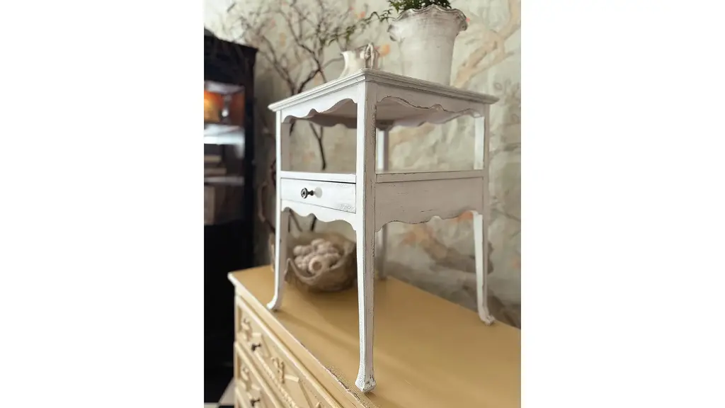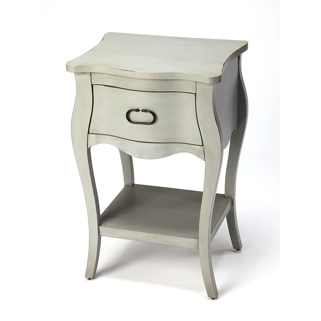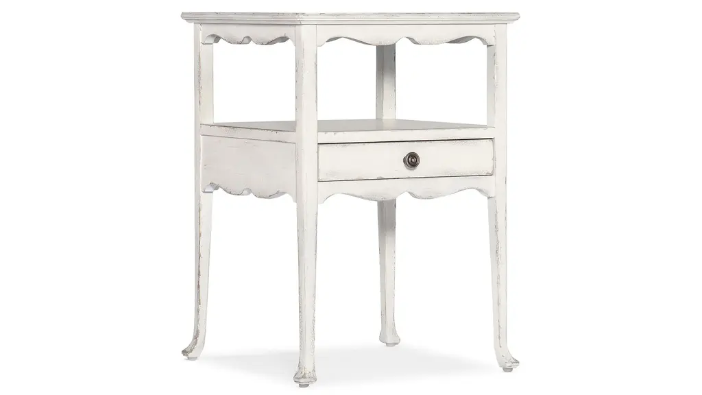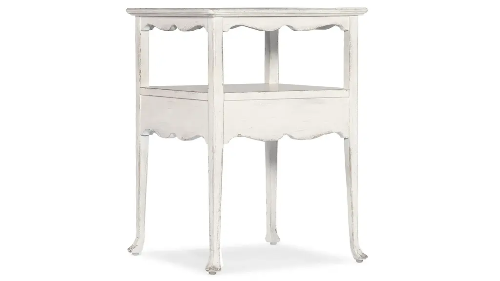 Capturing the vintage charm of the coastal South, this delightful Charleston Accent Table is crafted of Maple Veneers and has scalloped accent trim. The one drawer has self-close drawer guides and a designer gray interior. The finish is Magnolia White, a color originally crafted from the purest limestone and used to paint the pillars, posts and fences of classic southern homes. The table is finished on all sides so it can float in a room. The round pull knob is in an antique bronze color.