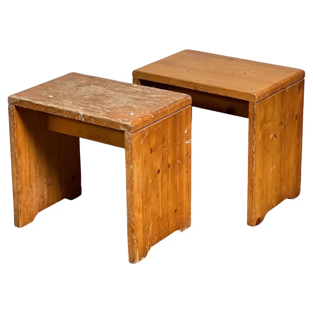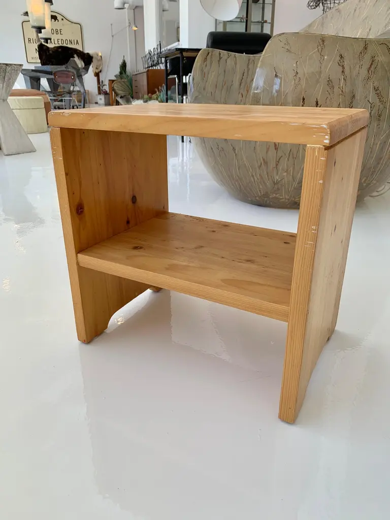 Classic pine side table/stool designed by Charlotte Perriand for the Les Arcs Ski Resort in France. Great lines. Good vintage condition. Super functional with inset shelf to be used as a side table. Extremely sturdy and able to be used as a stool as well. Cool piece of collectible design. 11 still available. Priced individually.