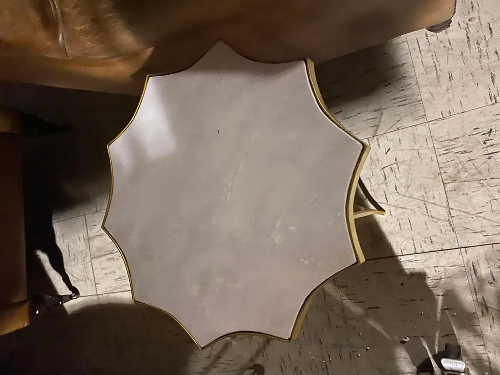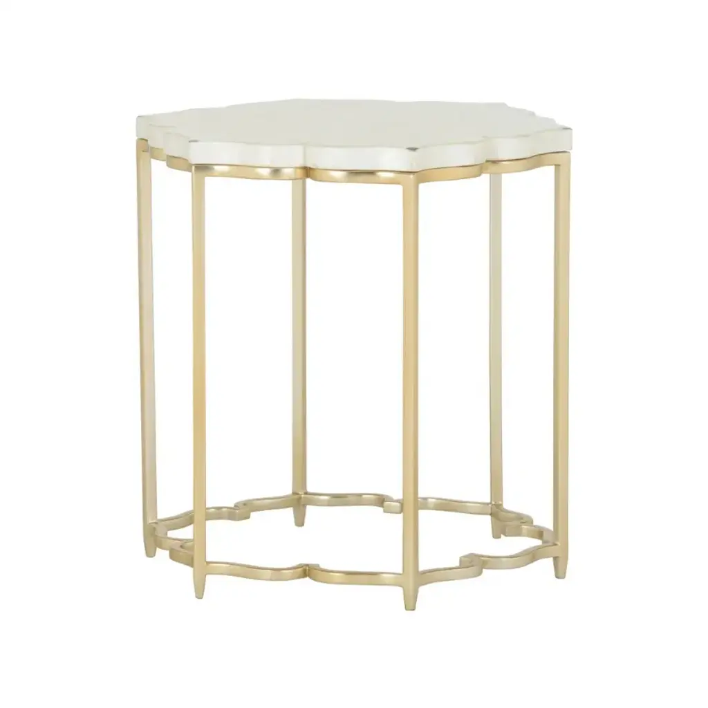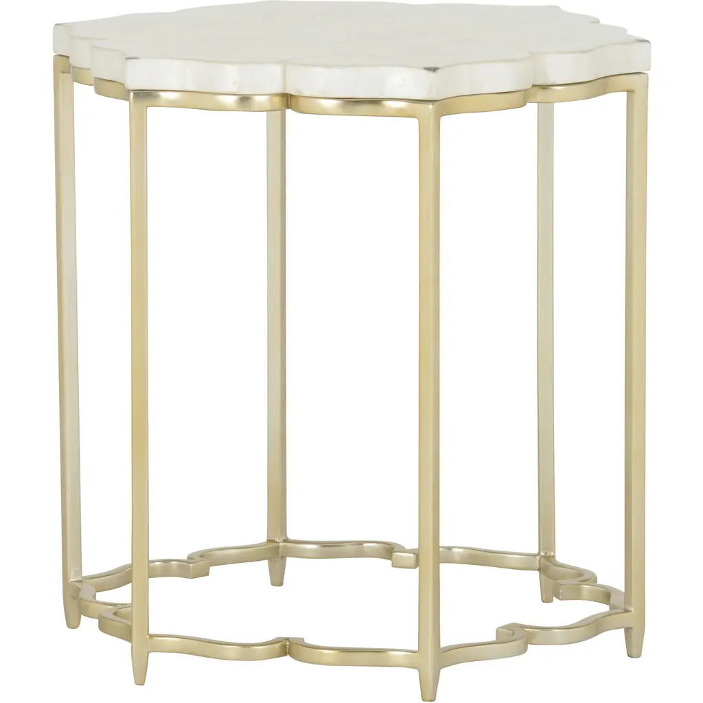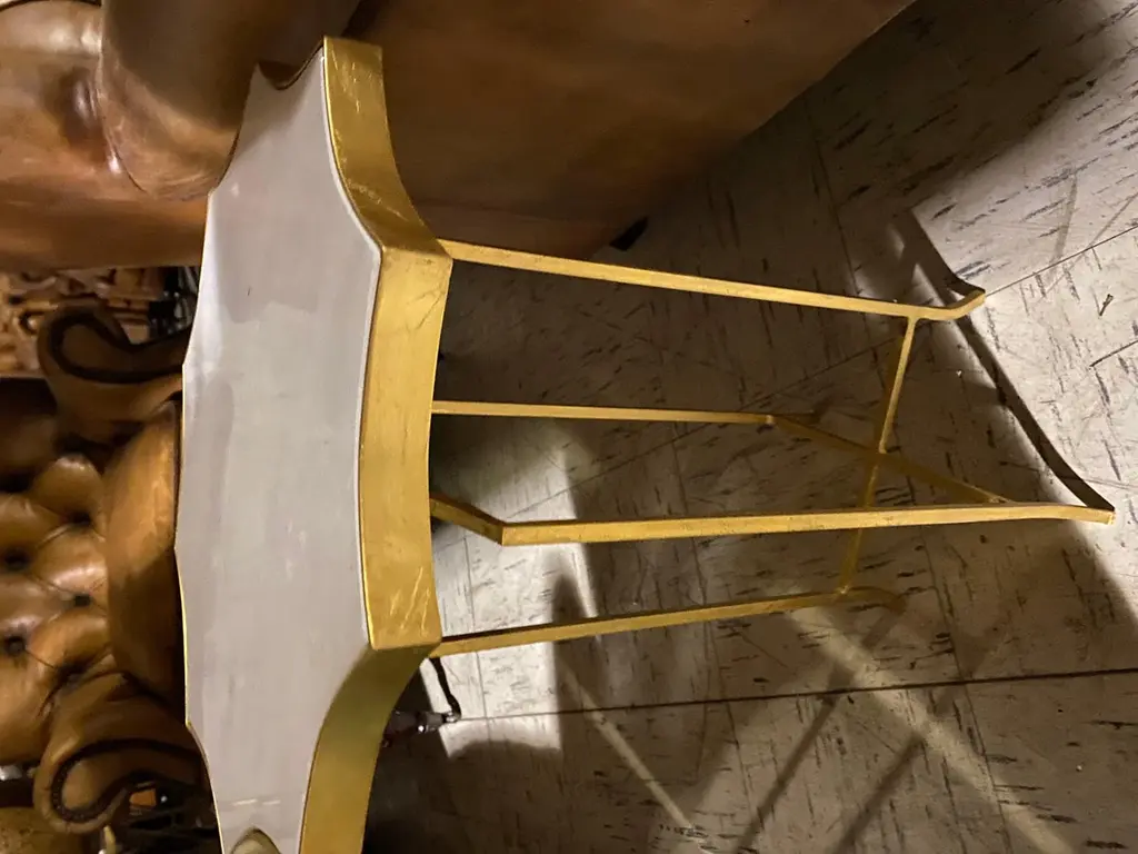 Charming pair of diminutive drinks tables in the style of Maison Baguès. Gold leaf iron frame with white marble inset top. Priced per table. Excellent condition