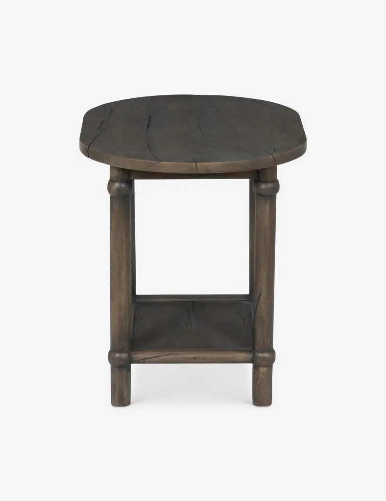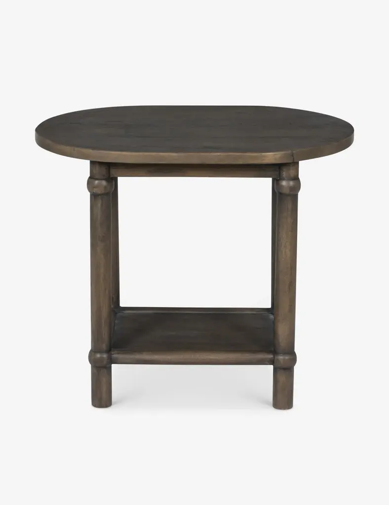 Four Hands brings their exceptional craftsmanship to a timeless collection rooted in Amber Lewis' perennial California style. Blending vintage and modern design elements, this wood end table is an inviting accent piece. The side table's oval top is curved and refined, while a full lower shelf adds a perfect place for books and decor.