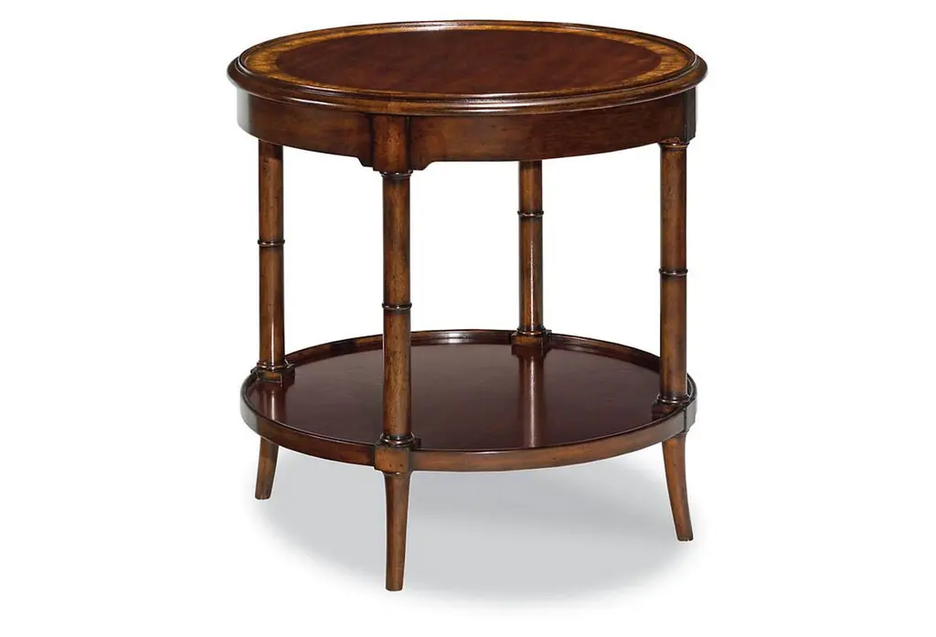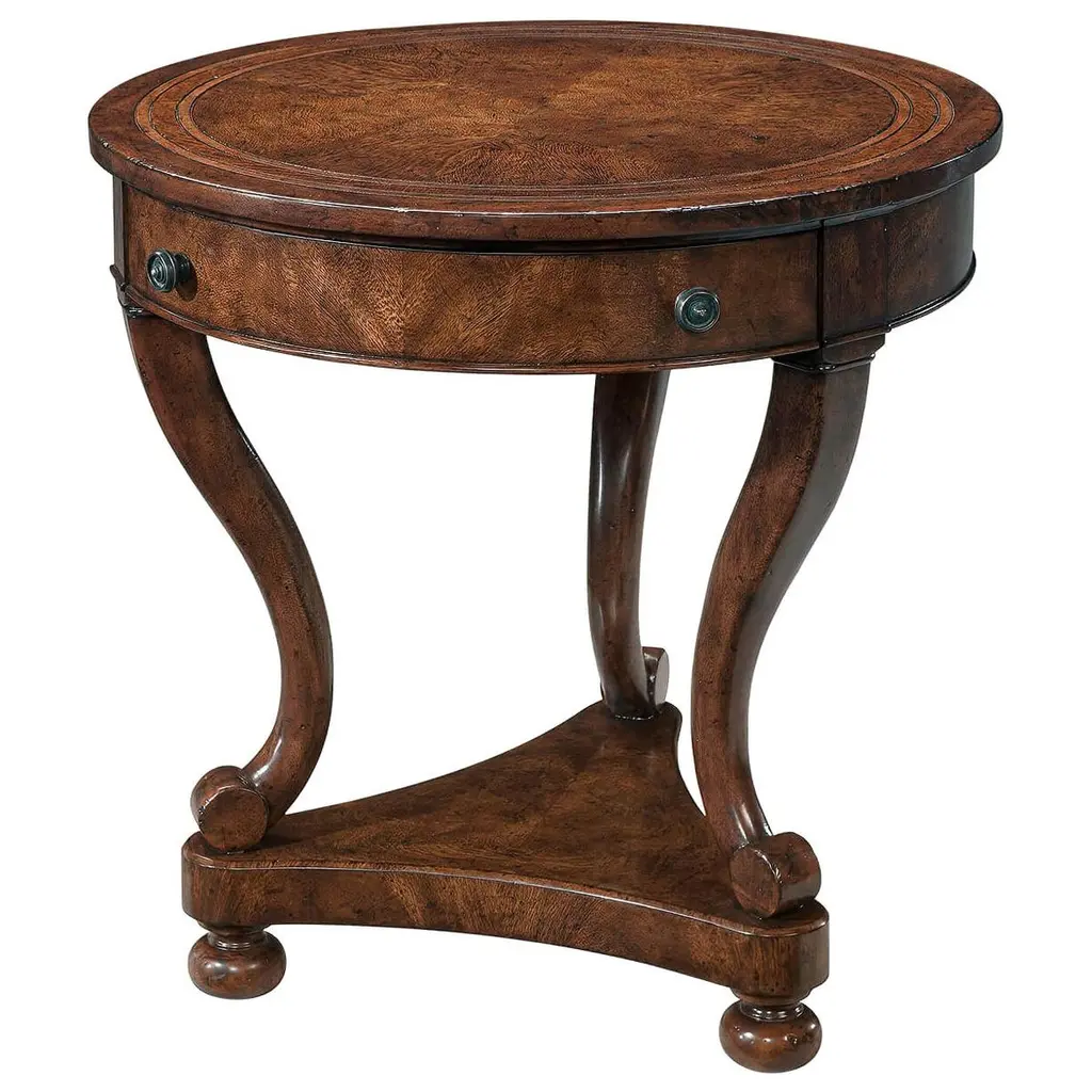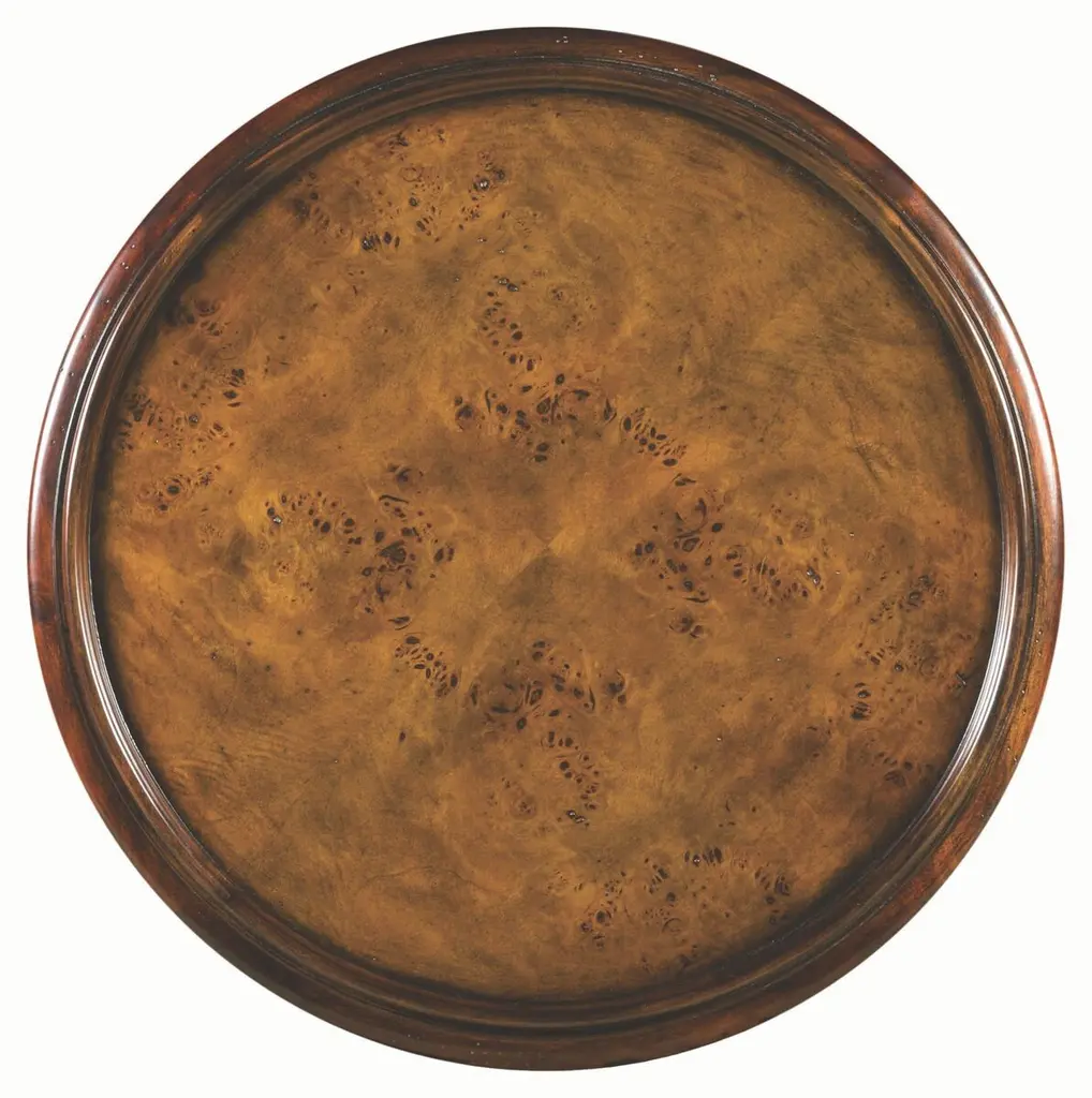 Inspired by 19th-century English Regency designs, this handsome side table is crafted of hardwood solids and mahogany veneers with an expressive mappa burl-veneered galleried top and lower shelf joined by turned legs.