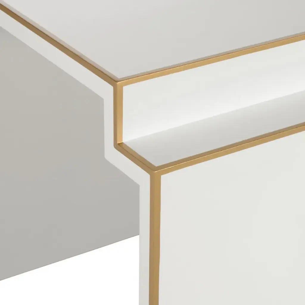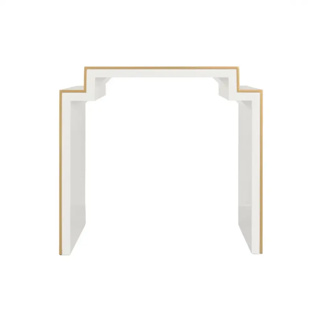THE CHATSWORTH SIDE TABLE IN WHITE IS THE END TABLE VERSION OF OUR VERY POPULAR CHATSWORTH COCKTAIL TABLE. WHITE LACQUER ON WOOD WITH GOLD DETAILING. BY DESIGNER ELIZABETH WICKER.