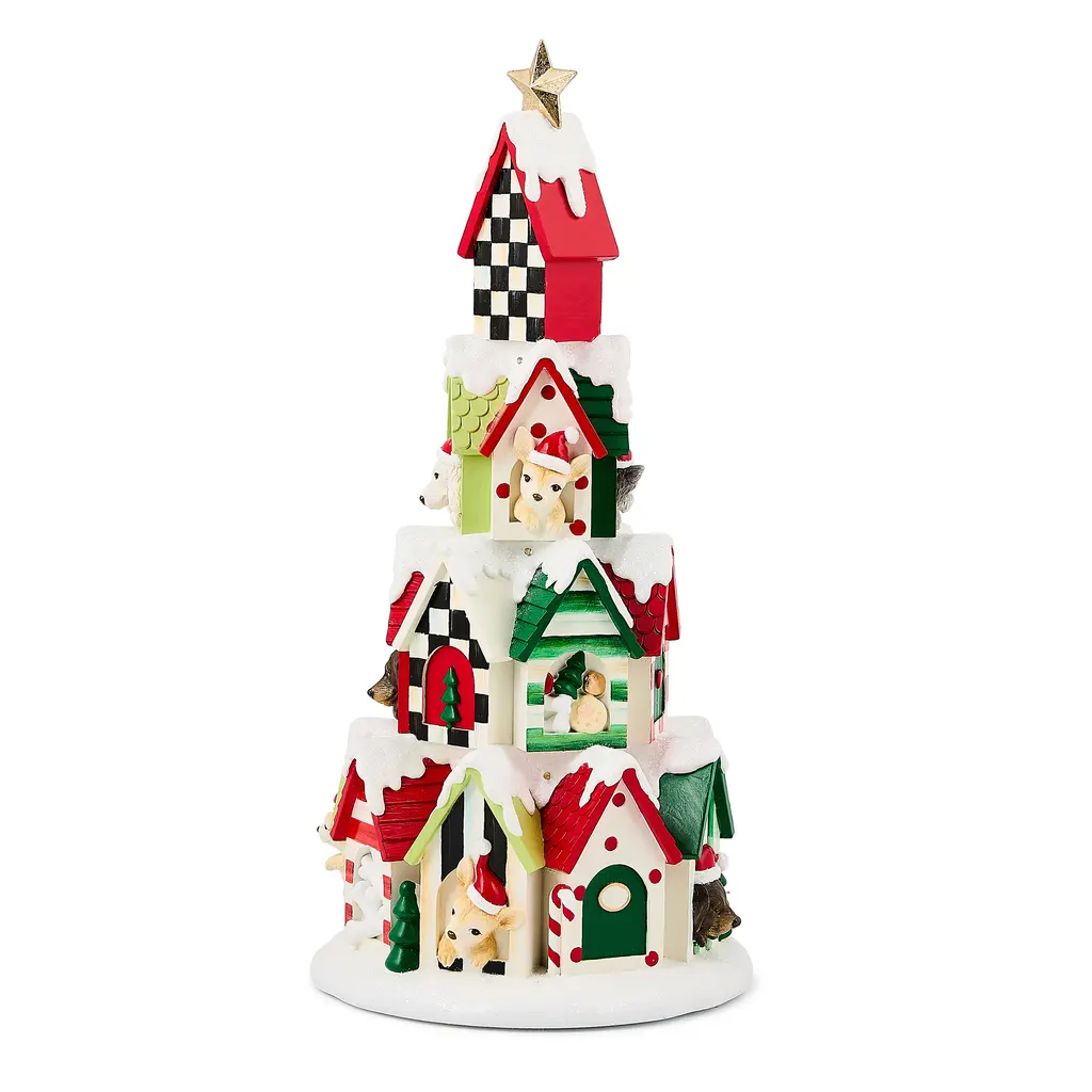 Add MacKenzie-Childs signature charm to your Christmas season with the Check It Out Illuminated Dog House Tower. The perfect gift for dog lovers, this model shows charming pooches sticking their heads out of snow-covered dog houses, accented with our beloved check patterns and vibrant Christmas colors. Beautiful on an end table or mantel alongside your stockings for a cheerful holiday display. Illuminates with batteries.