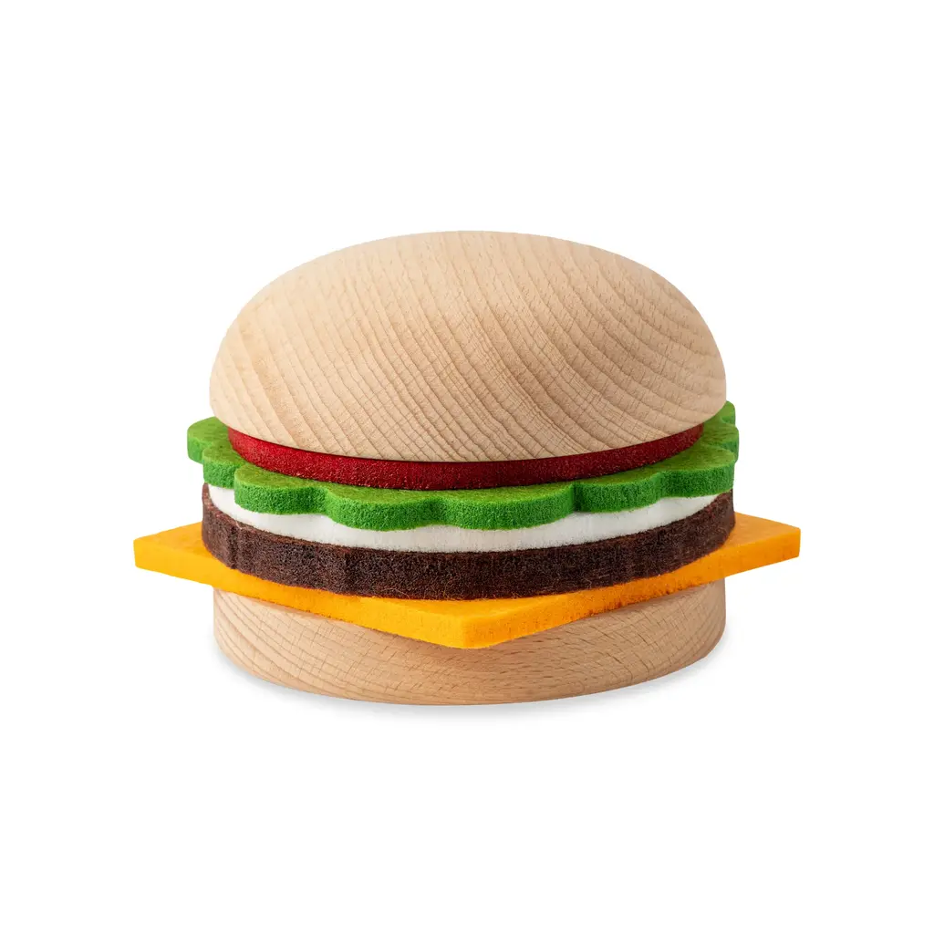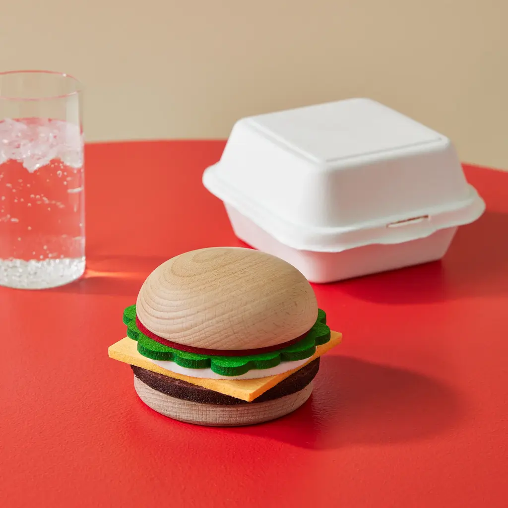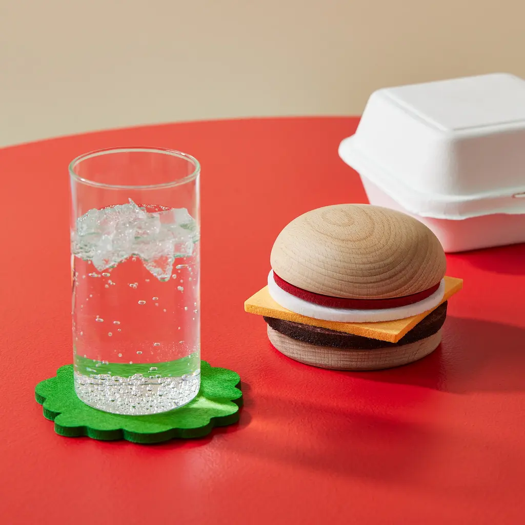 Watch your guests smile as you place their cocktail glasses on a deconstructed cheeseburger. Inside this design’s beechwood bun are five felt coasters shaped like various components of a cheeseburger with everything: meat patty, cheese slice, lettuce, onion slice and a splat of ketchup. When re-assembled, the burger becomes a delightful object you’ll want to display in your kitchen or on a side table. Comes packaged in a classic take-out box with burger wrapper. The Cheeseburger Coaster Set measures 3h x 4”diam. Examples of food sculptures are represented in MoMA’s collection by the work of Claes Oldenburg.