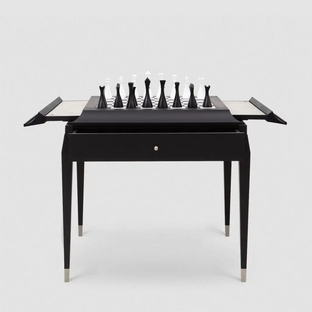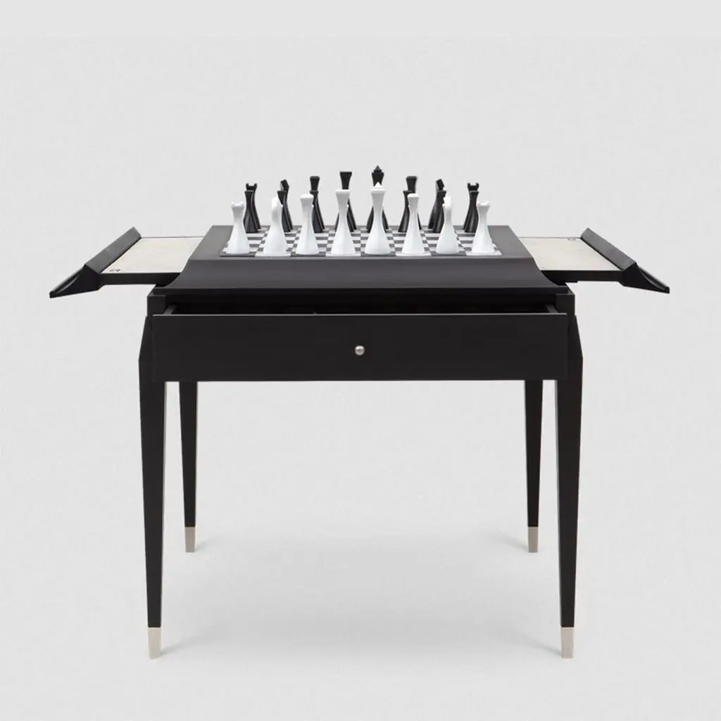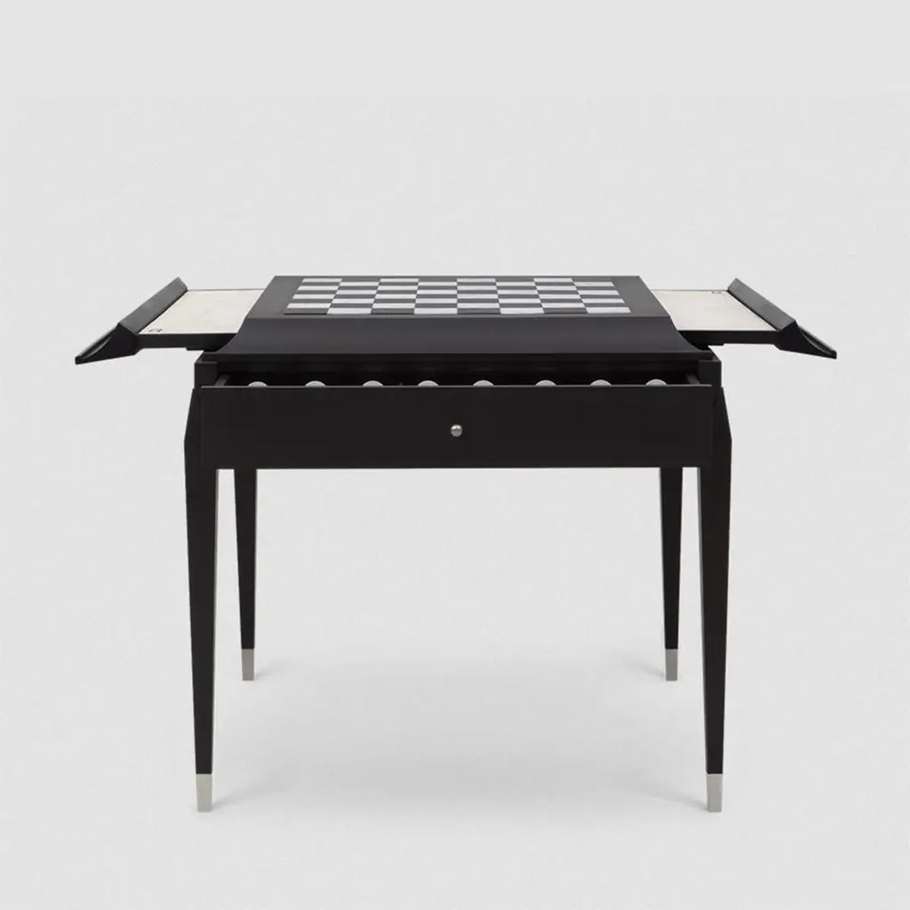 Side Table Chess Black with structure in solid mahoganyblack matte finish. With brushed nickel end feet.With checkerboard top in Nero Marquina and white Carrara marble. Side table Includes 2 drawers and 2 shelves.It includes two chess set pieces in solid carved mahogany wood in black and white finish.