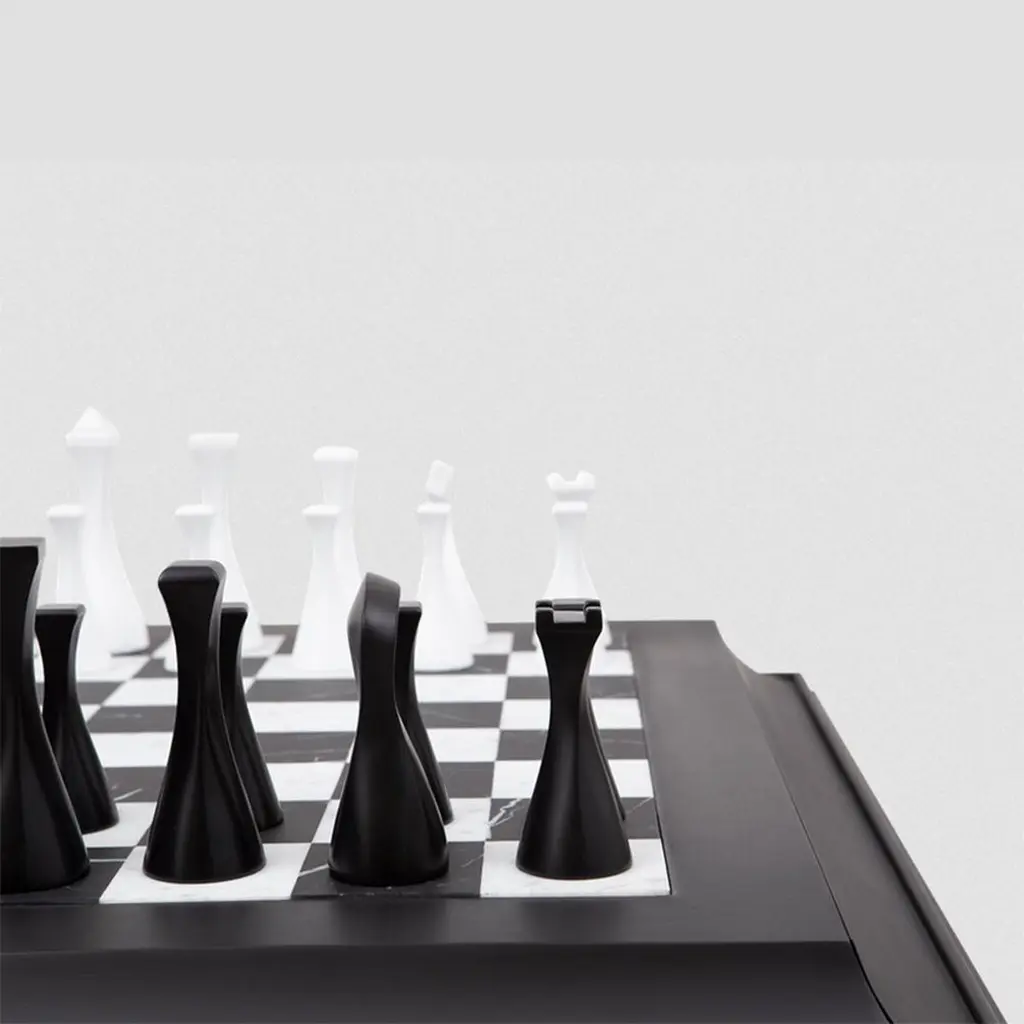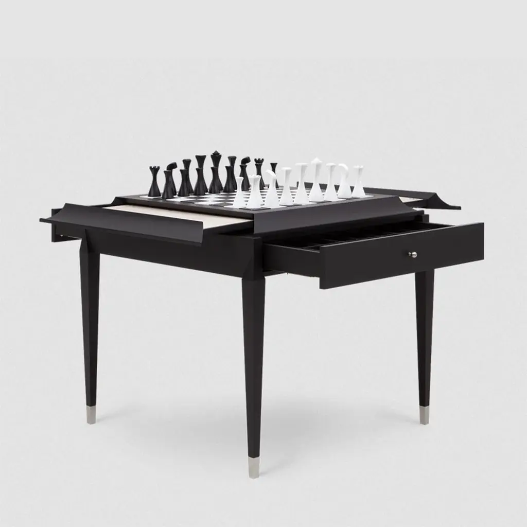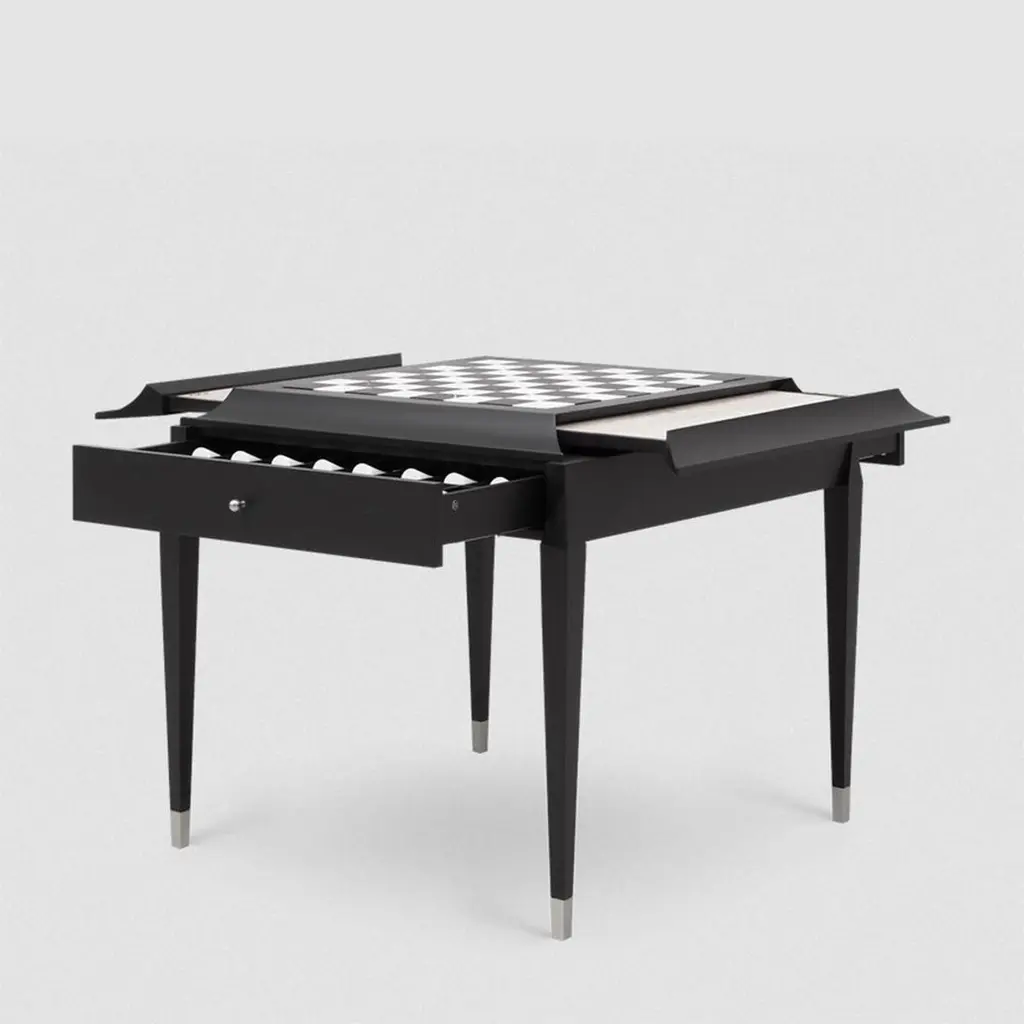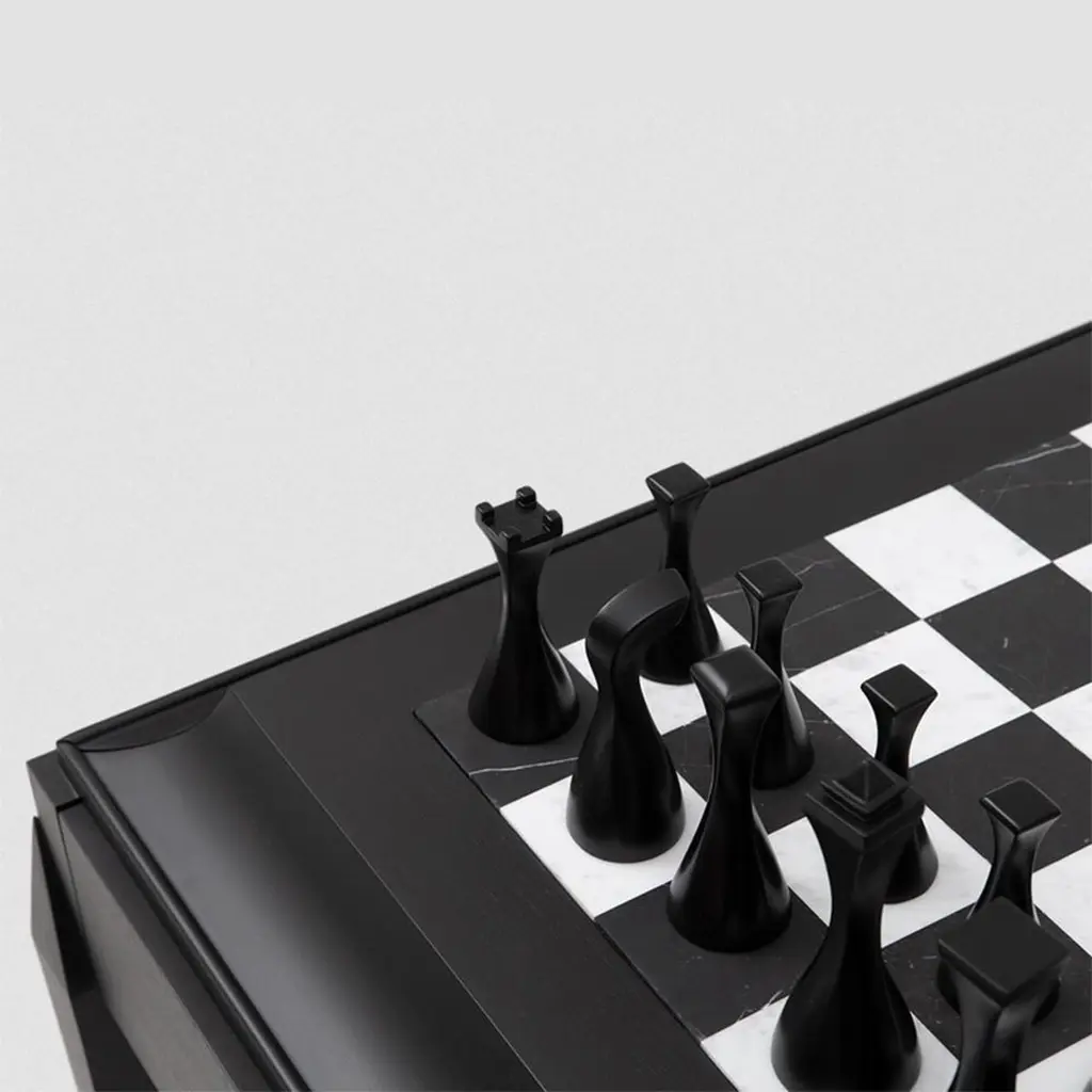 Side Table Chess Black with structure in solid mahoganyblack matte finish. With brushed nickel end feet.With checkerboard top in Nero Marquina and white Carrara marble. Side table Includes 2 drawers and 2 shelves.It includes two chess set pieces in solid carved mahogany wood in black and white finish.