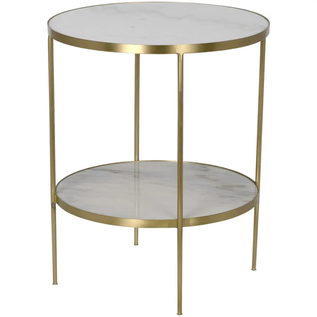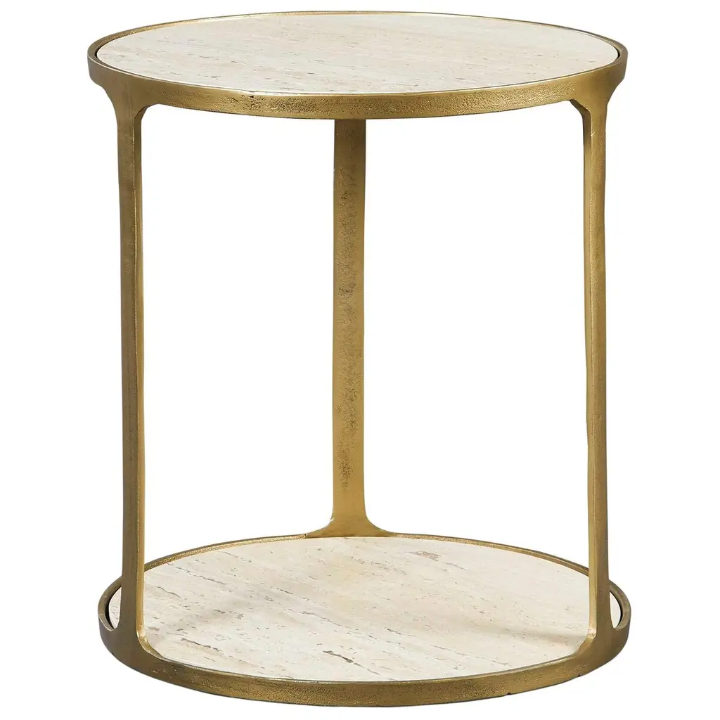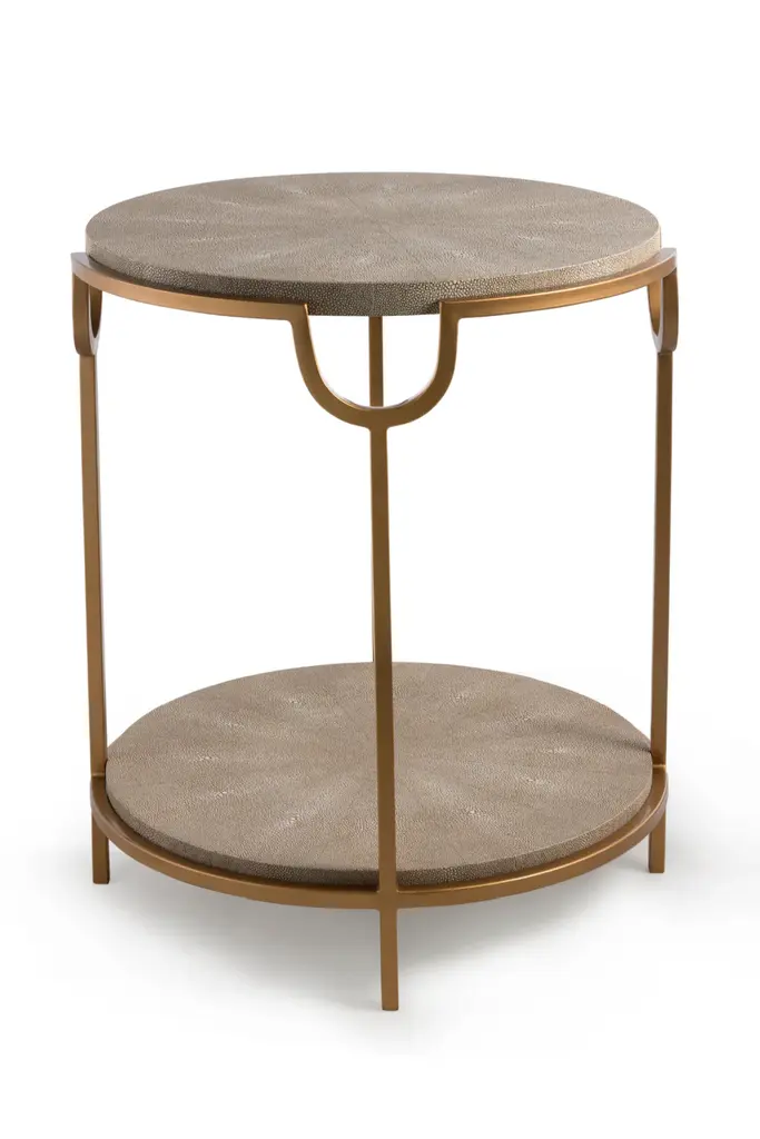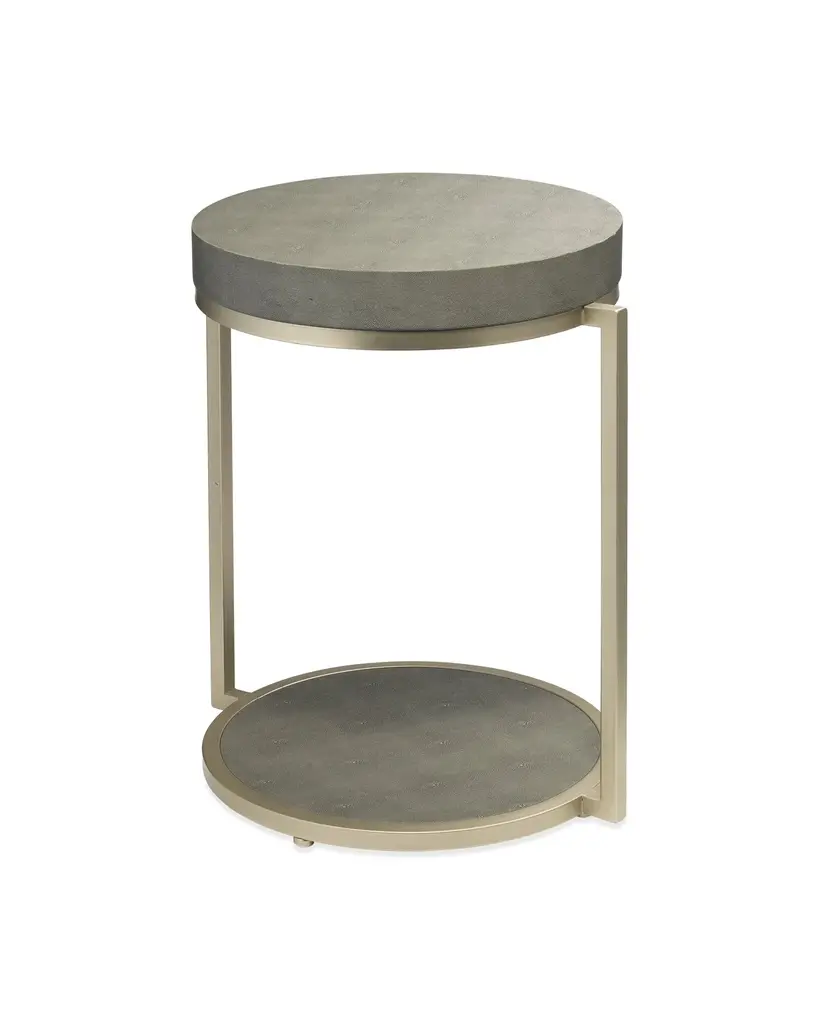 Add a designer-worthy touch to your space with this accent table. The airy metal base is made from champagne-finished iron and topped off with faux-shagreen. The stunning mix of materials makes for an eye-catching piece in any room.