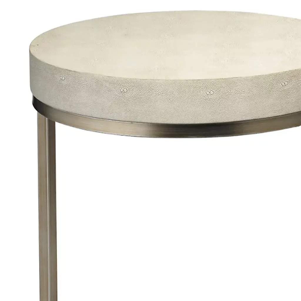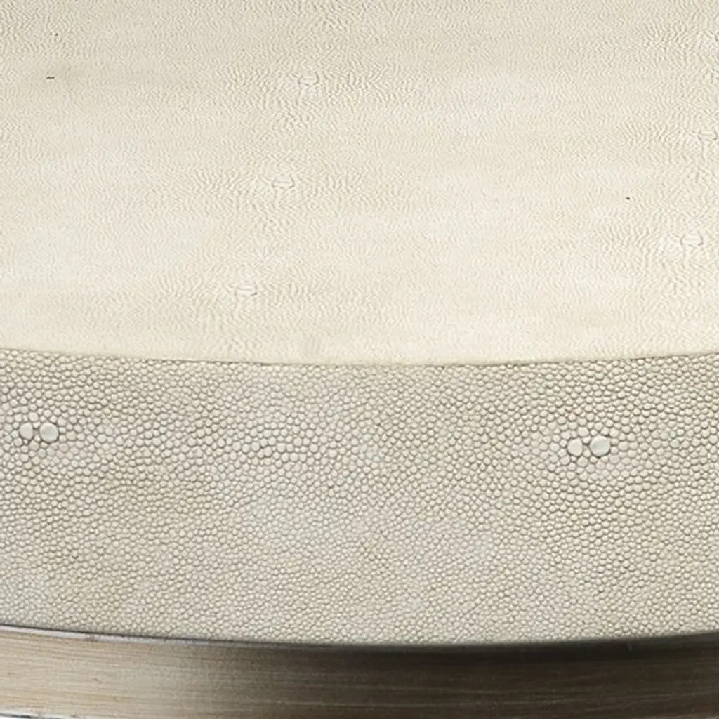 Provide style and storage to interiors with the Chester Round Side Table from Jamie Young. Set atop a strong iron base, it ascends from a circular base via two bracket-style arms, supporting a thick disc upper shelf above. Both the upper and lower shelves are surfaced in faux patterned leather, softening the physical form and adding an element of contrast to the ensemble, the vibrant leather standing out well from the smooth metal around it.