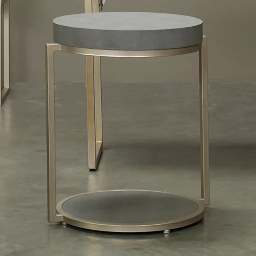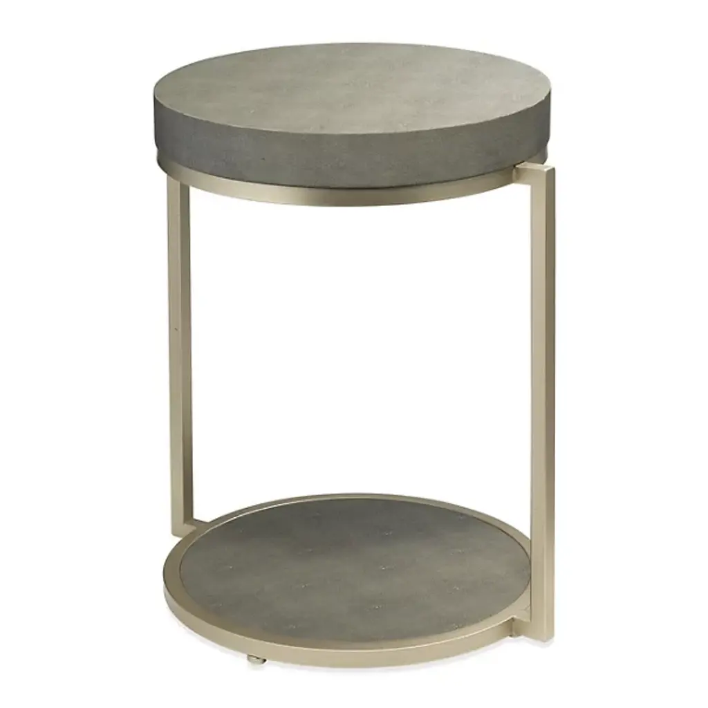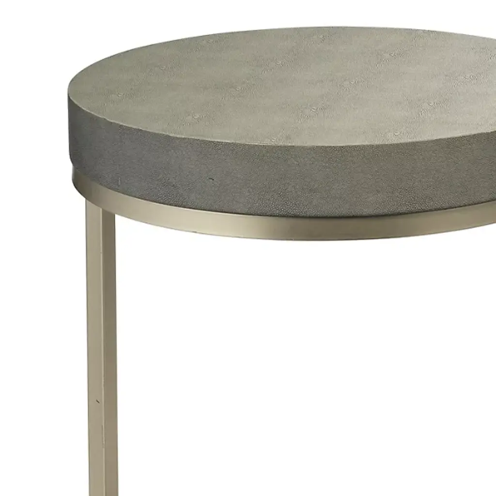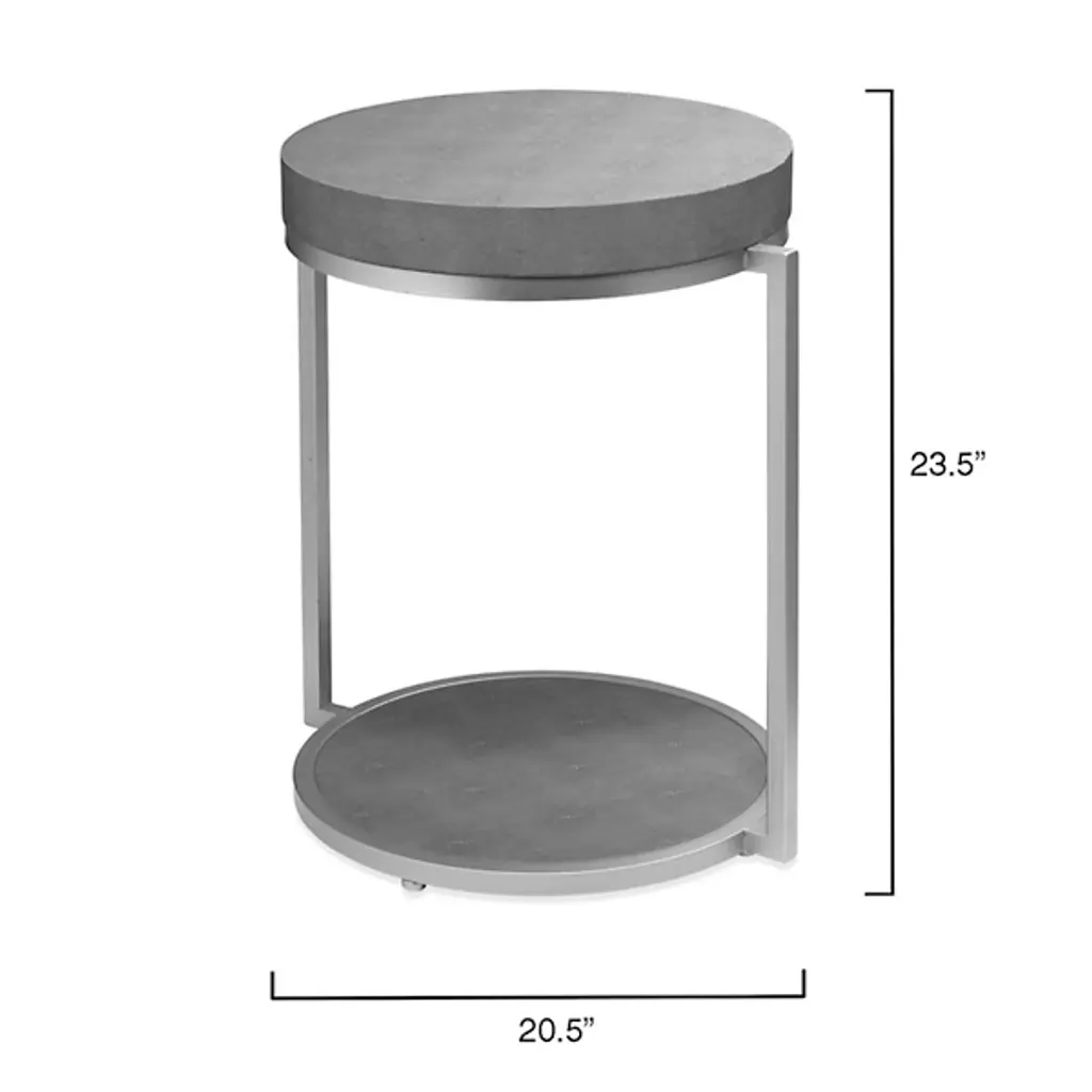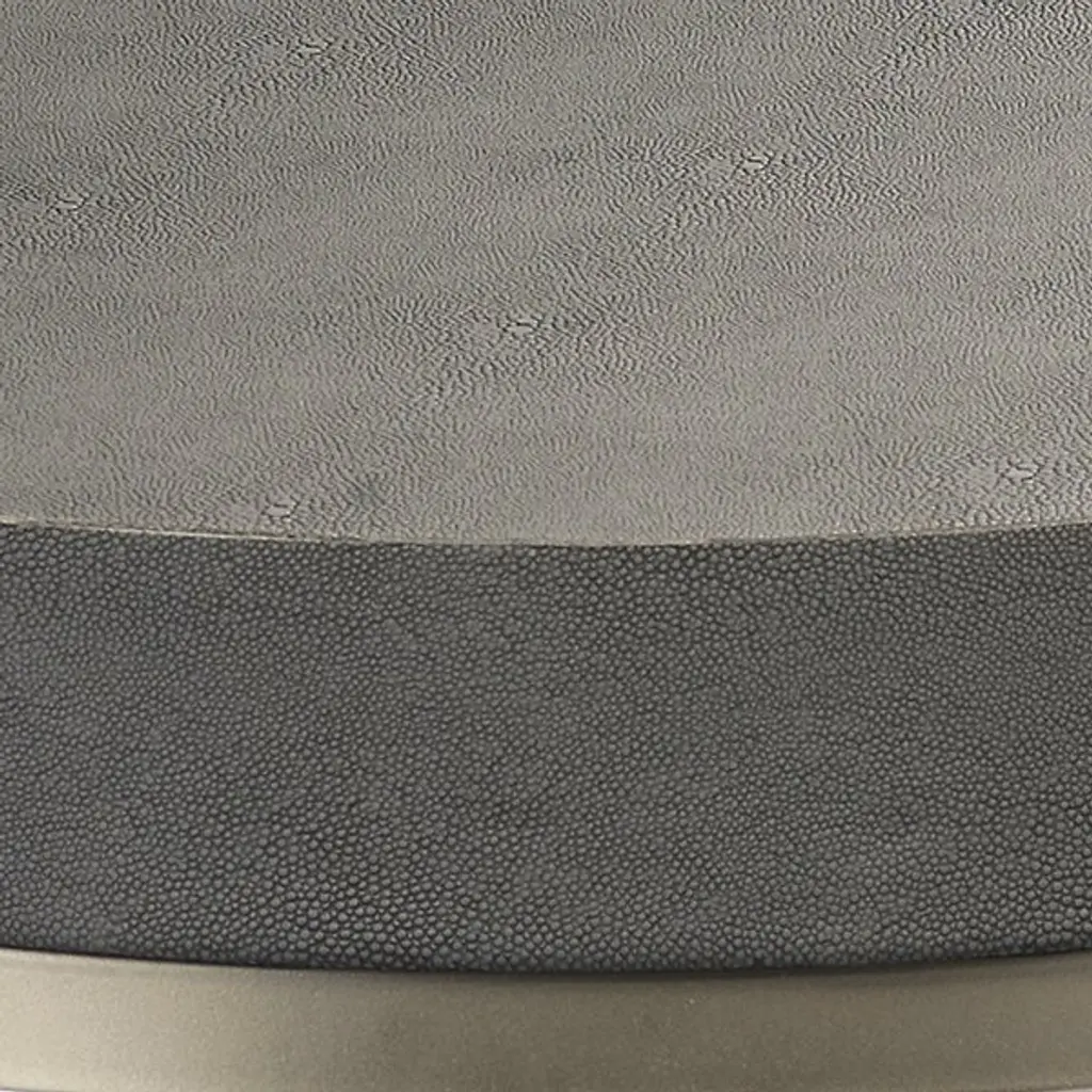 Provide style and storage to interiors with the Chester Round Side Table from Jamie Young. Set atop a strong iron base, it ascends from a circular base via two bracket-style arms, supporting a thick disc upper shelf above. Both the upper and lower shelves are surfaced in faux patterned leather, softening the physical form and adding an element of contrast to the ensemble, the vibrant leather standing out well from the smooth metal around it.