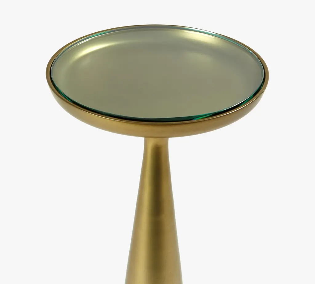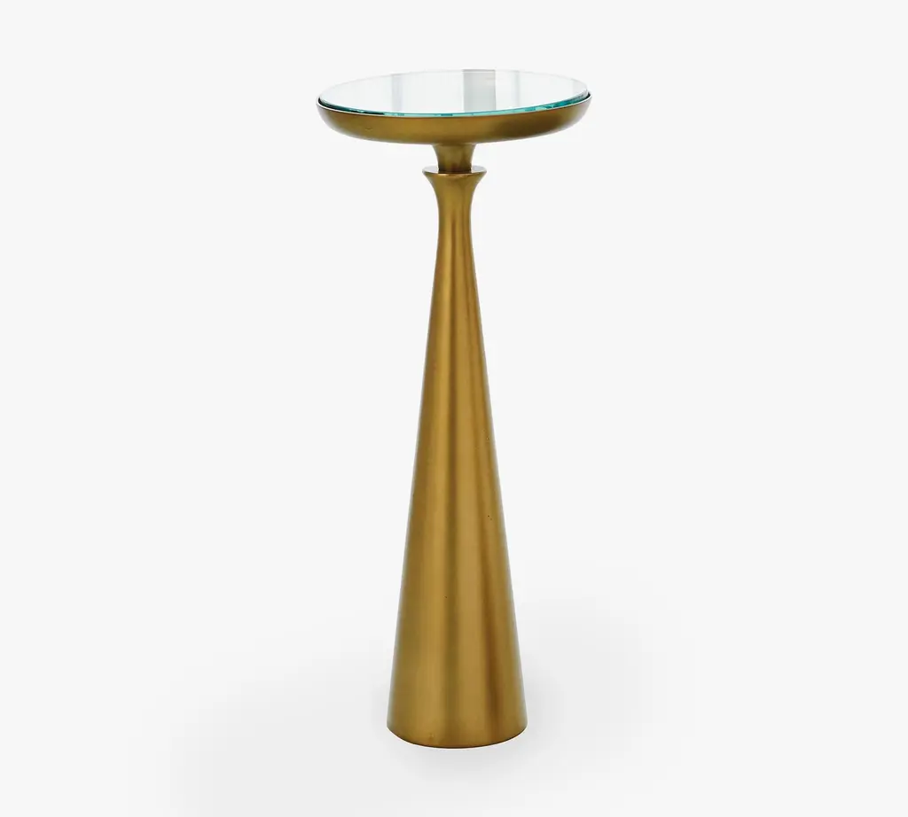Inspired by centuries-old Middle Eastern architecture, this accent table has a slender silhouette with striking style. Perfectly spun to achieve crisp, clean lines and hand-finished in Satin Brass, the table supports a thick glass top for a sophisticated, midcentury look. An accent piece that completes any room.