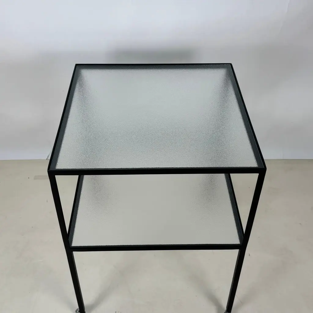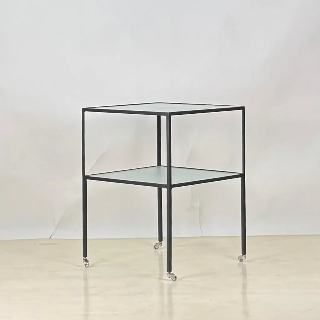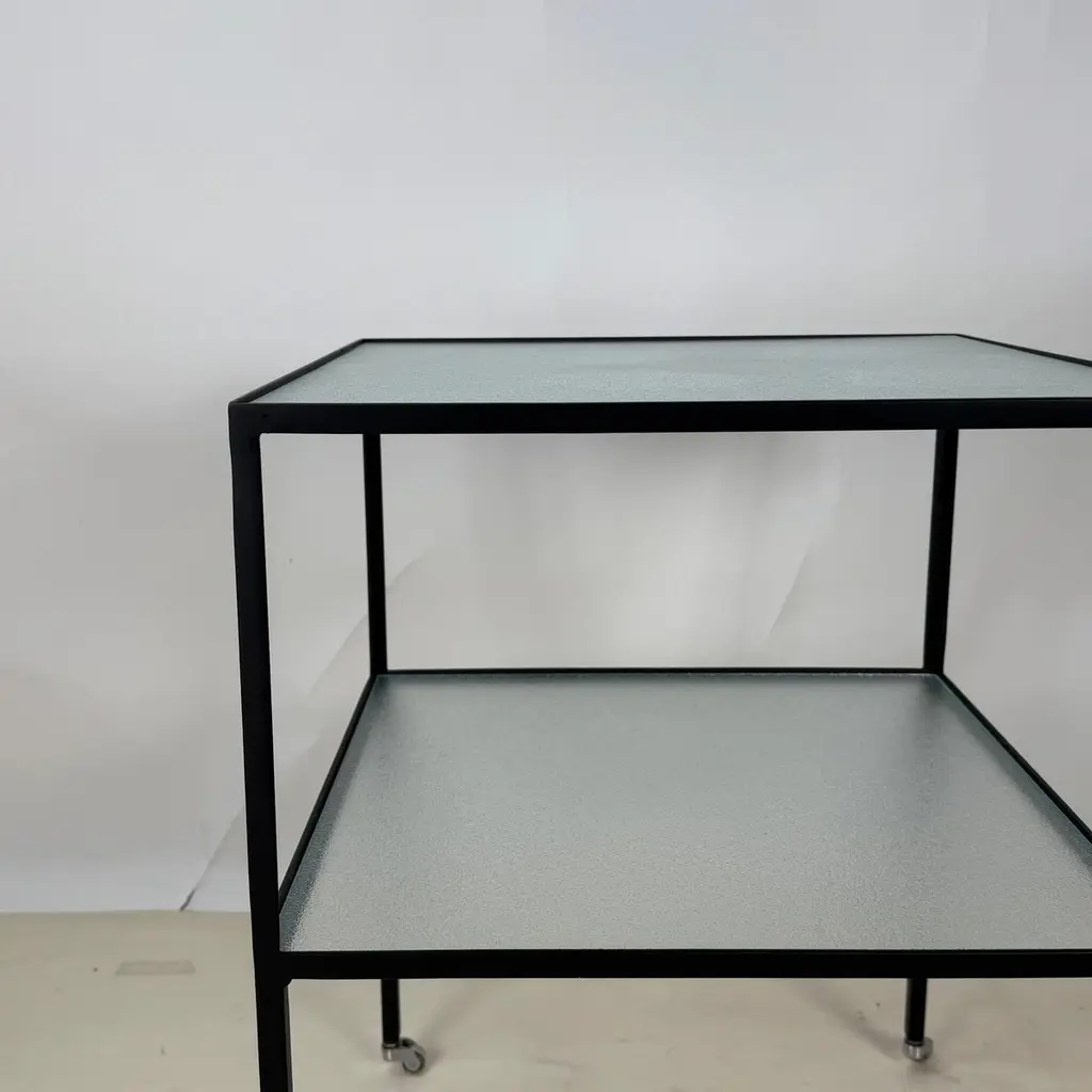 Chic Équilibre™ blackened steel and glass side table on chrome casters by Design Frères®.Great as a slender, discrete side table.Also available as a pair or more (see the separate listing or select quantity at check-out).