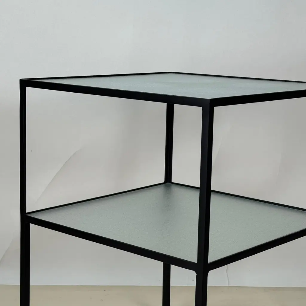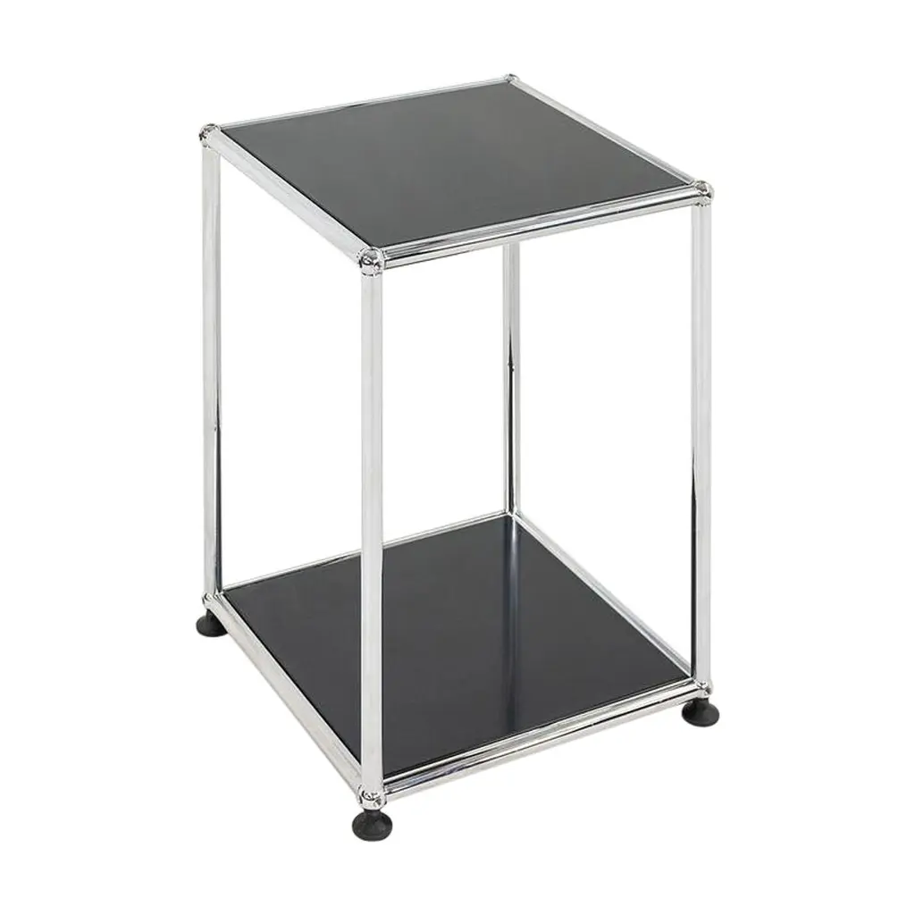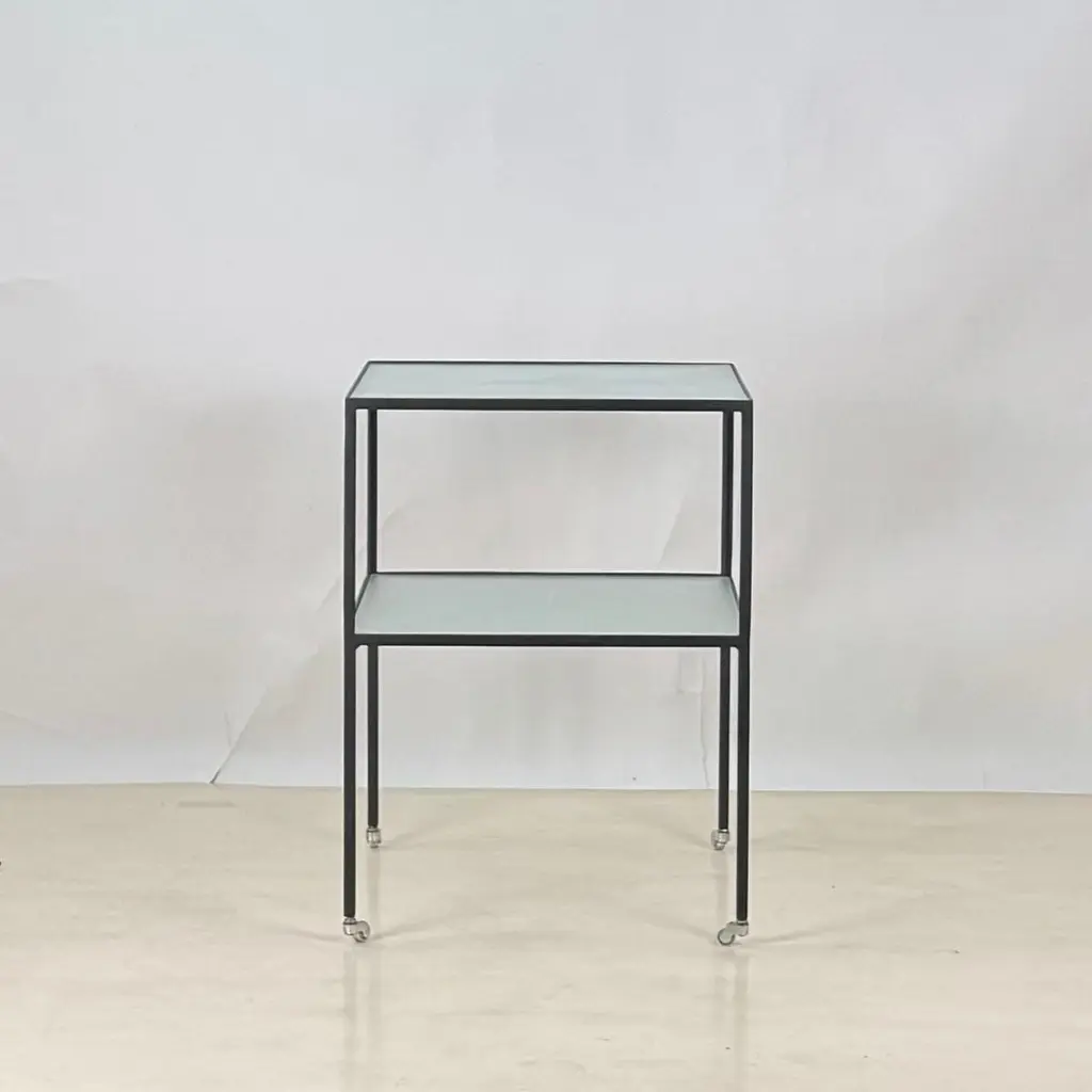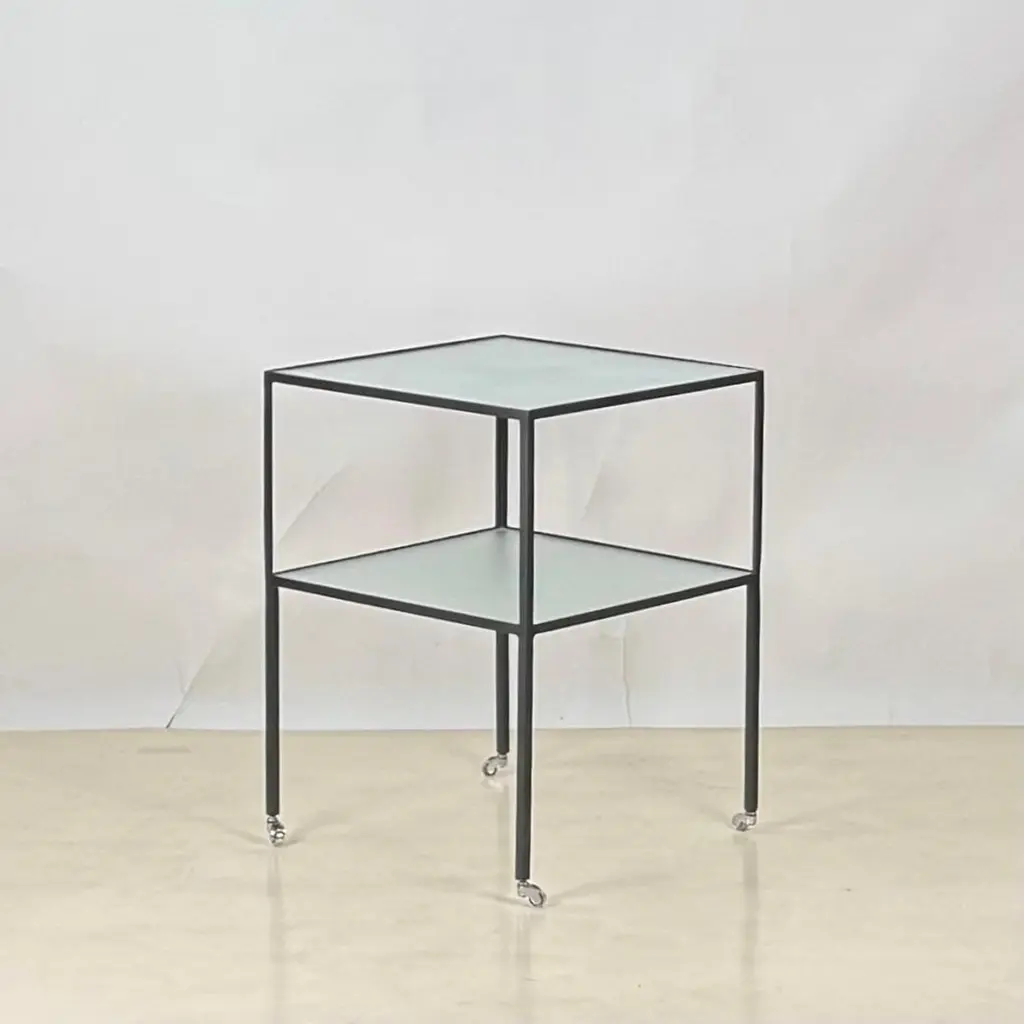 Chic Équilibre™ blackened steel and glass side table on chrome casters by Design Frères®.Great as a slender, discrete side table.Also available as a pair or more (see the separate listing or select quantity at check-out).