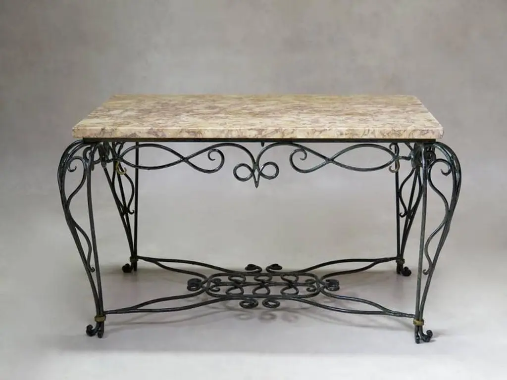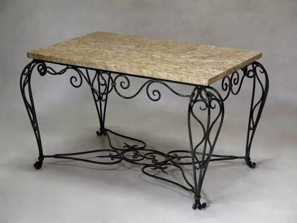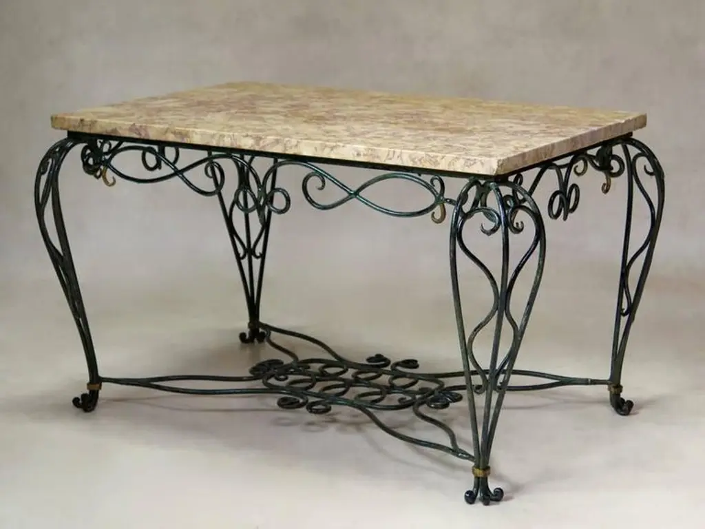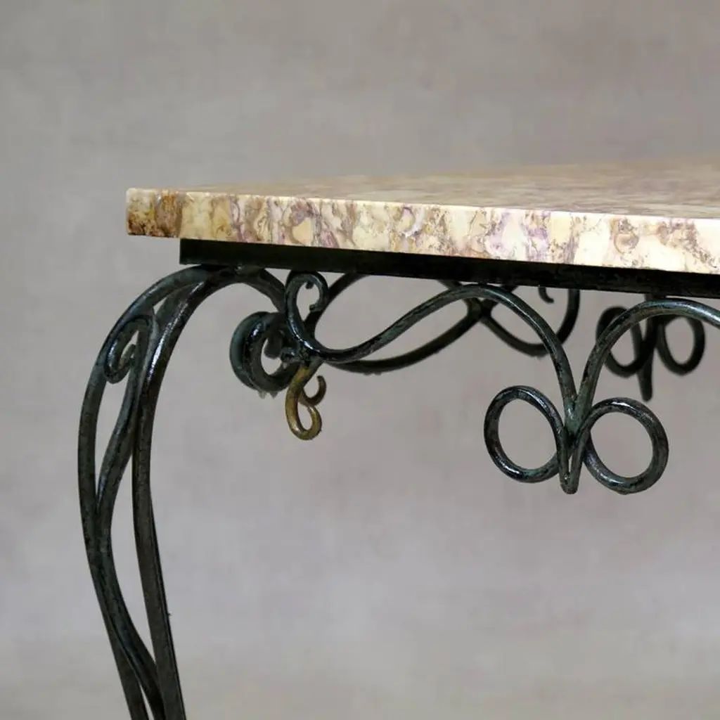 Very lovely, almost-pair of side or coffee tables. The wrought iron bases have elaborate curlicue motifs, and are painted dark green, with details picked out in gold. The design of the stretchers and aprons differ slightly. The tops are of yellow Brocatelle marble, veined with pinky-purple.Two available. Priced individually.