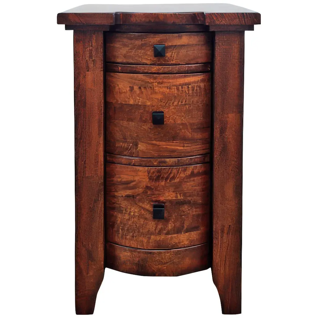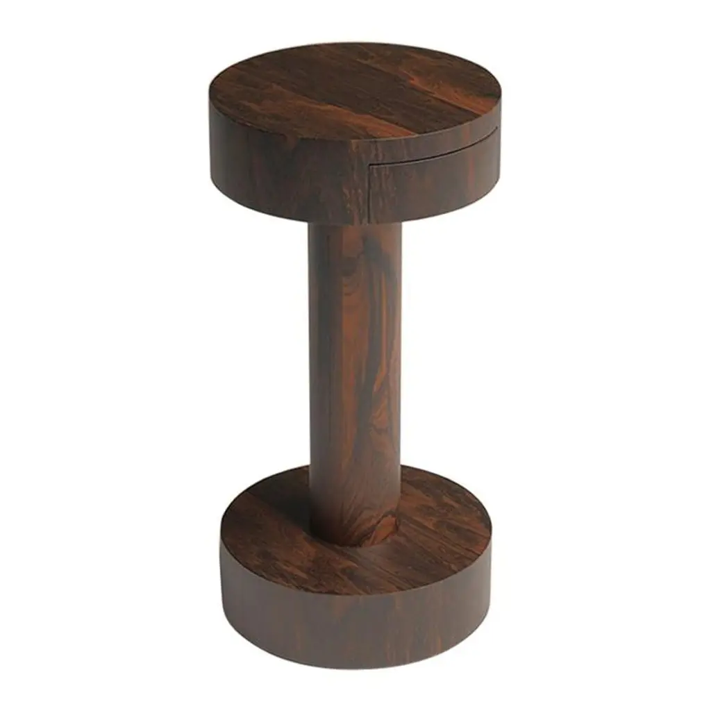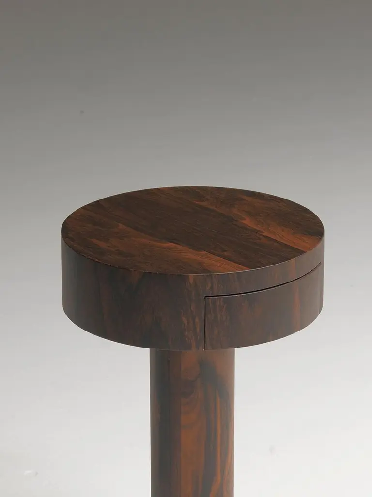 Chiodino is a round side table with a drawer, made of precious ziricote wood; designed by AldoCibic. A small table with unexpected proportions in fine dark wood with strong veins,an iconic shape that fits any environment.