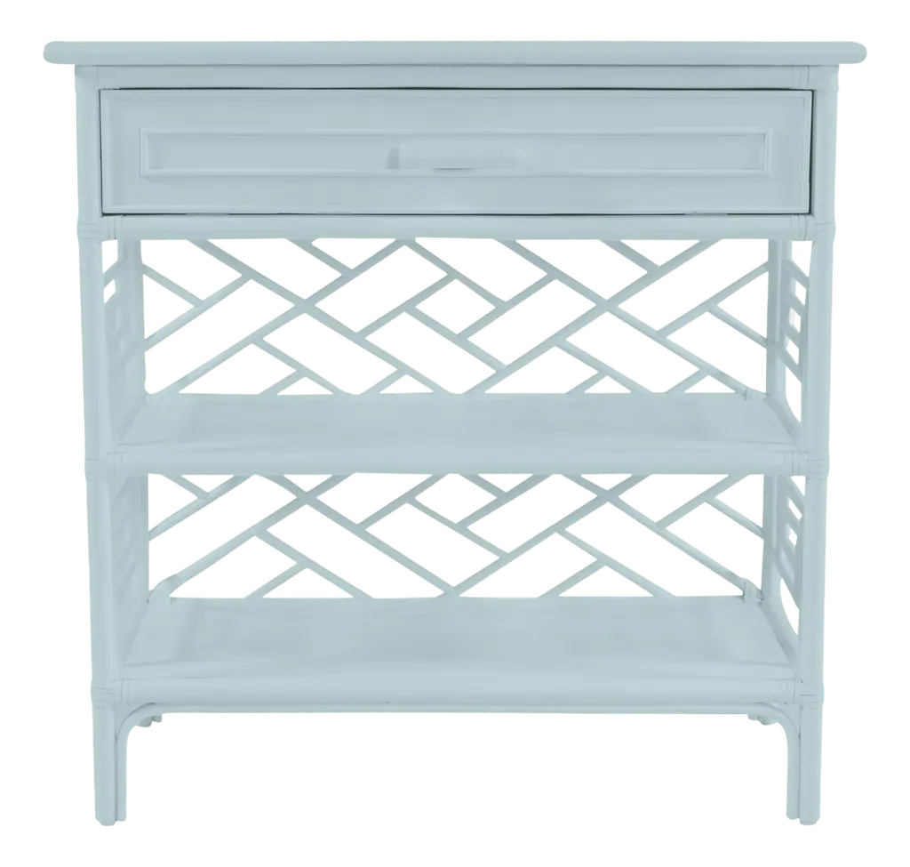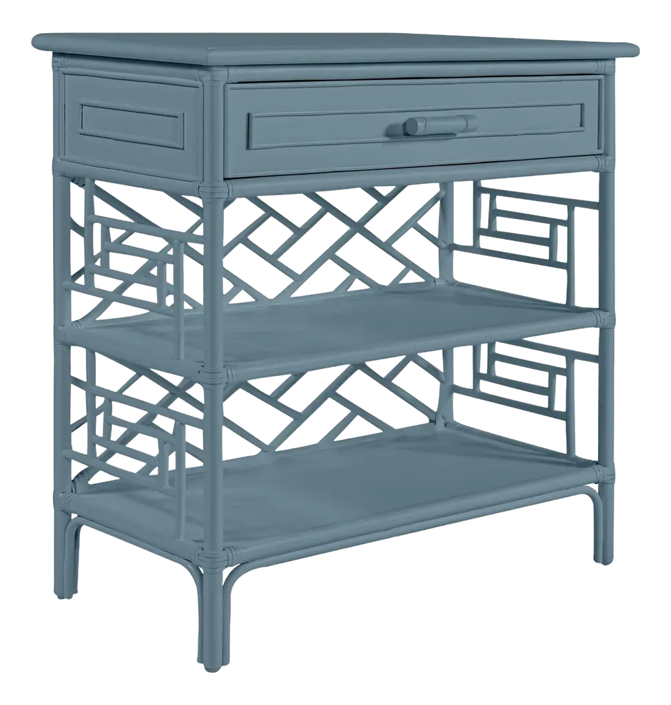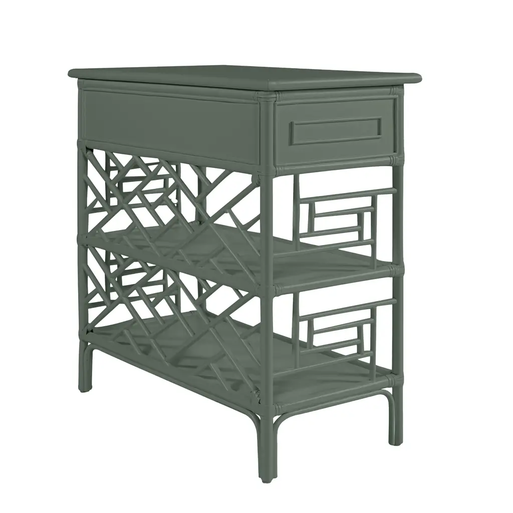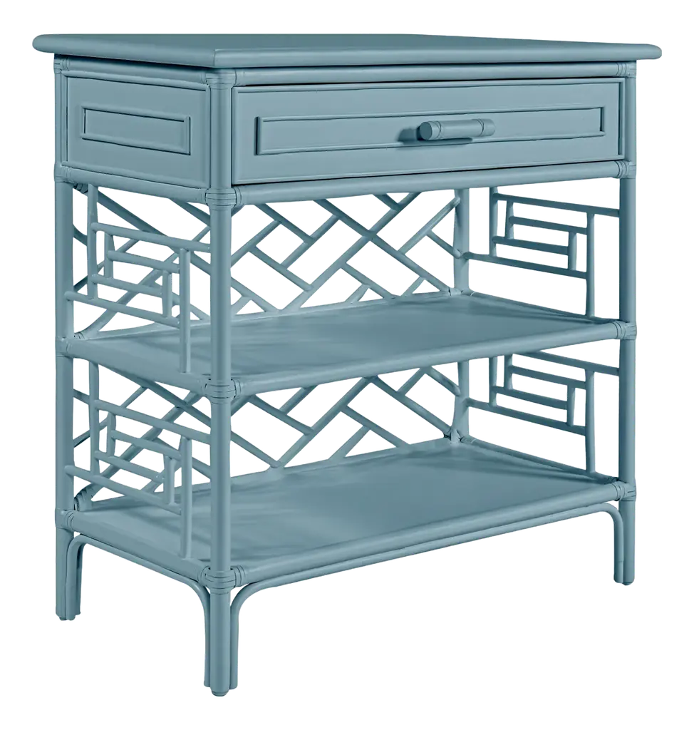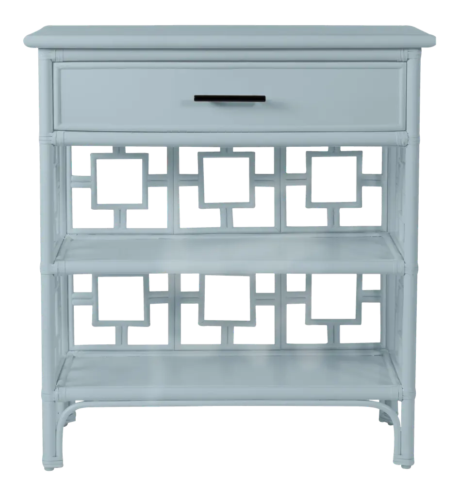 Elevate your living space with the timeless charm of the Chippendale End Table. The frame, crafted from rattan and leather bindings, brings a hint of natural beauty and artisanal charm to your living space while Its classic design brings an air of elegance. Featuring a spacious drawer and two open shelves, this piece not only enhances your décor but also offers practical storage for your essentials. The Chippendale End Table is the perfect blend of style, functionality, and eco-friendly design, making it a must-have addition to your home.