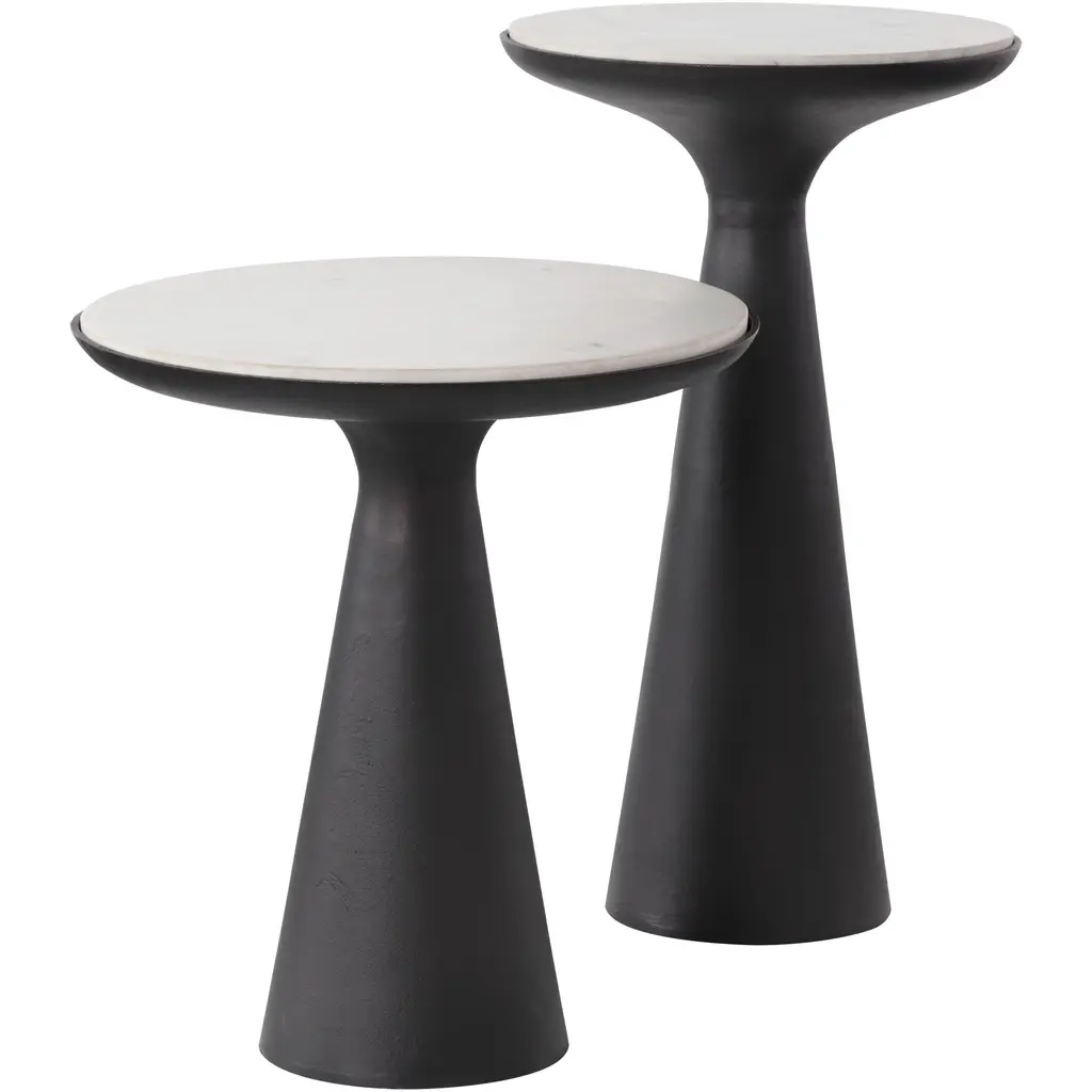 The Chizu Nesting End Tables play with proportions and complementary materials to make the perfect pair. Rounded white Banswara marble tops ensure each piece is unique. The plated aluminum bases feature a bronze finish and add uniformity.