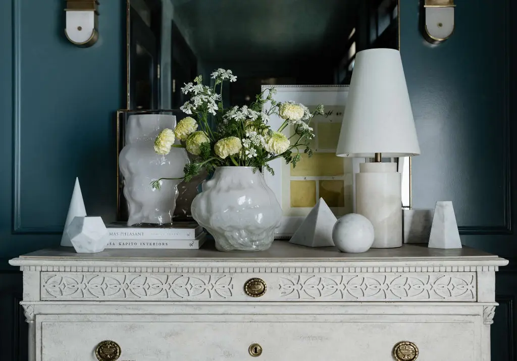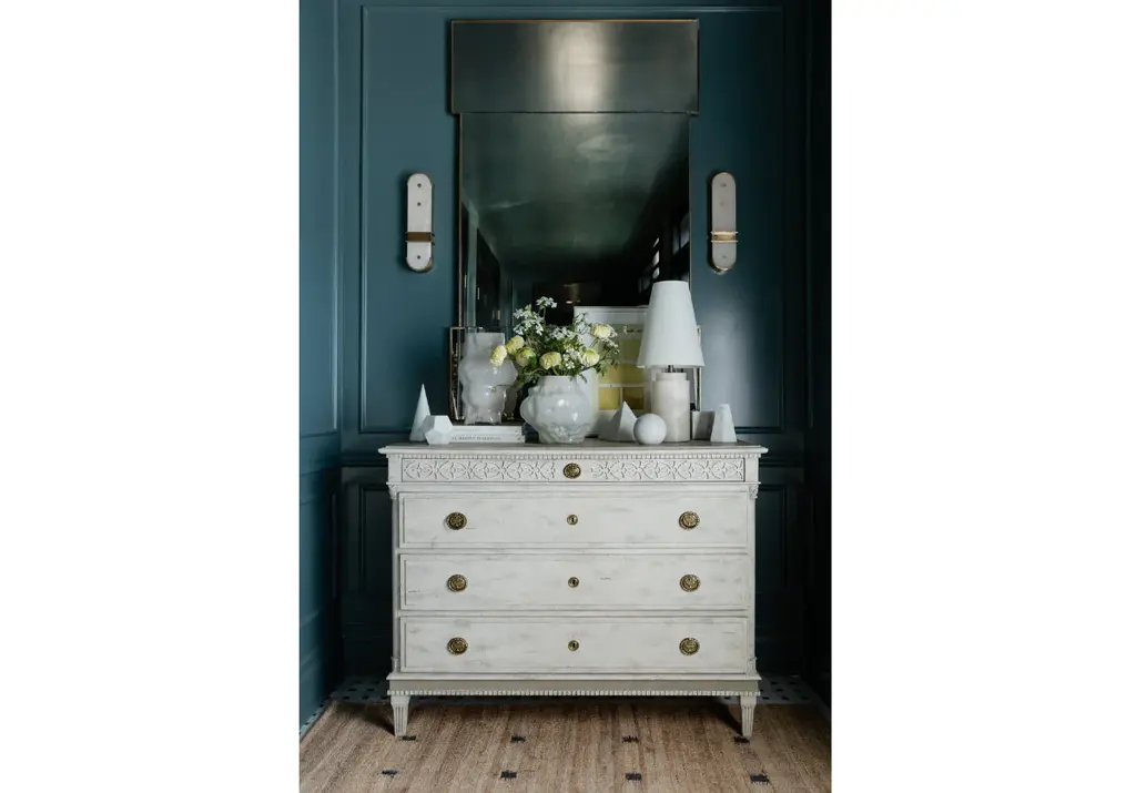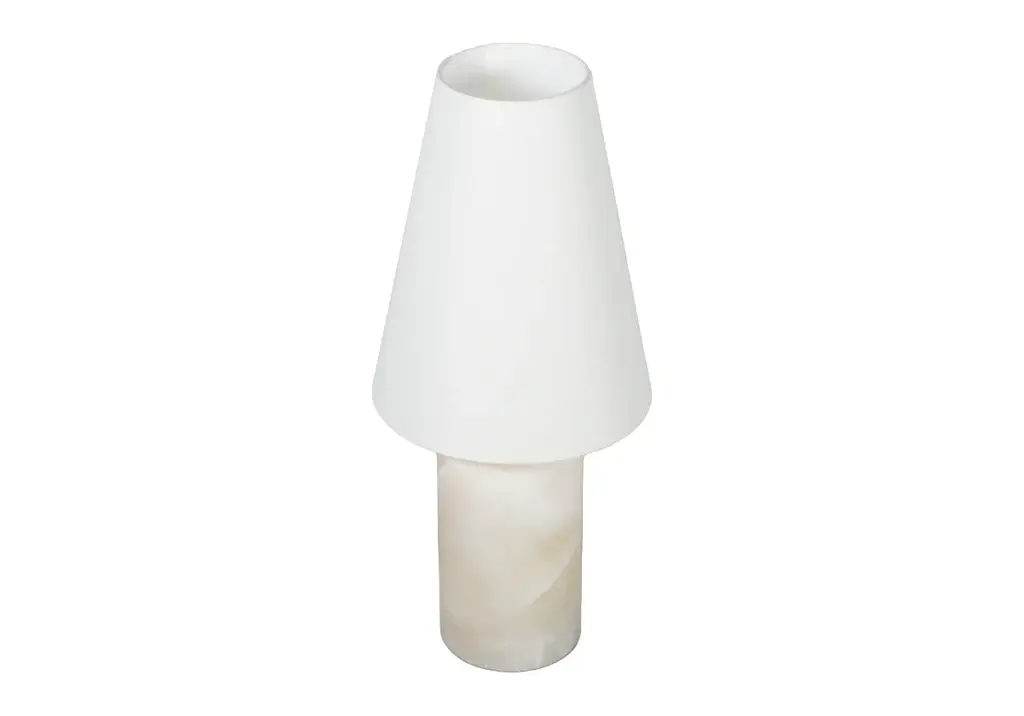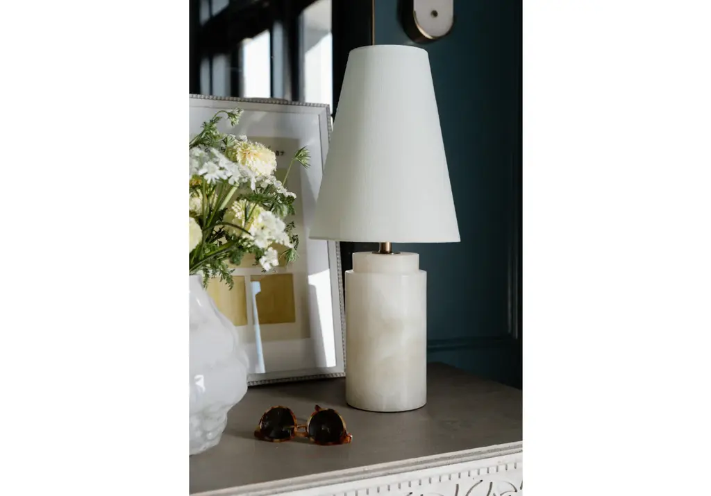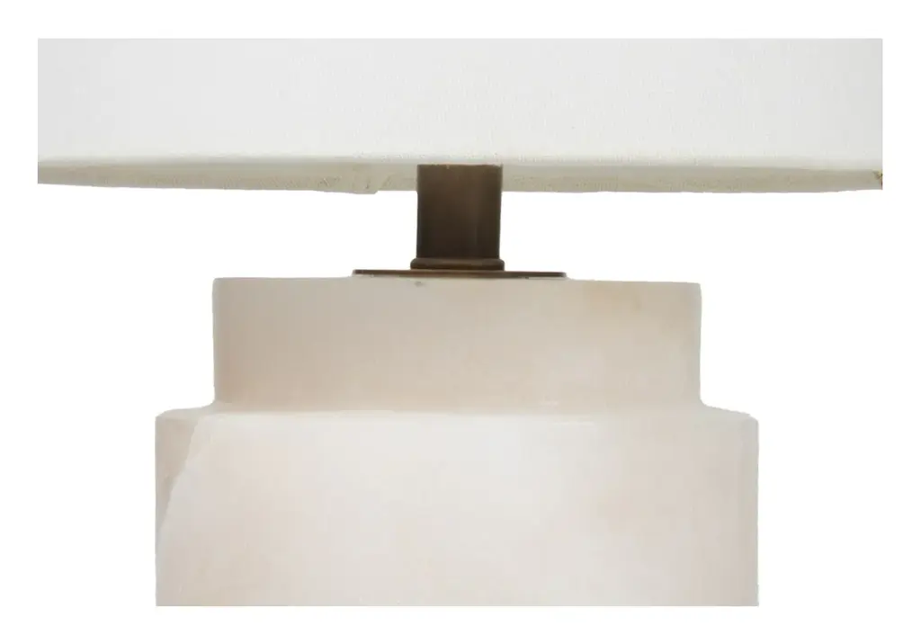 Simple yet chic, the Chloe Lamp is a solid alabaster column lamp with a stepped design narrowing at the top. Its steep linen shade complements its simple form, creating a refined, modern statement. Style on an entry console, side table, or in pairs around a bed.