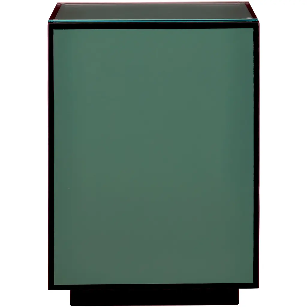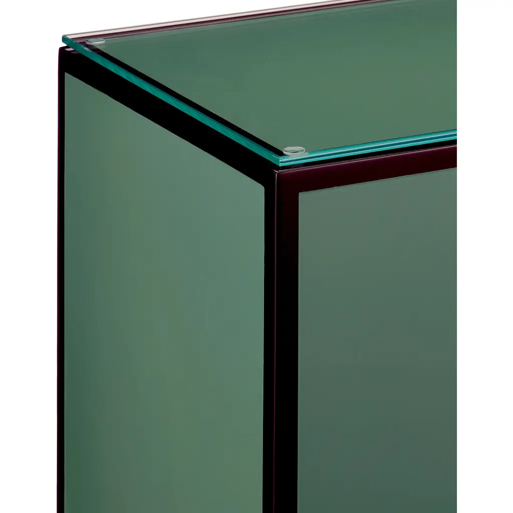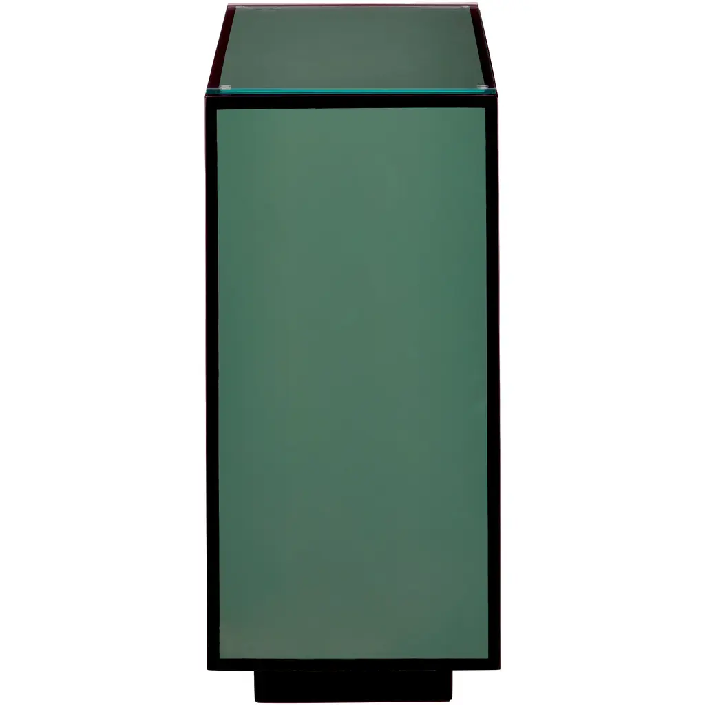 Nothing beats the sheen of lacquer where decorative elements are concerned, as is evident in the sleek surfaces of the Green Lacquer Side Table. Made of wood, the accent table has been covered in the time-honored lacquer process. The luxe green surfaces are rimmed in rich black, and the top is fitted with a square of tempered glass. The plinth base is a design feature of note.