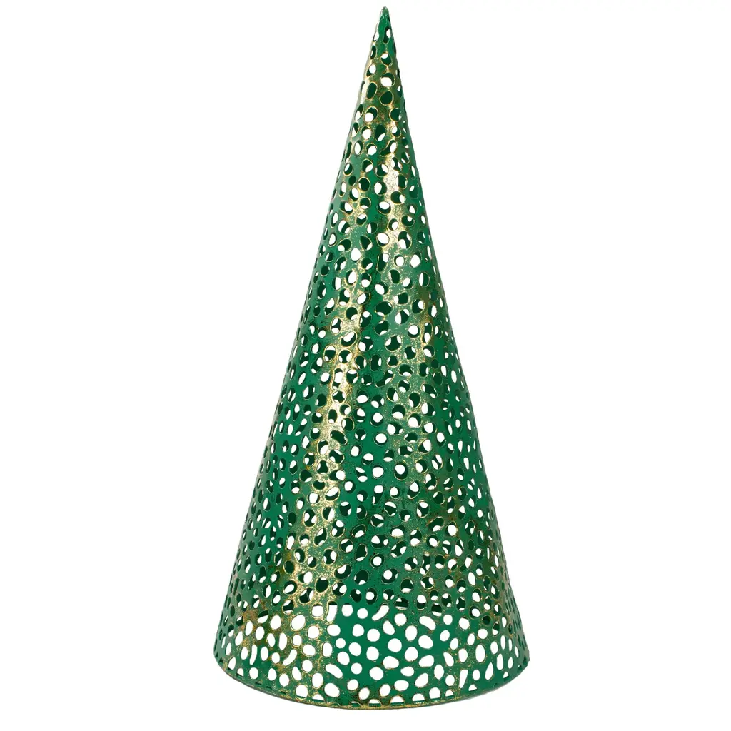 Transform your home into a winter wonderland with this set of metal cone trees that will bring festive cheer. These trees would be perfect to place on your mantel or an end table this holiday season. Features: Christmas tabletop decor A set of 3 different sized tabletop trees Features a decorative cut out design Trees are colored green and gold with a rustic accent The trees are shaped like a cone For indoor use only Dimensions: Small tree: 10" high x 5" diameter Medium tree: 12" high x 5.5" diameter Large tree: 16" high x 8" diameter Materials: metal