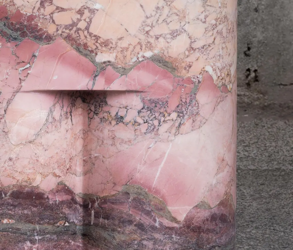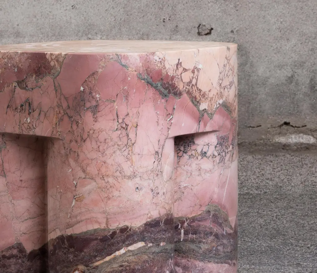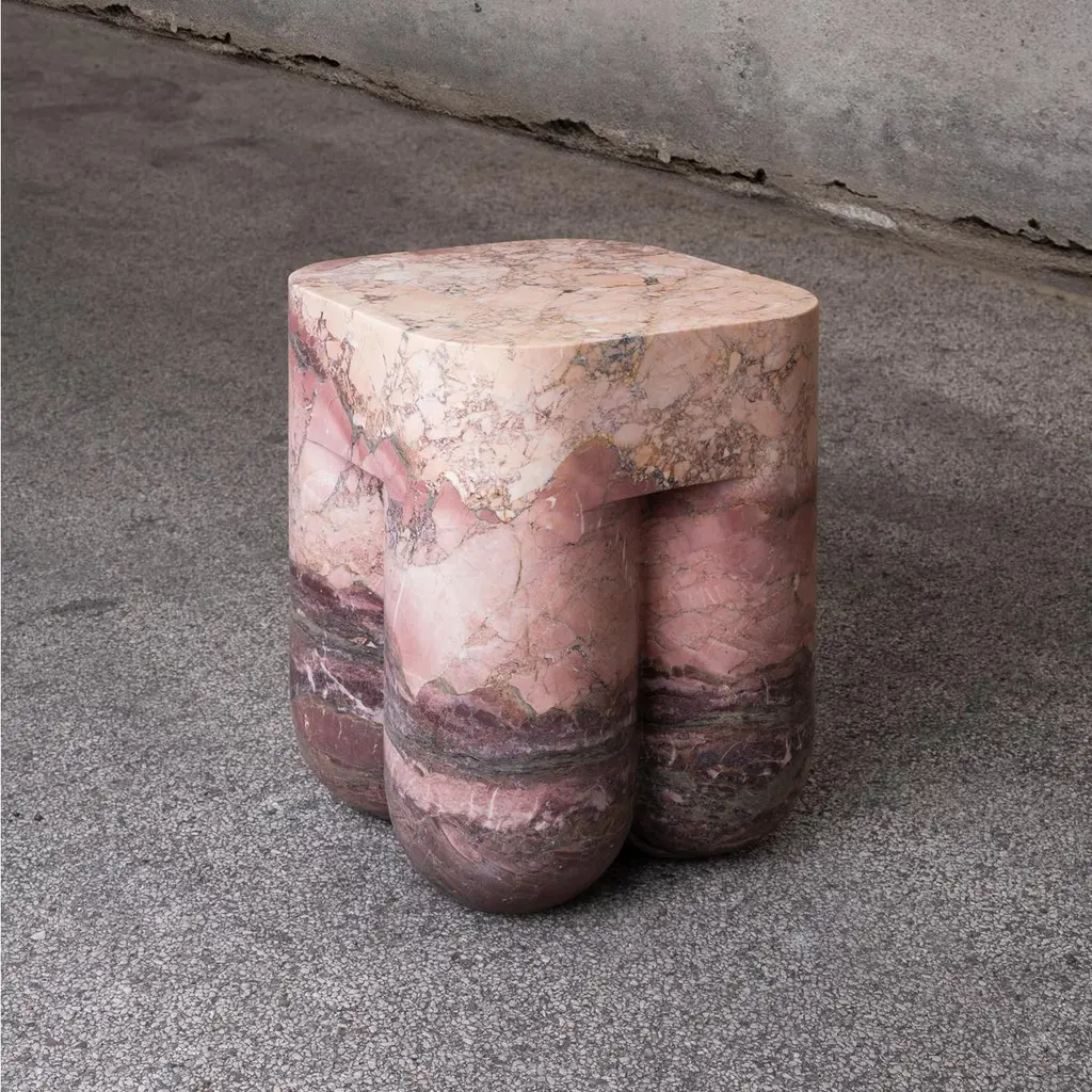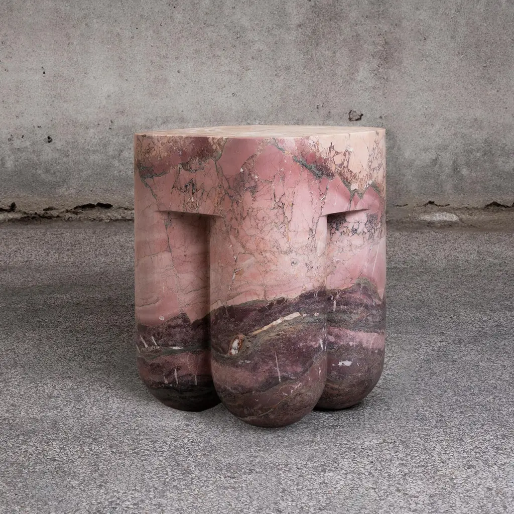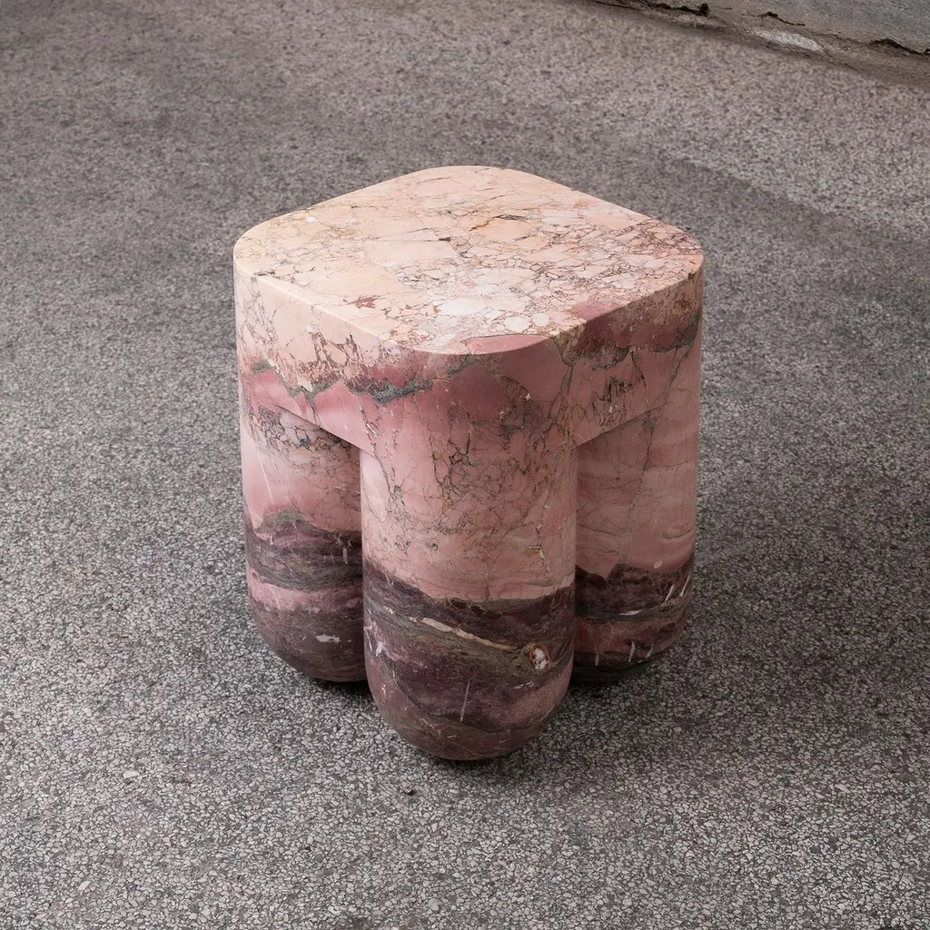Chunky AQ stool and side table is a Limited Edition design collectible, skillfully carved from a single block of Breccia Medicea dell' Acquasanta. With its extraordinary color variations and layers, Chunky AQ tells the story of one of the rarest stones and oldest (2M of years) inactive quarries of the Apuan Alps (Italy).Produced only in a limited series, each Chunky AQ is shaped from rare rocks excavated 40 years ago and carefully selected in the quarry. The extraordinary color stratification and bold veining make this table unique and unrepeatable. Chunky AQ is 100% crafted in Italy in a limited series of 7.