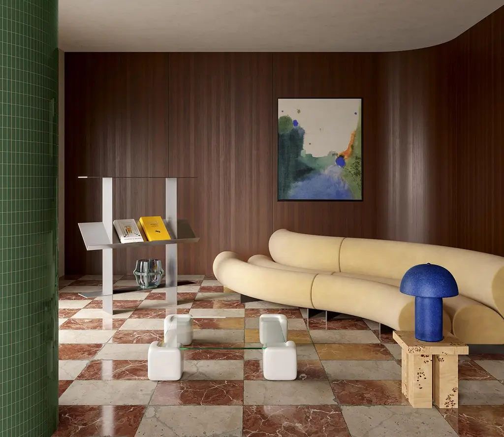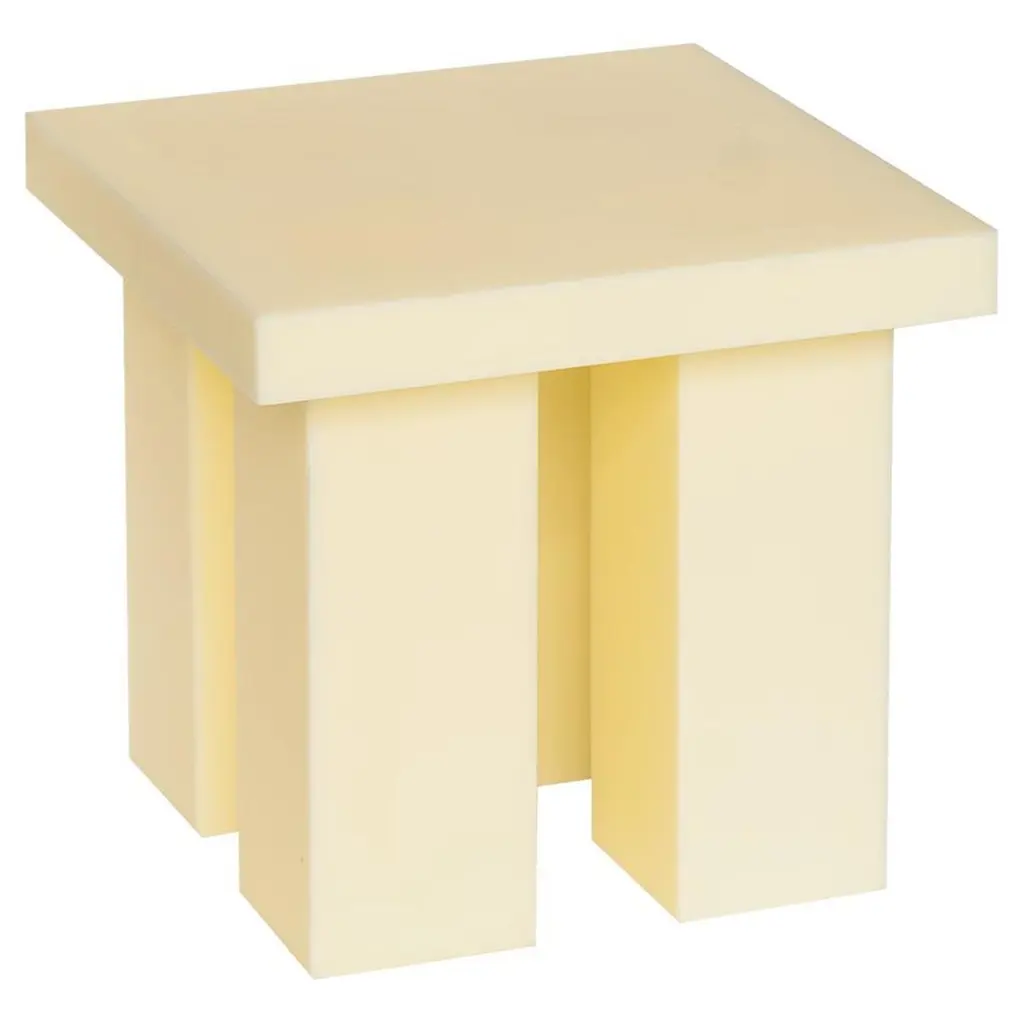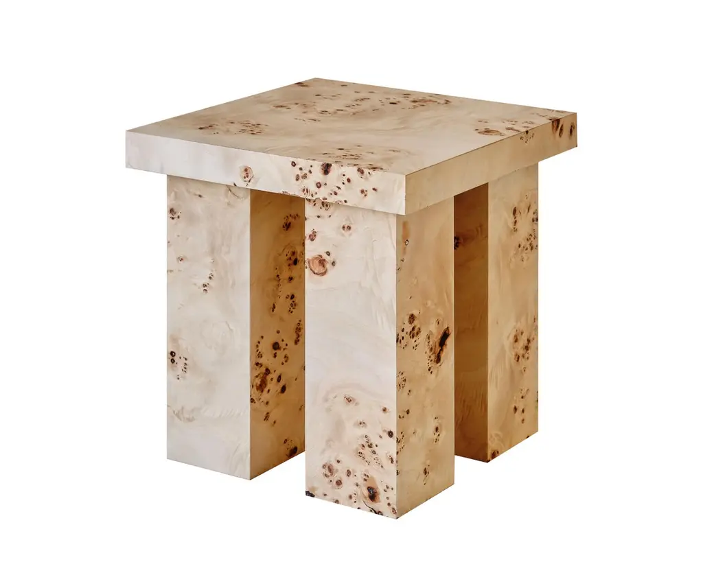 The Miter is an elemental side table that evokes mass and stability. It's available in yellow resin, raw aluminum, or burl wood, with all three versions constructed by connecting sheet materials using a miter joint.